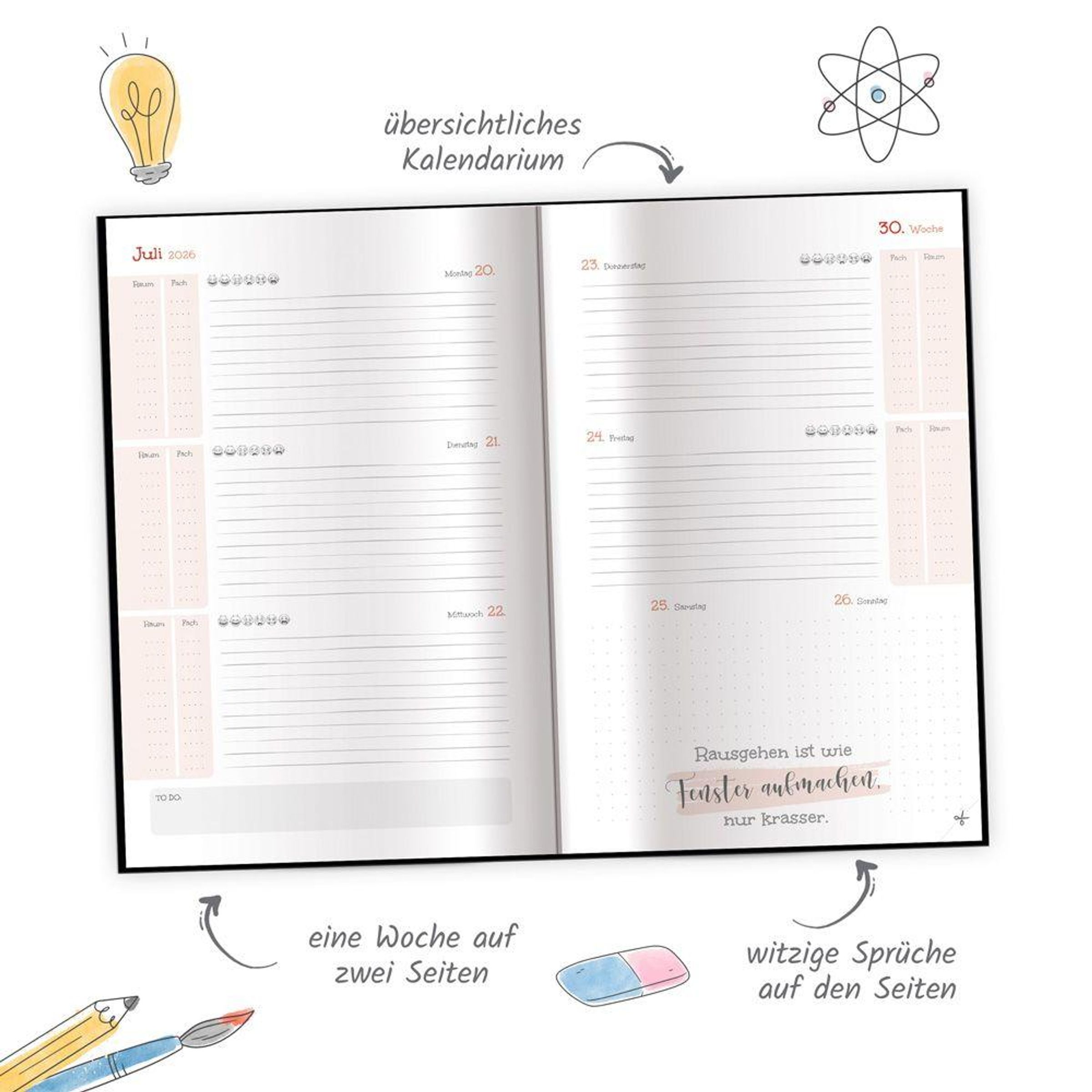Dieser Kalender mit witzigem Motiv mit Glanz-Effekt und Prägung ist dein treuer Begleiter für das Schuljahr 2026 / 27. Er ist ca. 13 x 20 cm groß und bietet auf 128 Seiten genügend Platz für wichtige Notizen und Termine. Für Stundenpläne, Noten, Schulferien, Adressen, Geburtstage usw. gibt es Extra-Seiten. Mit Stickern für eine individuelle Gestaltung.