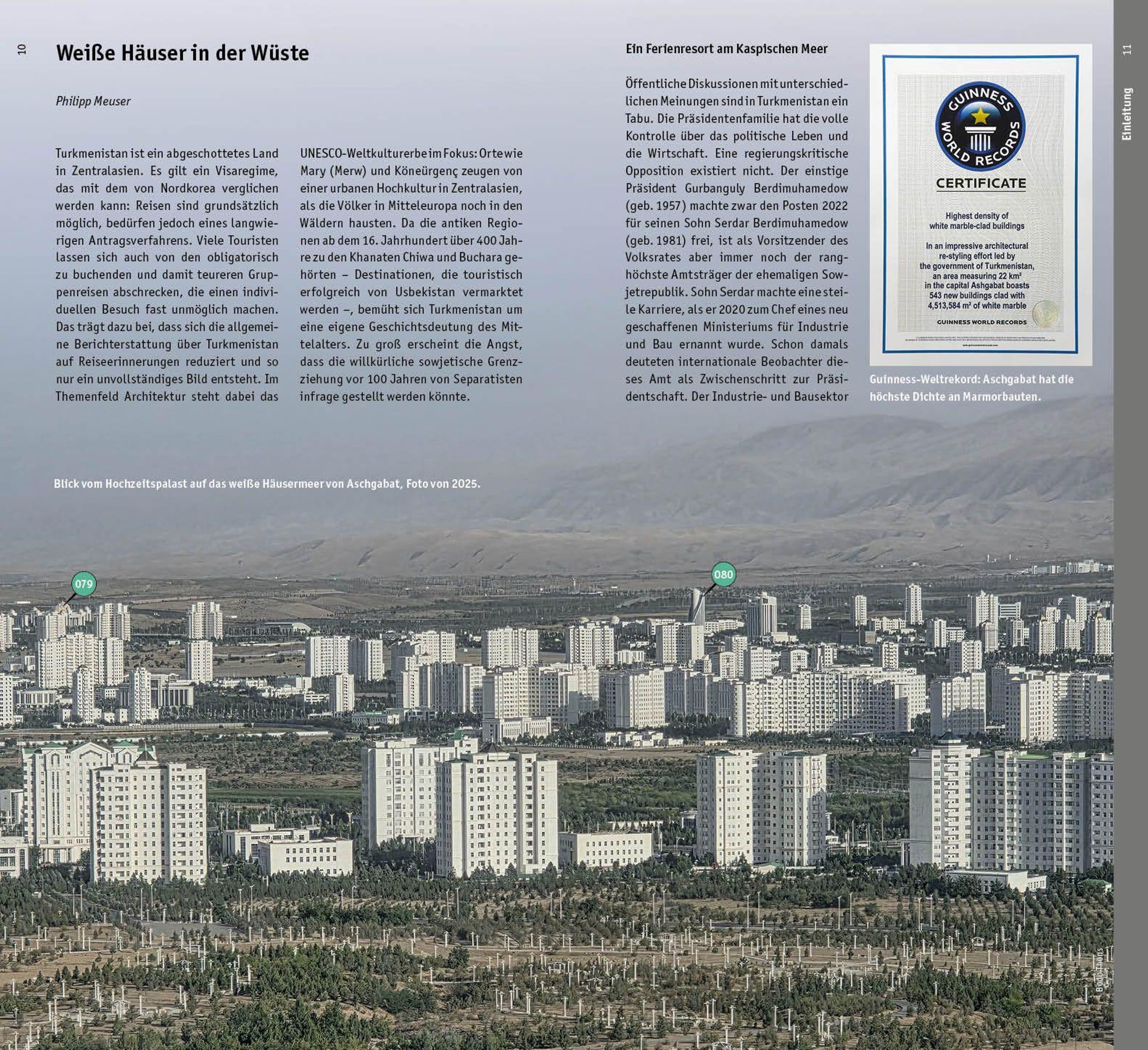Dieser Band führt in einen Staat, der seine Städtemit Palästen aus weißem Marmor überzieht, während ein großer Teil der Bevölkerung in sozial prekären Verhältnissen lebt. Die gebaute Umwelt ist zum Instrument der Macht geworden: Regierungsbauten, Monumente, Hotels und repräsentative Boulevards inszenieren den Glanz der Autokratie, während Alltagsarchitektur, traditionelle Bauweisen und die Lebensrealität abseits der Prunkfassaden im Schatten bleiben. Der Architekturführer erschließt nicht nur Monumentalbauten in Aschgabat, Arkadag und Awaza, sondern dokumentiert ebenso sowjetische Wohnsiedlungen, archäologische Stätten an der Seidenstraße (Nisa, Merw, Köneürgenç) und Reste einer vormodernen Baukultur. So entsteht ein facettenreiches Panorama, das den Widerspruch zwischen kulturellem Erbe und gegenwärtiger Repräsentationsarchitektur sichtbar macht. Dieses Buch ist mehr als ein klassischer Architekturführer: Es ist zugleich ein politisches Buch. Es wirft einen kritischen Blick auf das Verhältnis von Architektur, Macht und Propaganda in einem weitgehend abgeschotteten Staat. Wer Turkmenistan durch seine Architektur verstehen will, muss auch die Mechanismen einer Gesellschaft lesen lernen, in der Bauen nicht nur städtebauliche, sondern immer auch ideologische Bedeutung hat.