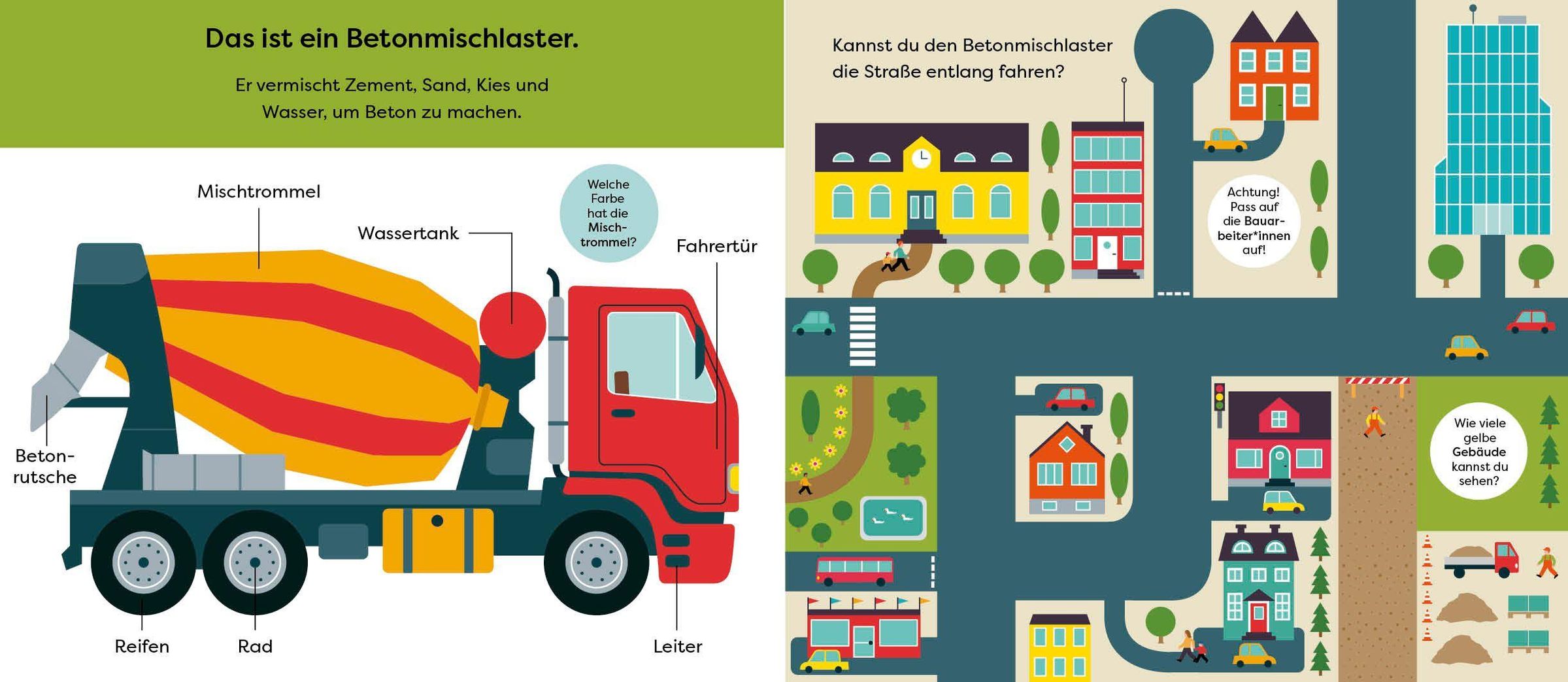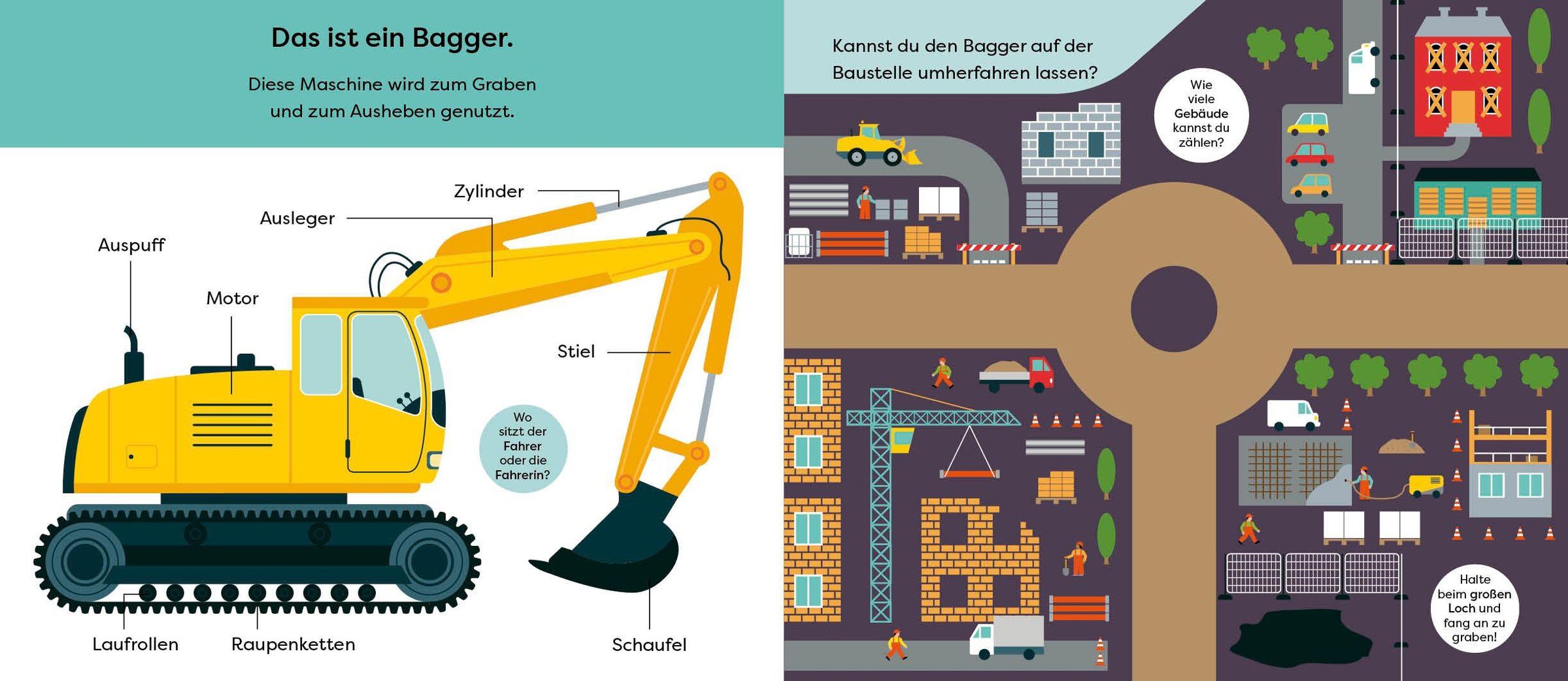Dieses Pappbilderbuch lässt kleine Fahrzeugfans ab 18 Monaten Bagger, Kipplaster, Betonmischlaster und Co. selbst über die Seiten schieben und die Baustelle erkunden. Dabei werden spielerisch Feinmotorik und Koordinationgefördert. Kleine Fragen auf jeder Seite regen zusätzlich zum Entdecken von Stadt und Land an.