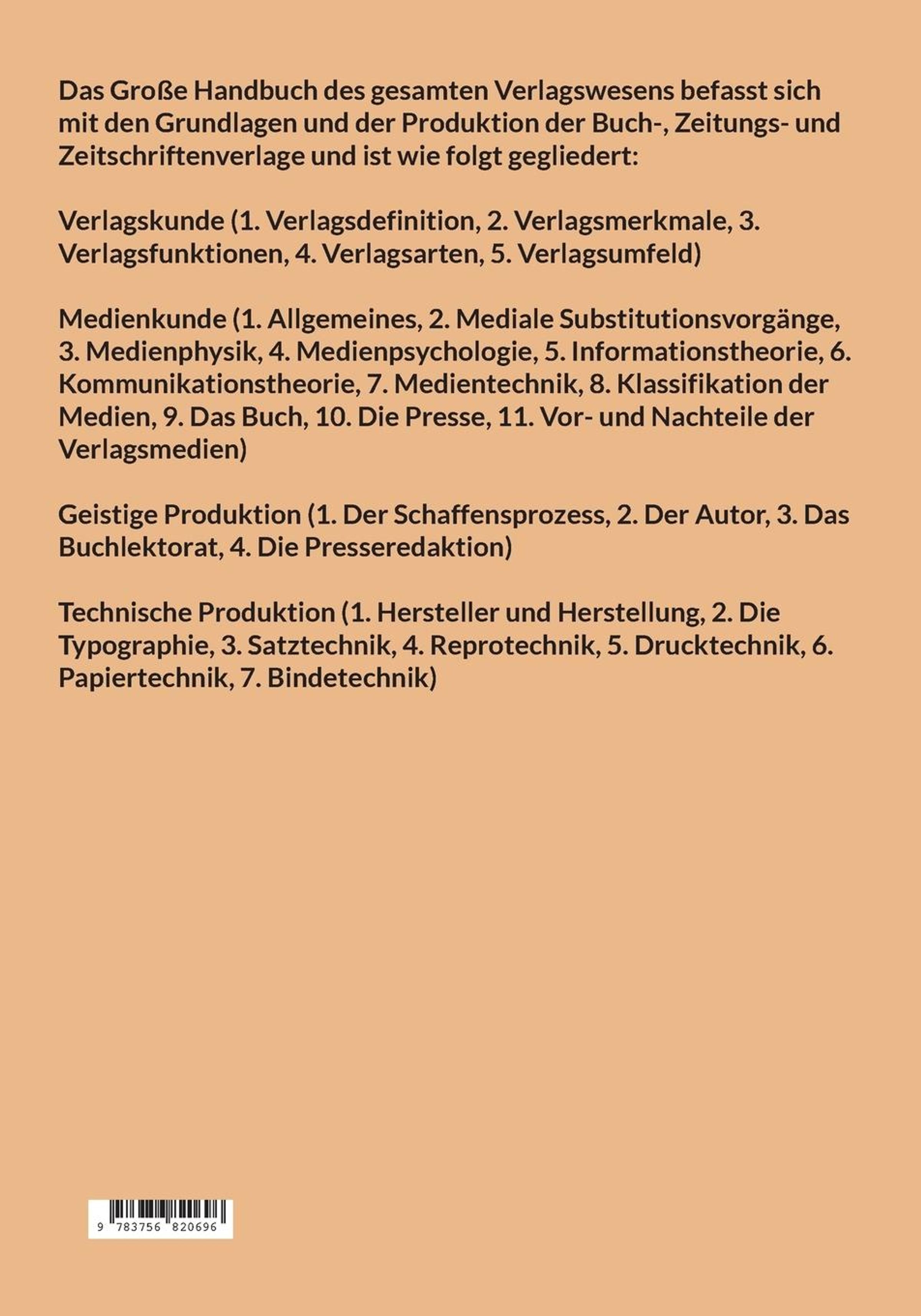 Das Große Handbuch des gesamten Verlagswesens befasst sich mit den Grundlagen und der Produktion der Buch-, Zeitungs- und Zeitschriftenverlage und ist wie folgt gegliedert: