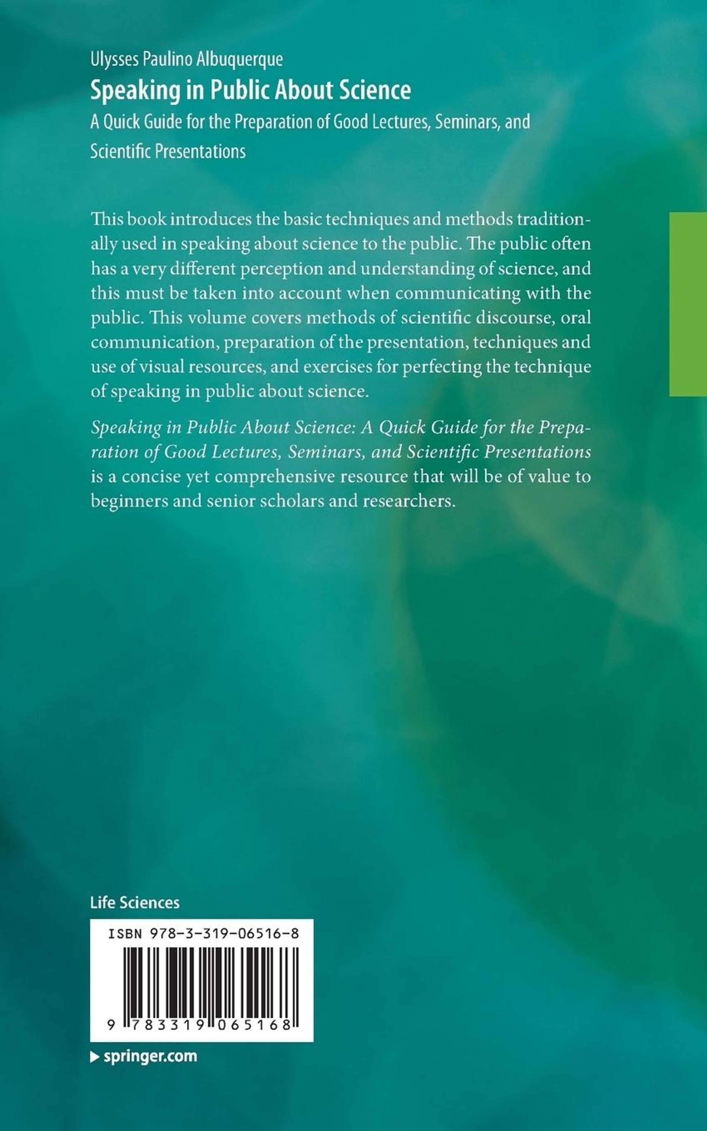 This book introduces the basic techniques and methods traditionally used in speaking about science to the public. The public often has a very different perception and understanding of science, and this must be taken into account when communicating with the public. This volume covers methods of scientific discourse, oral communication, preparation of the presentation, techniques and use of visual resources, and exercises for perfecting the technique of speaking in public about science. Speaking in Public About Science: A Quick Guide for the Preparation of Good Lectures, Seminars, and Scientific Presentations is a concise yet comprehensive resource that will be of value to beginners and senior scholars and researchers.