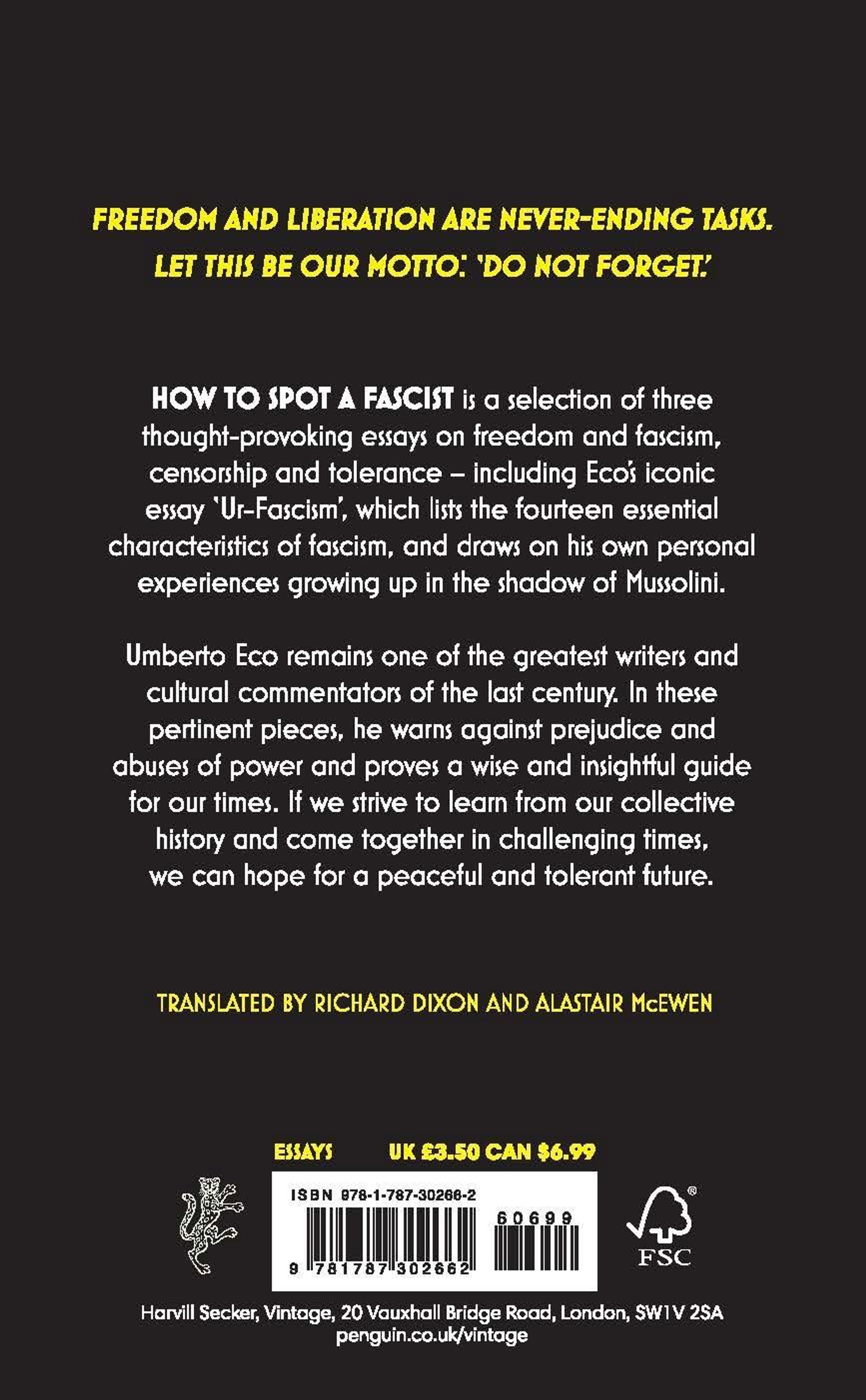 HOW TO SPOT A FASCIST is a selection of three thought-provoking essays on freedom and fascism, censorship and tolerance - including Eco's iconic essay 'Ur-Fascism', which lists the fourteen essential characteristics of fascism, and draws on his own personal experiences growing up in the shadow of Mussolini.