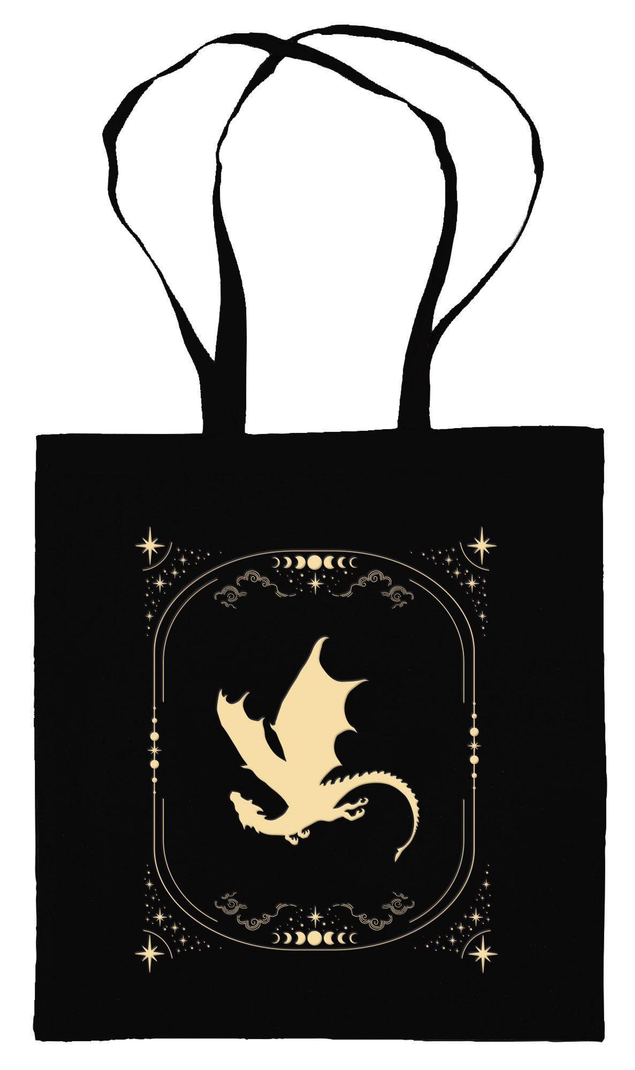 Stilisiertes Drachenmotiv auf schwarzem Hintergrund, umrahmt von Mondphasen und dekorativen Elementen auf Stofftasche., Diverse