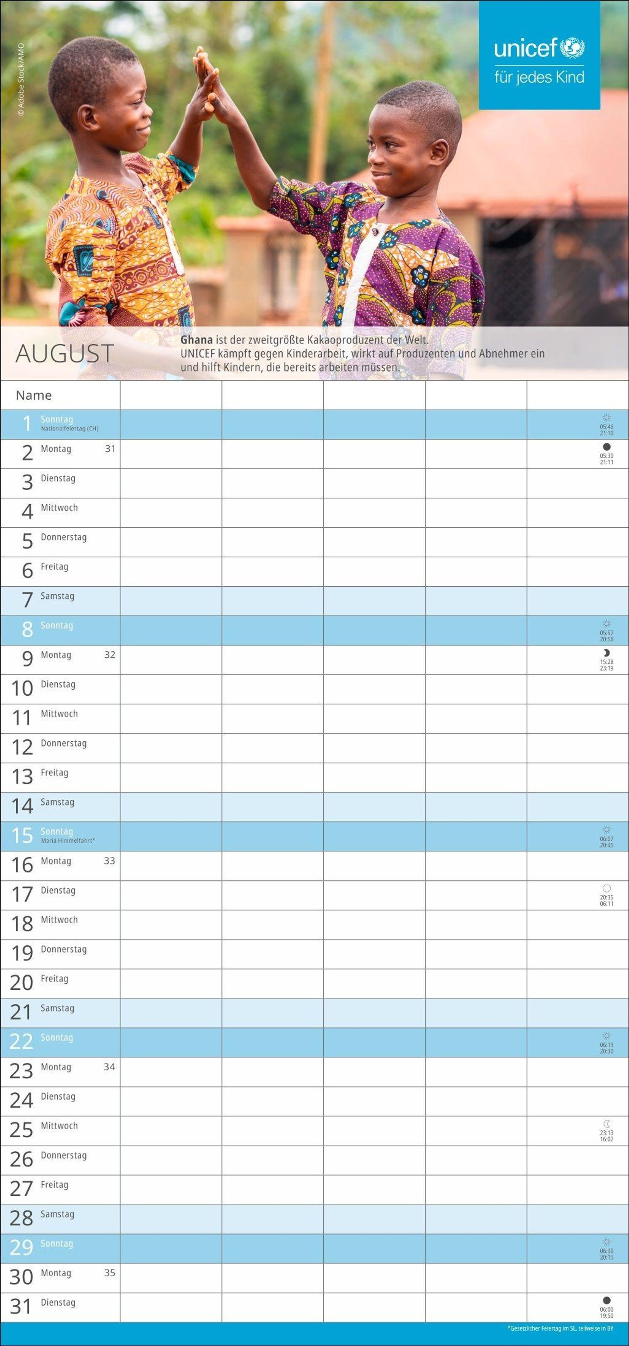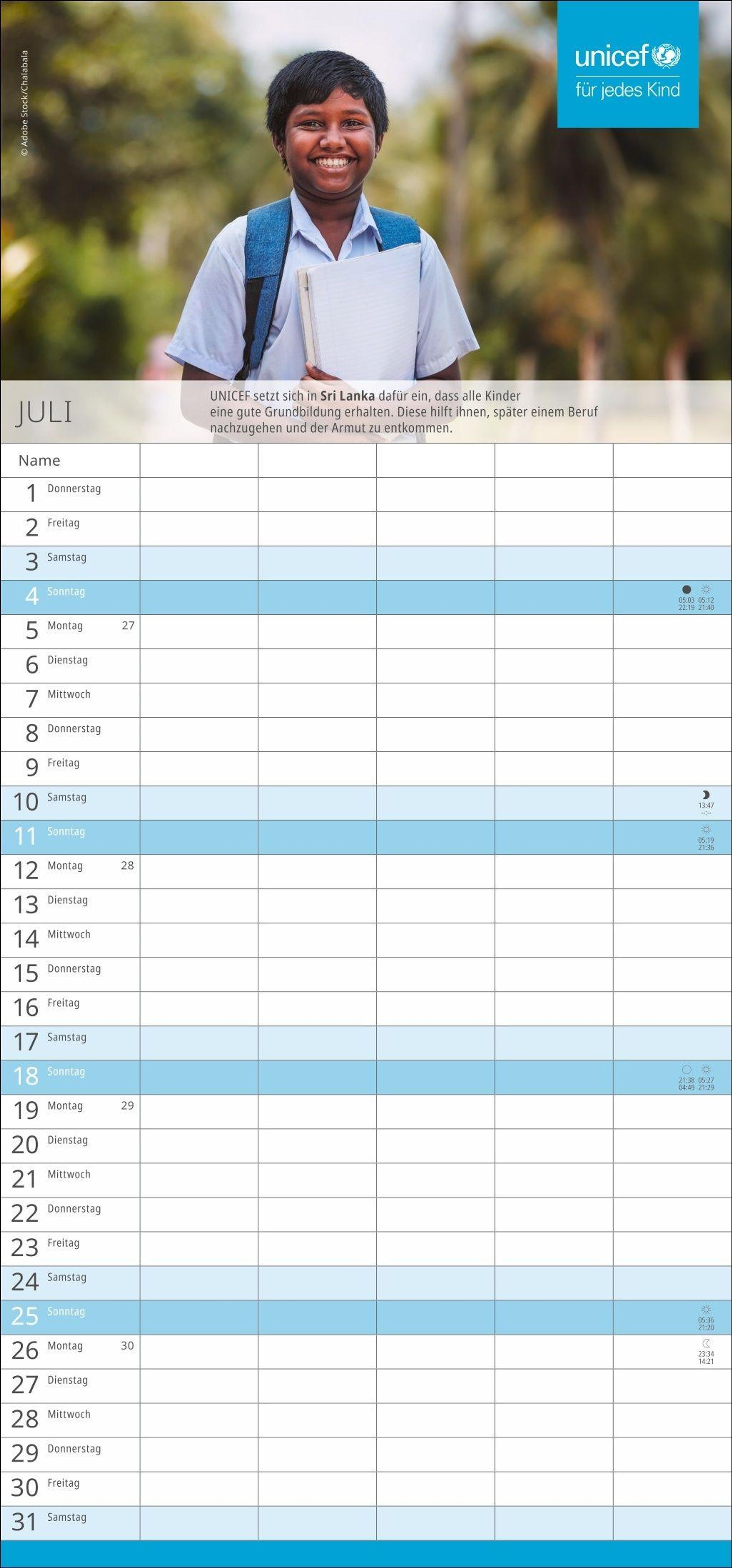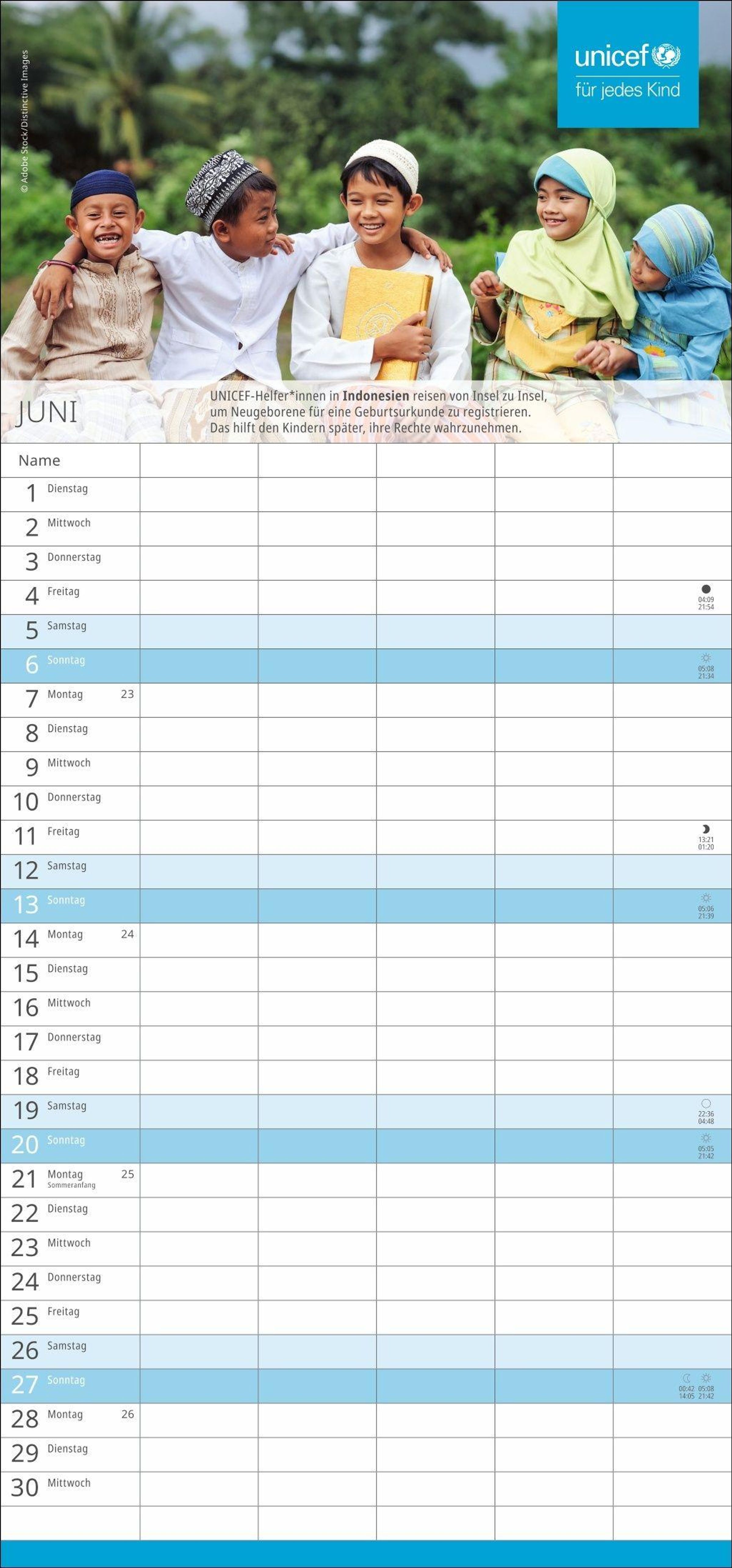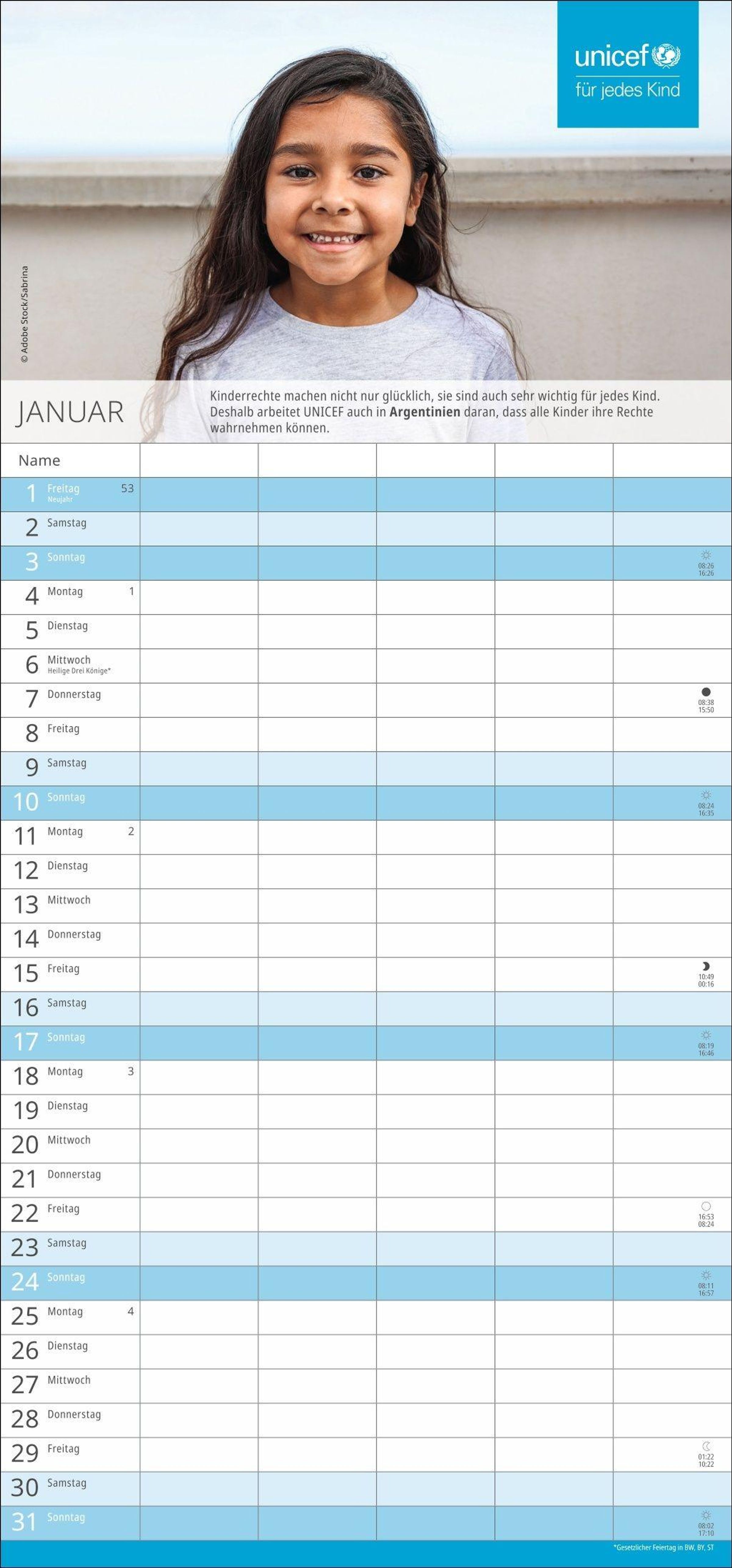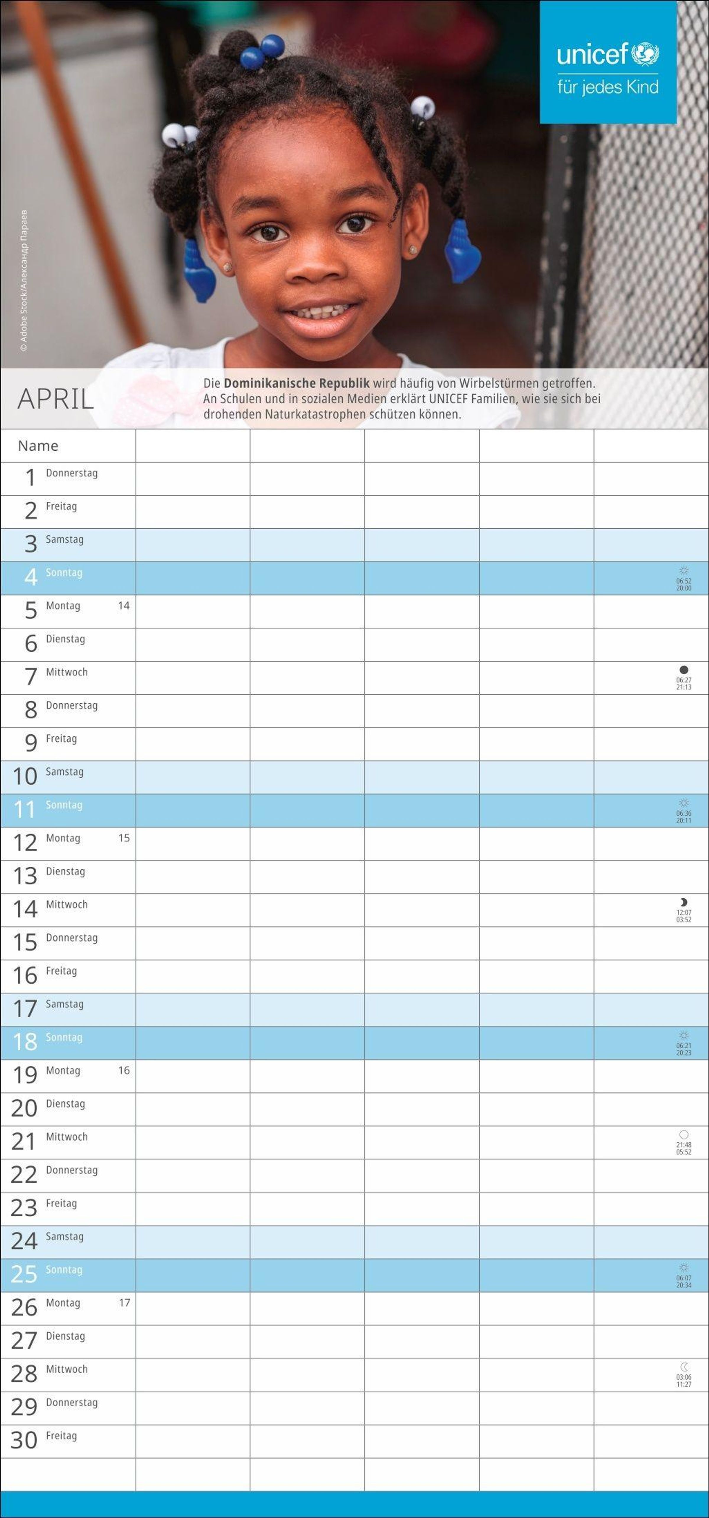Die nützliche Organisationshilfe, um Licht im Termin-Dschungel zu schaffen: Der fünfspaltige Familienkalender des Kinderhilfswerks der Vereinten Nationen