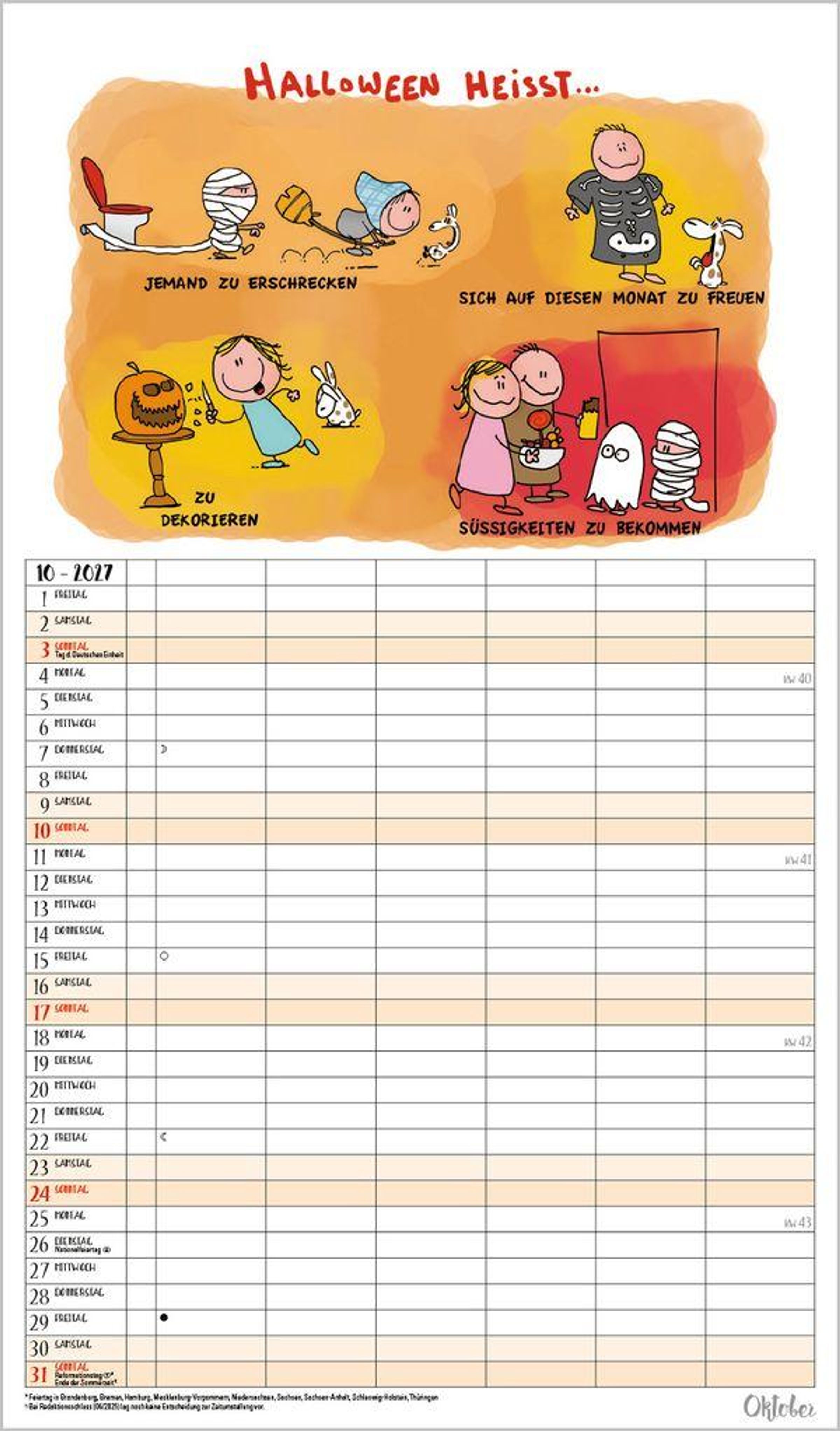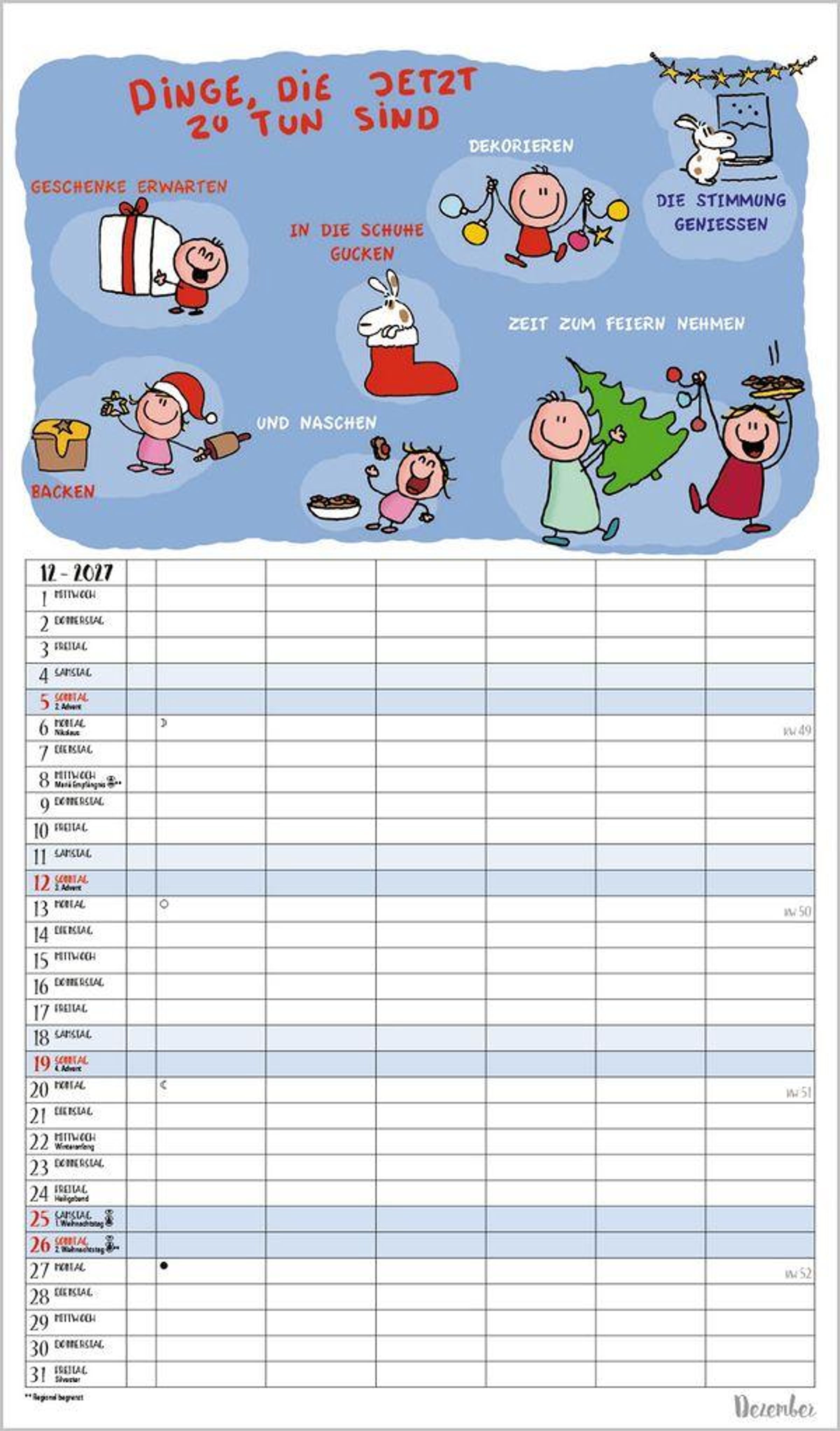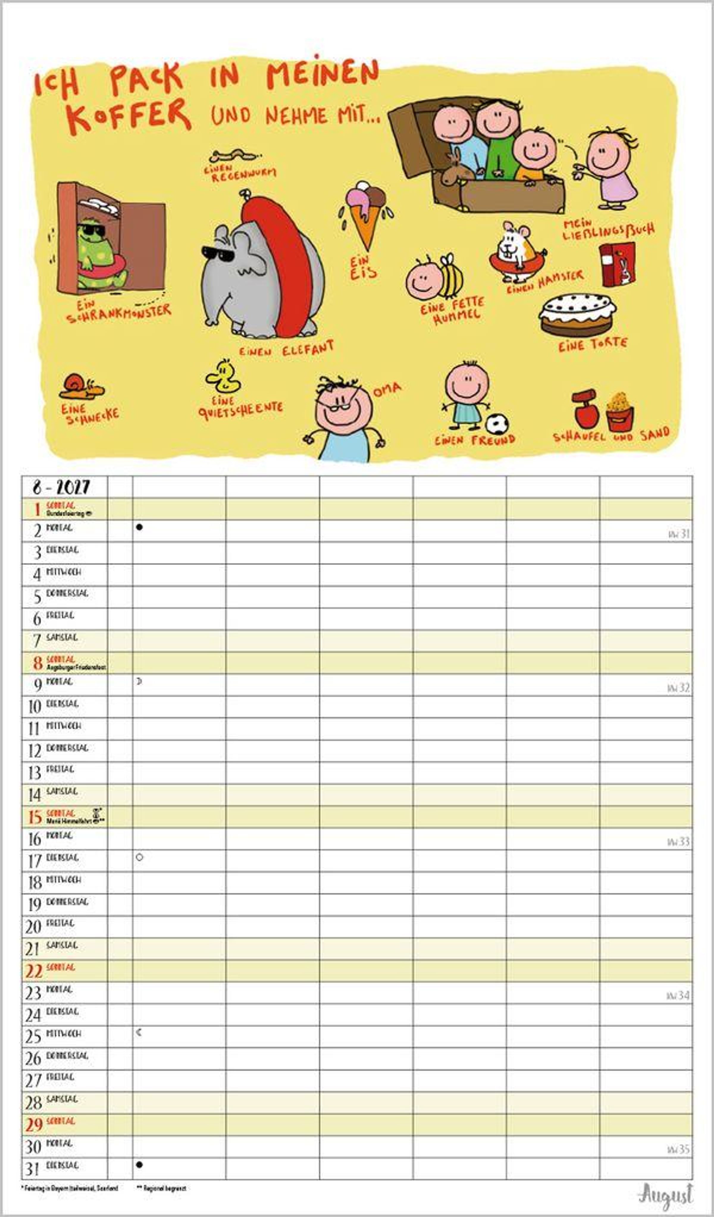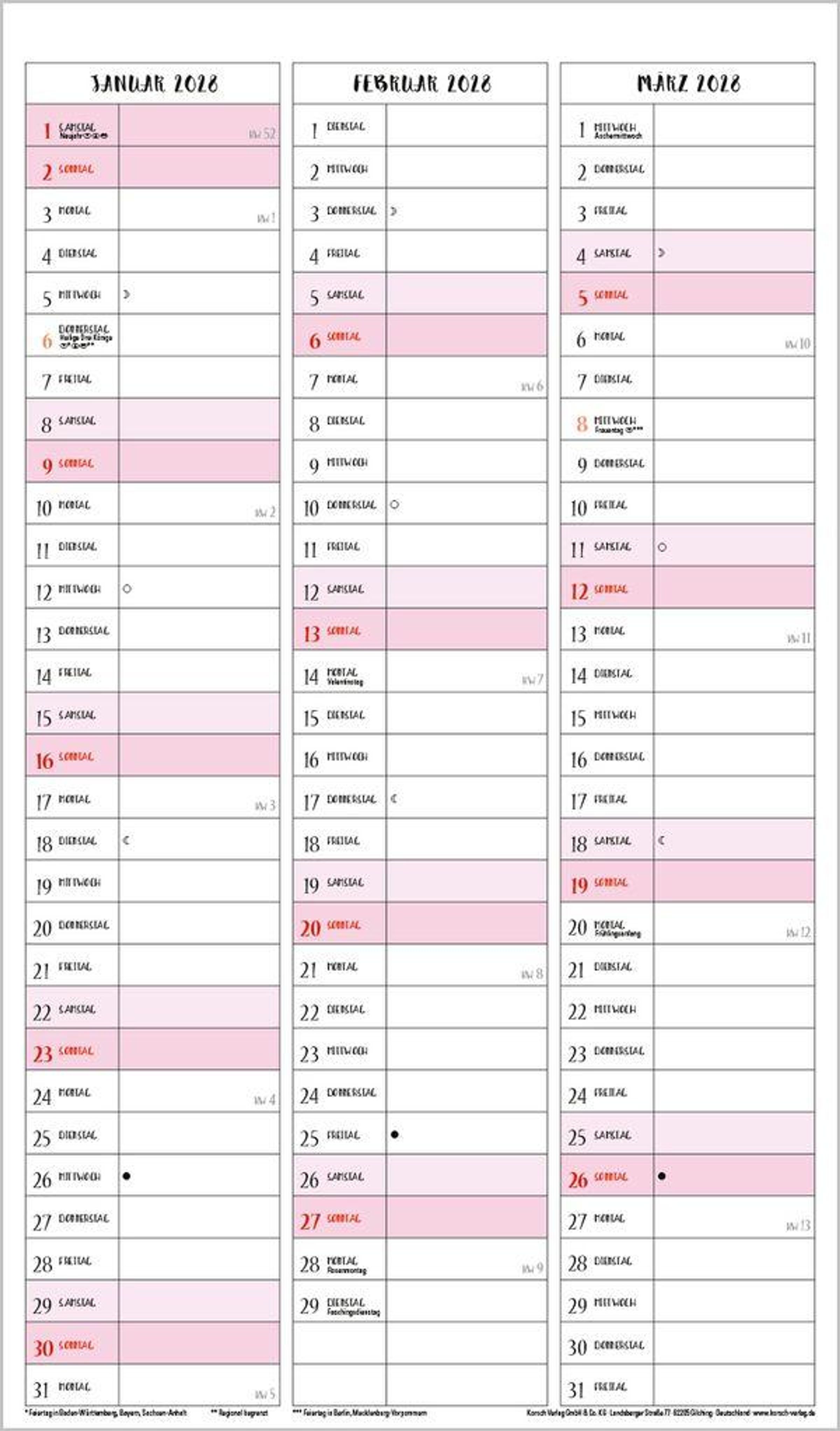 Weitere Informationen wie Mondphasen , Ferientermine und Feiertage (auch regionale) sowie deutlich lesbare Kalenderwochen runden den Kalender ab und sorgen für einen vollständigen Überblick Ihres Jahres.