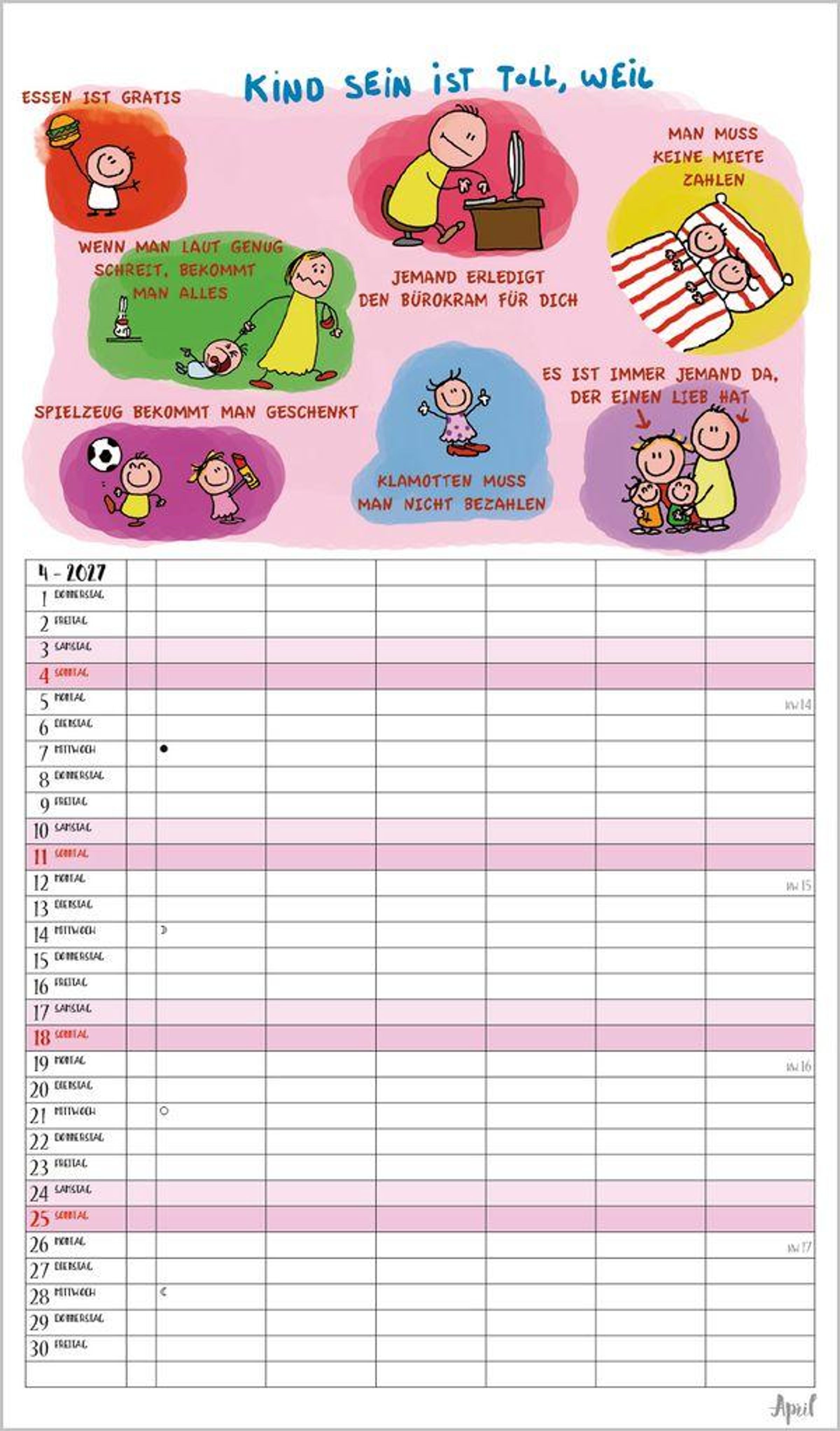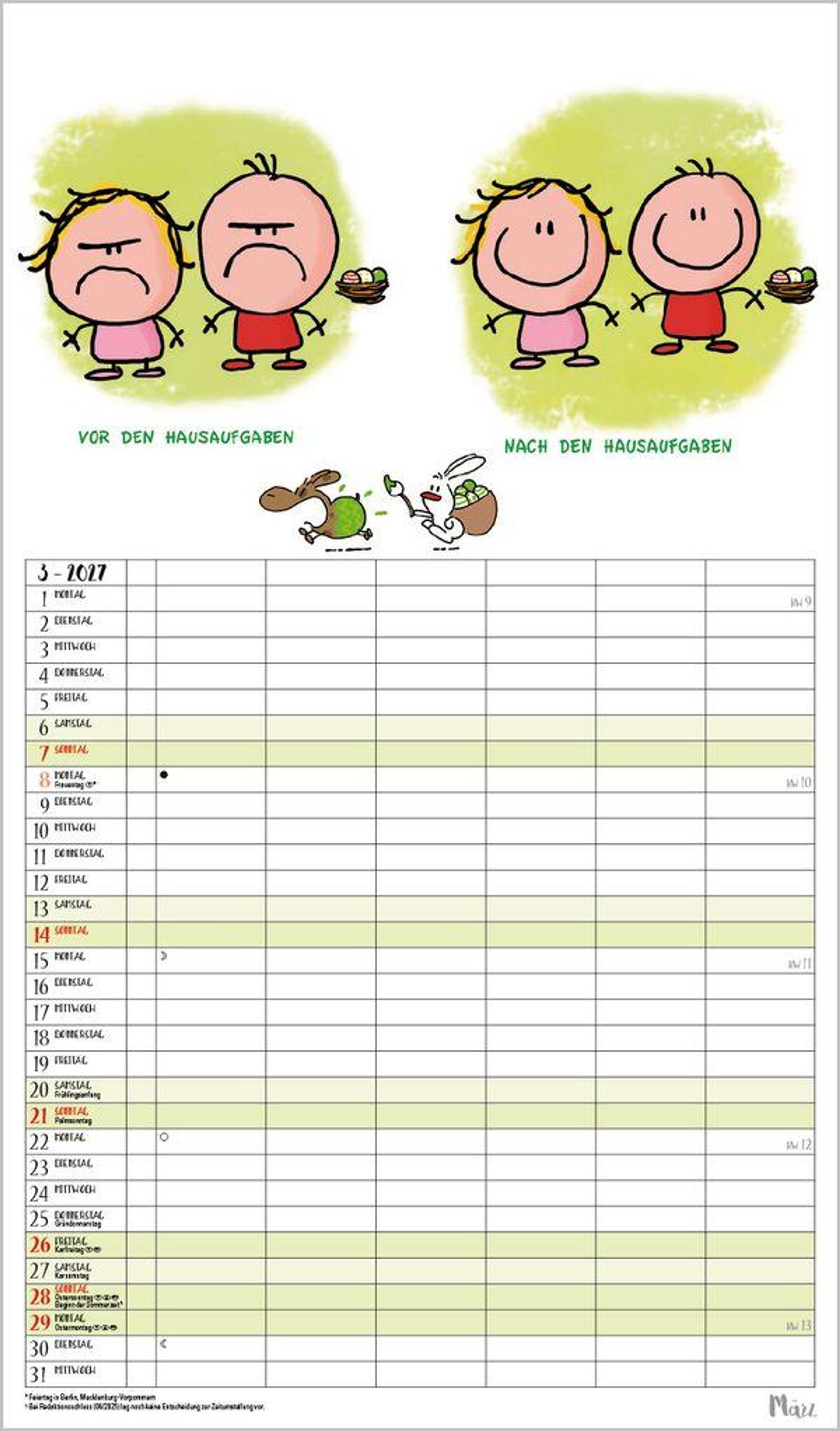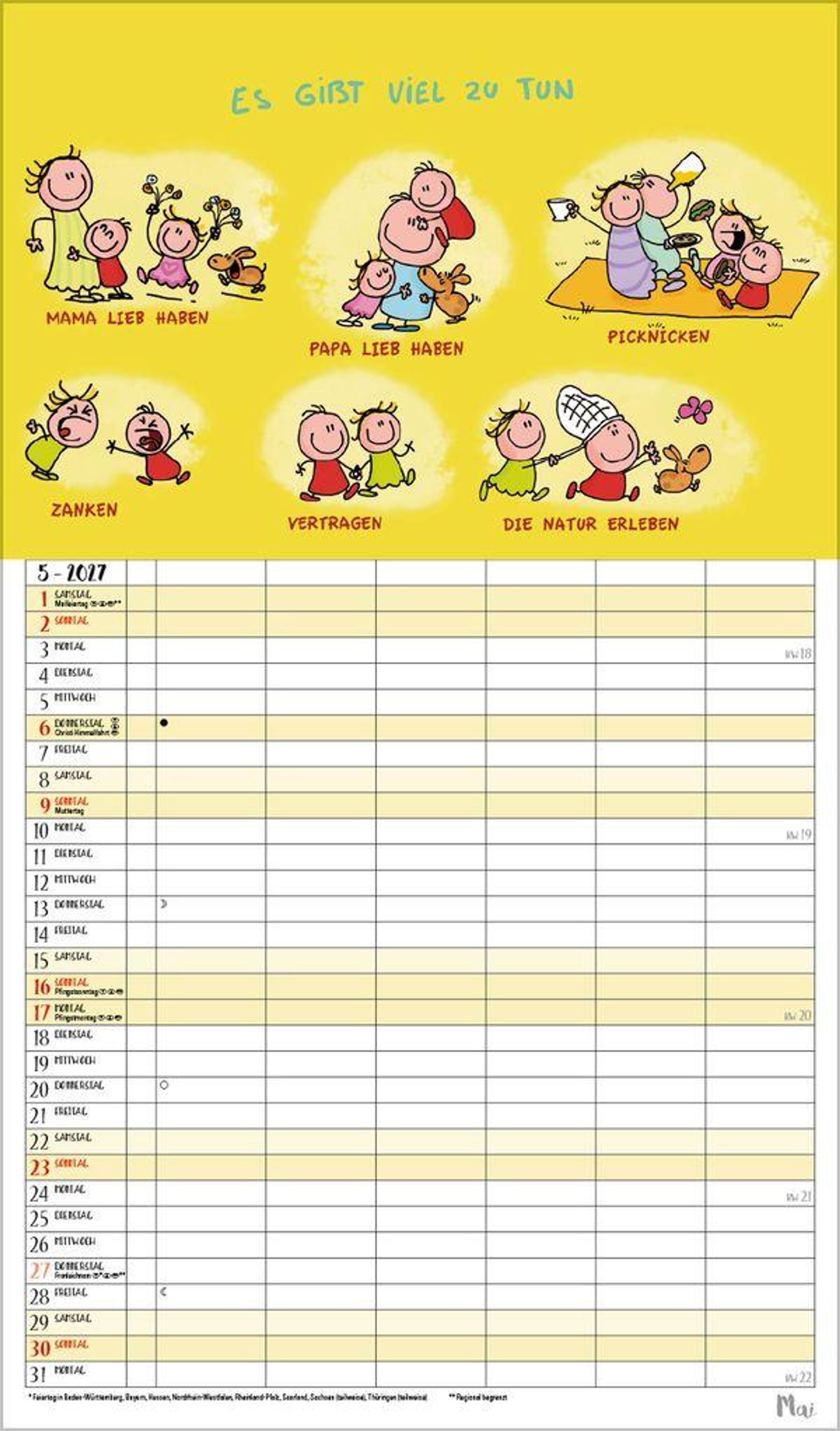 6 Spalten zum Eintragen bringen sogar die Terminplanung von Großfamilien übersichtlich auf eine Seite. Bei den witzigen Cartoons, die typische Familiensituationen zeigen, freut man sich jeden Monat schon aufs nächste Blatt. Neben dem gesamten Kalenderjahr enthält der Wandplaner auch eine Vorschau März des Folgejahres.
