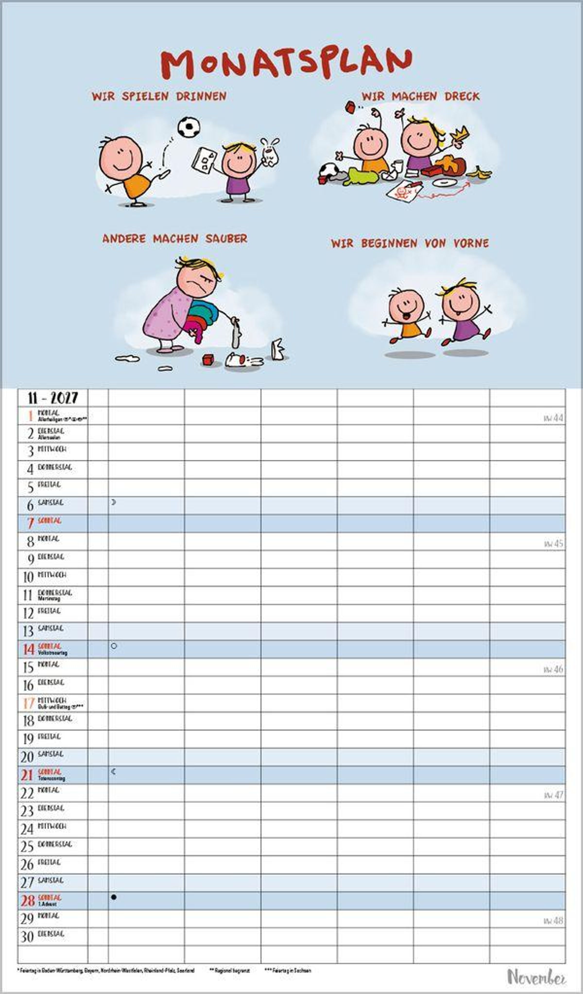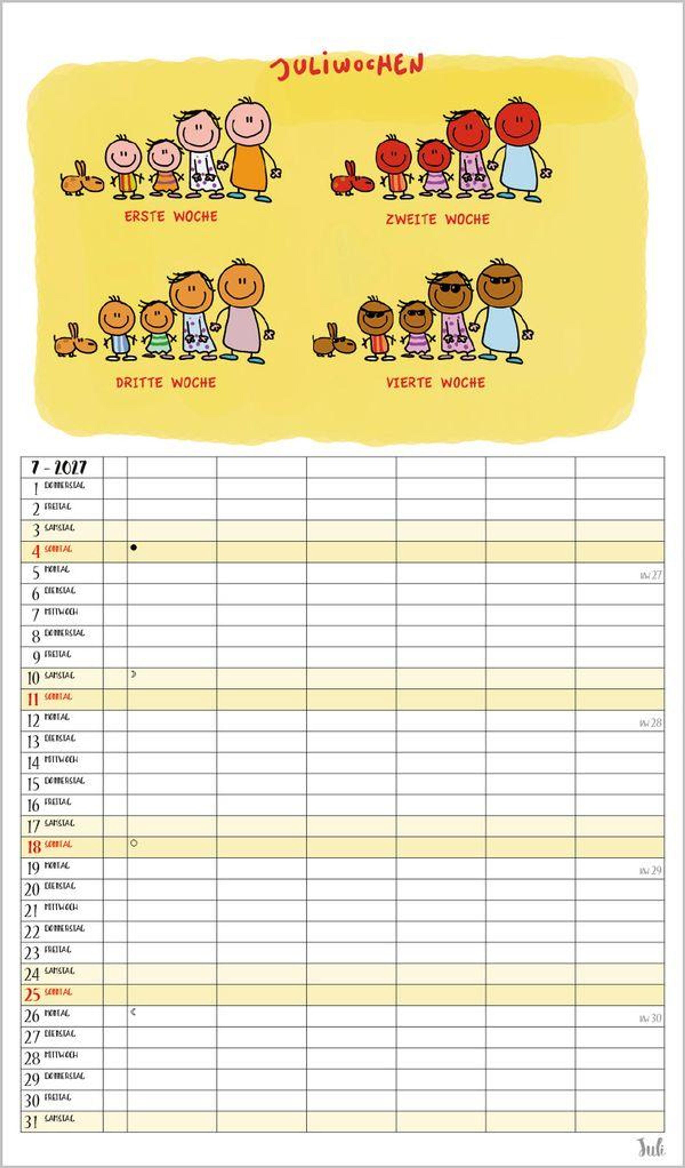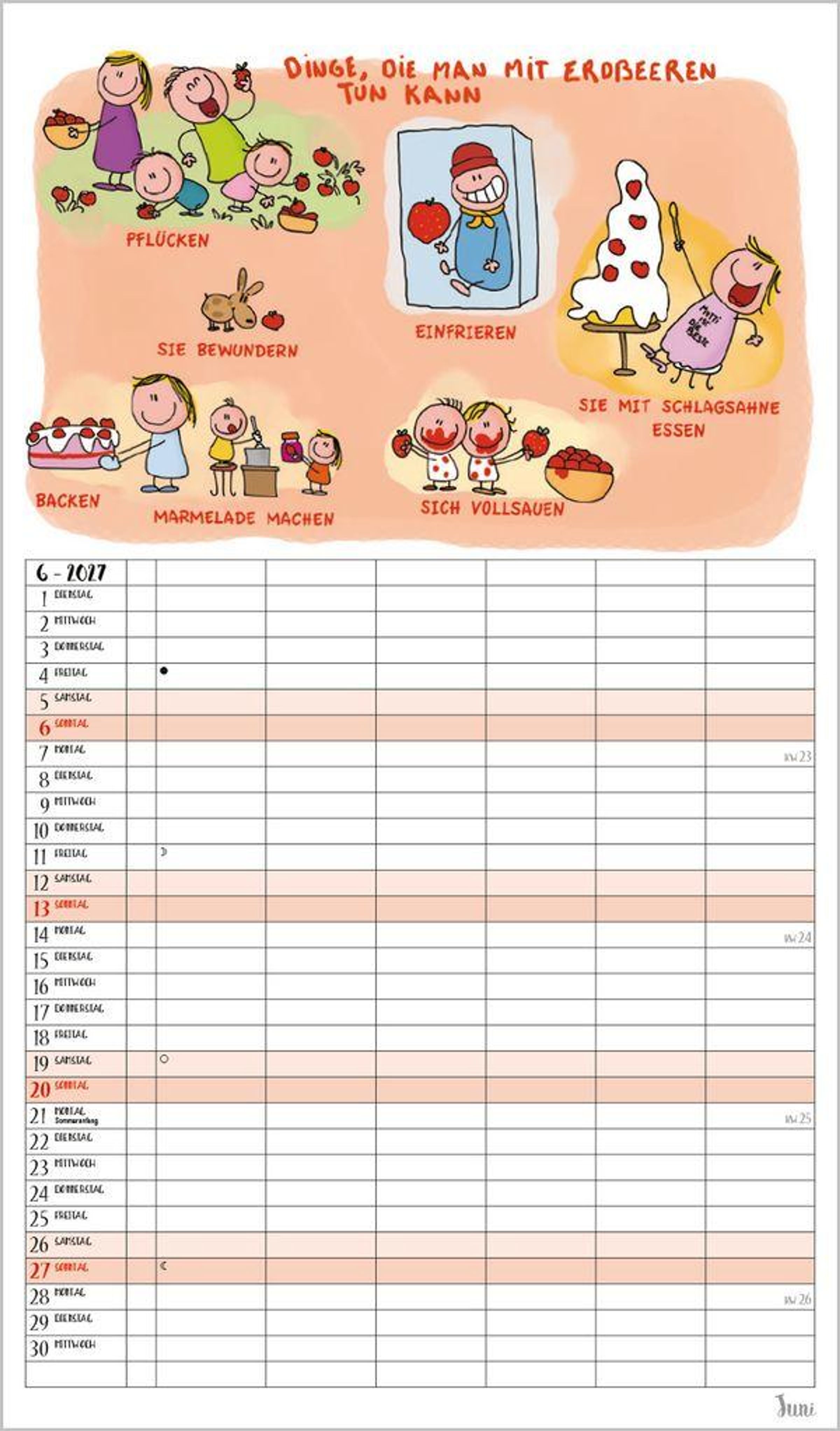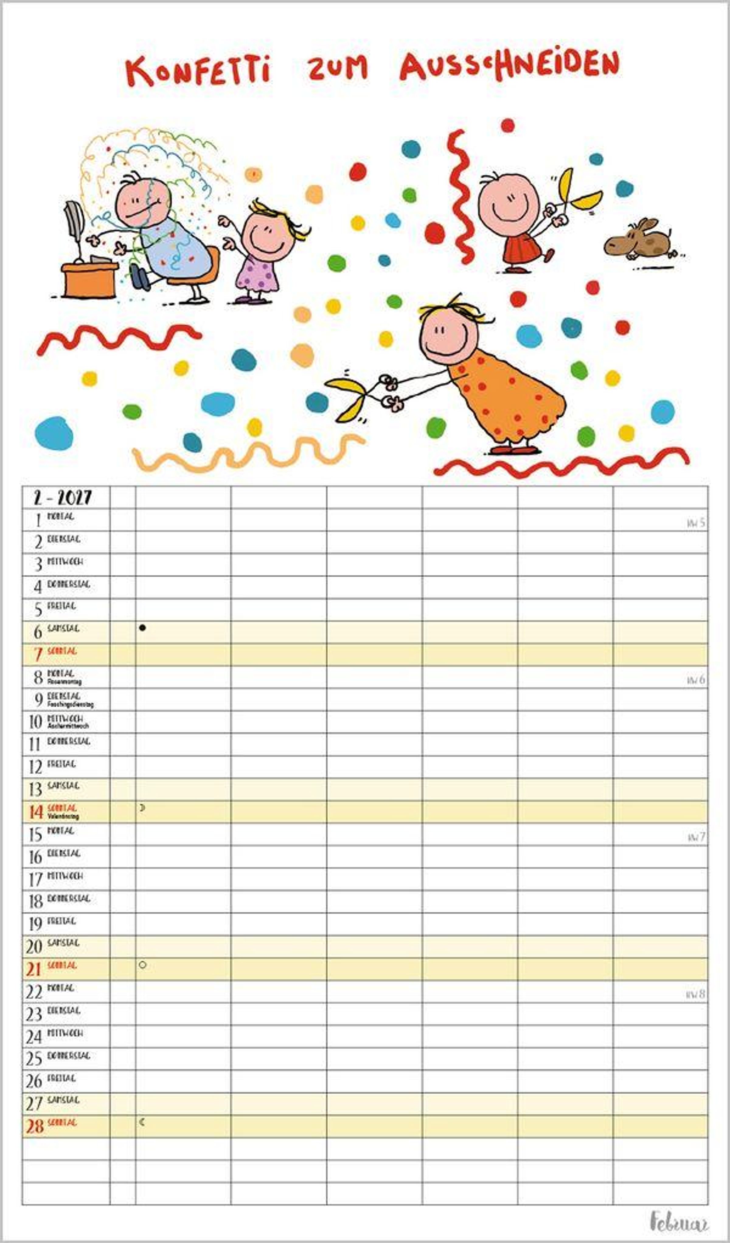6 Spalten zum Eintragen bringen sogar die Terminplanung von Großfamilien übersichtlich auf eine Seite. Bei den witzigen Cartoons, die typische Familiensituationen zeigen, freut man sich jeden Monat schon aufs nächste Blatt. Neben dem gesamten Kalenderjahr enthält der Wandplaner auch eine Vorschau März des Folgejahres.