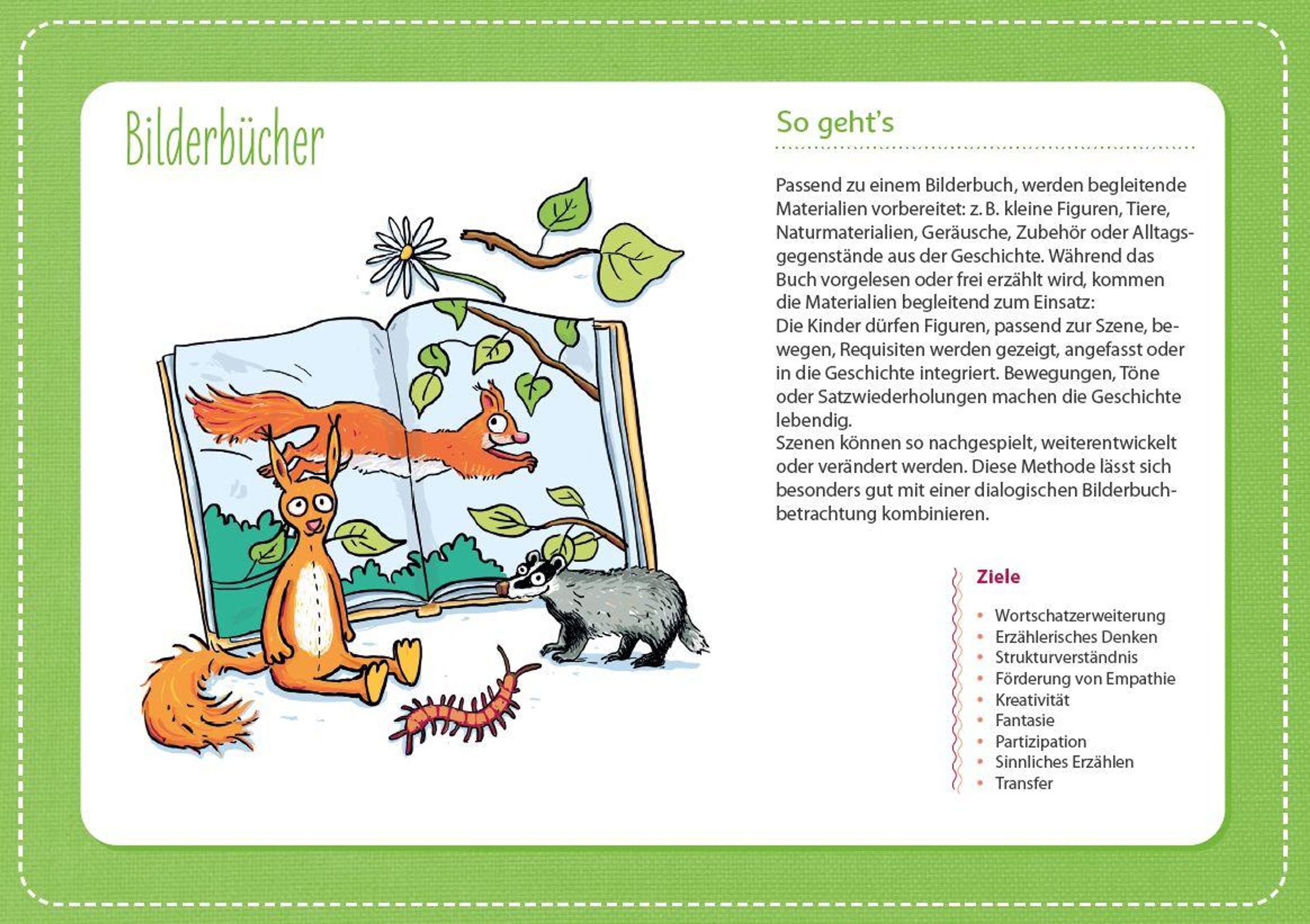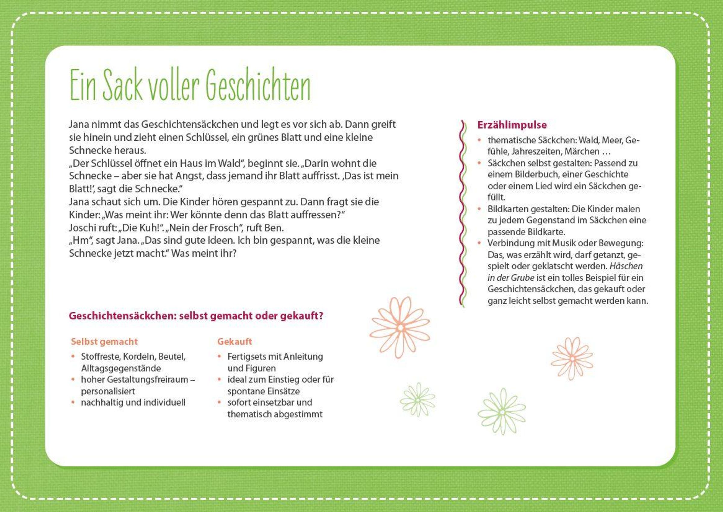 Kinder sind geborene Geschichtenerzähler: innen Dieses Kartenset ist weit mehr als ein Material zur Sprachförderung in der Kita - es ist ein Türöffner für Beziehung, Bildung und Fantasie! Die 32 liebevoll gestalteten Methodenkarten bieten vielfältige, praxiserprobte Erzählideen, die Kinder zum Zuhören, Mitmachen und Weitererzählen anregen. Ob Wickelgeschichten, Beutelgeschichten, Erzählkisten oder Erzählkoffer - die Karten liefern kreative Impulse, die sich ganz einfach in den Kita-Alltag integrieren lassen. Im Morgenkreis, in Kleingruppen oder ganz spontan zwischendurch: Die Erzählkarten laden jederzeit zum gemeinsamen Erleben, Fühlen und Wachsen ein.