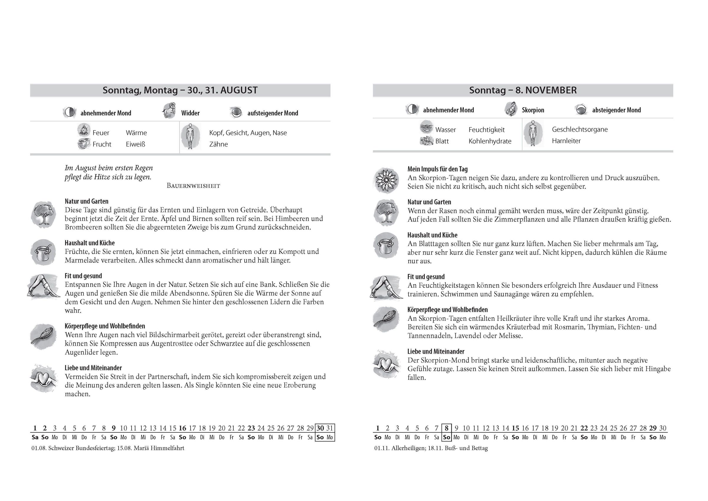 Wie Sie sich jeden Tag von der Mondkraft unterstützen lassen können, zeigt dieser Kalender: Er informiert über die günstigen Tage für Hausarbeiten, Friseurbesuche oder die Pflanzenpflege. Sie erfahren, wie die Gesundheit gestärkt werden kann, in welche Richtung das zwischenmenschliche Klima tendiert, wann eine Wellness-Massage Ihr Wohlbefinden steigert und vieles mehr.