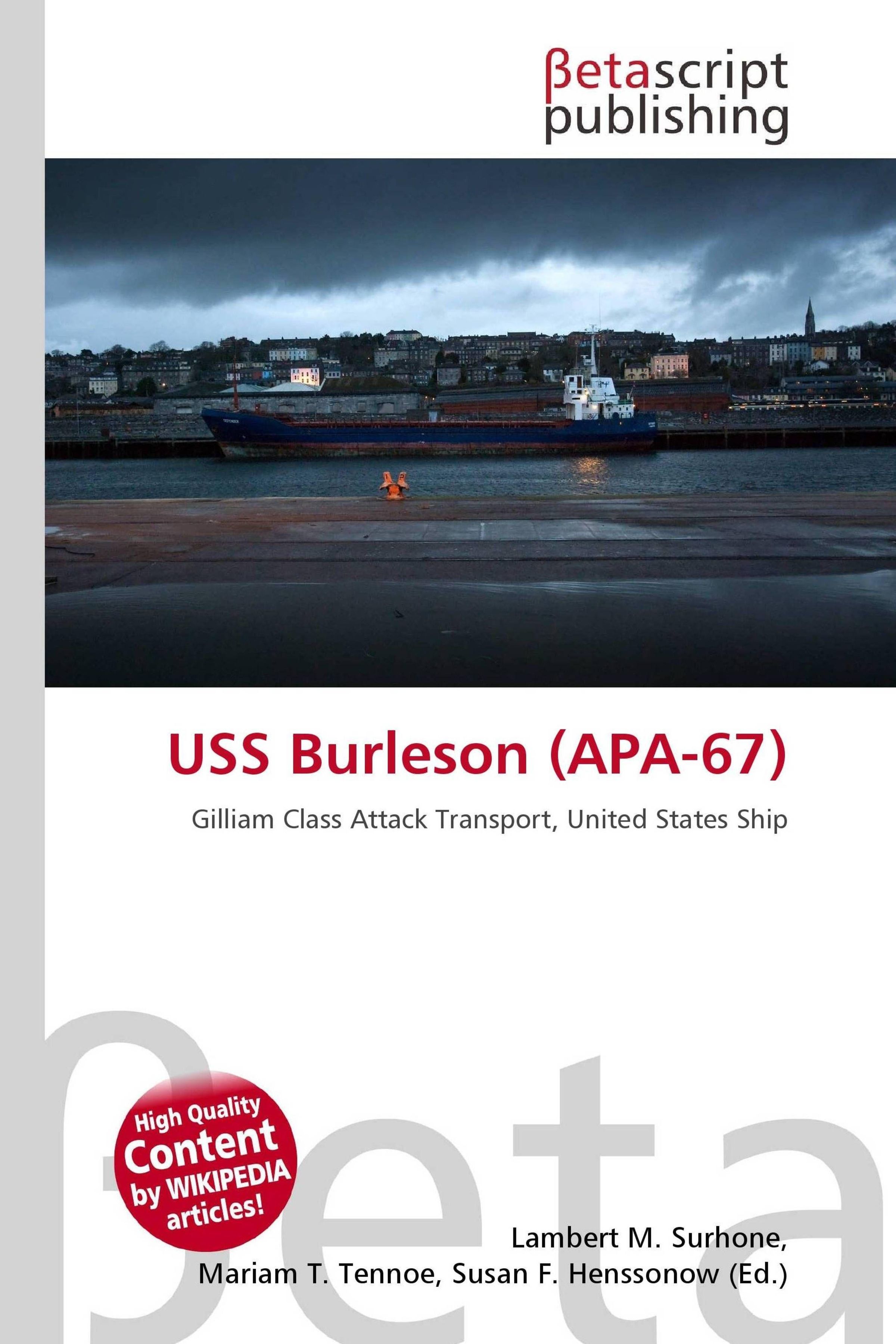 Please note that the content of this book primarily consists of articles available from Wikipedia or other free sources online. USS Burleson (APA-67), a Gilliam-class attack transport, was the only ship of the United States Navy to be named for Burleson, Texas. Her keel was laid down on 22 April 1944 at Wilmington, California, by the Consolidated Steel Corporation under a Maritime Commission contract (MC hull 1860). She was launched on 11 July 1944 sponsored by Mrs. Darryl F. Zanuck, delivered to the Navy on 7 November 1944, and commissioned on 8 November 1944 with Lieutenant Commander B. Hartley, USNR, in command. The ship was named after a county in east central Texas about 60 miles due east of Austin. Following shakedown training out of San Diego, California, and post-shakedown repairs at Terminal Island, the attack transport got underway for the southwestern Pacific on 17 January 1945. She stopped at Tillotson Cove in the Russell Islands from 3 February to 11 February. On the latter day, she moved over to Guadalcanal. Burleson operated at various locations in the Guadalcanal-Tulagi area conducting amphibious training until mid-March. On 15 March, the ship set a course for Ulithi Atoll.