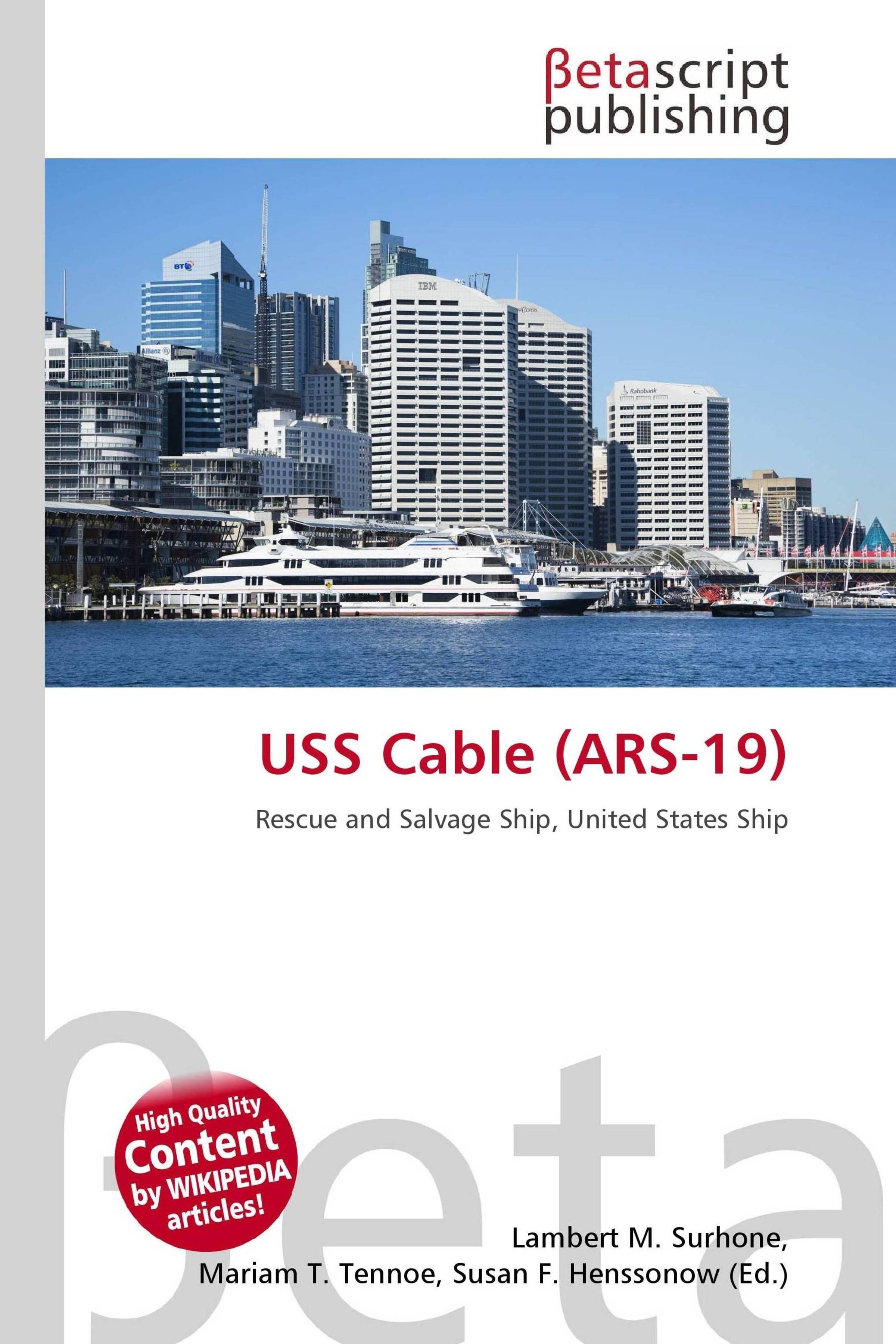 "USS Cable (ARS-19) - Rescue and Salvage Ship, United States Ship." Hochhäuser und Yachten am Wasser, mit Betascript-Logo., Buch