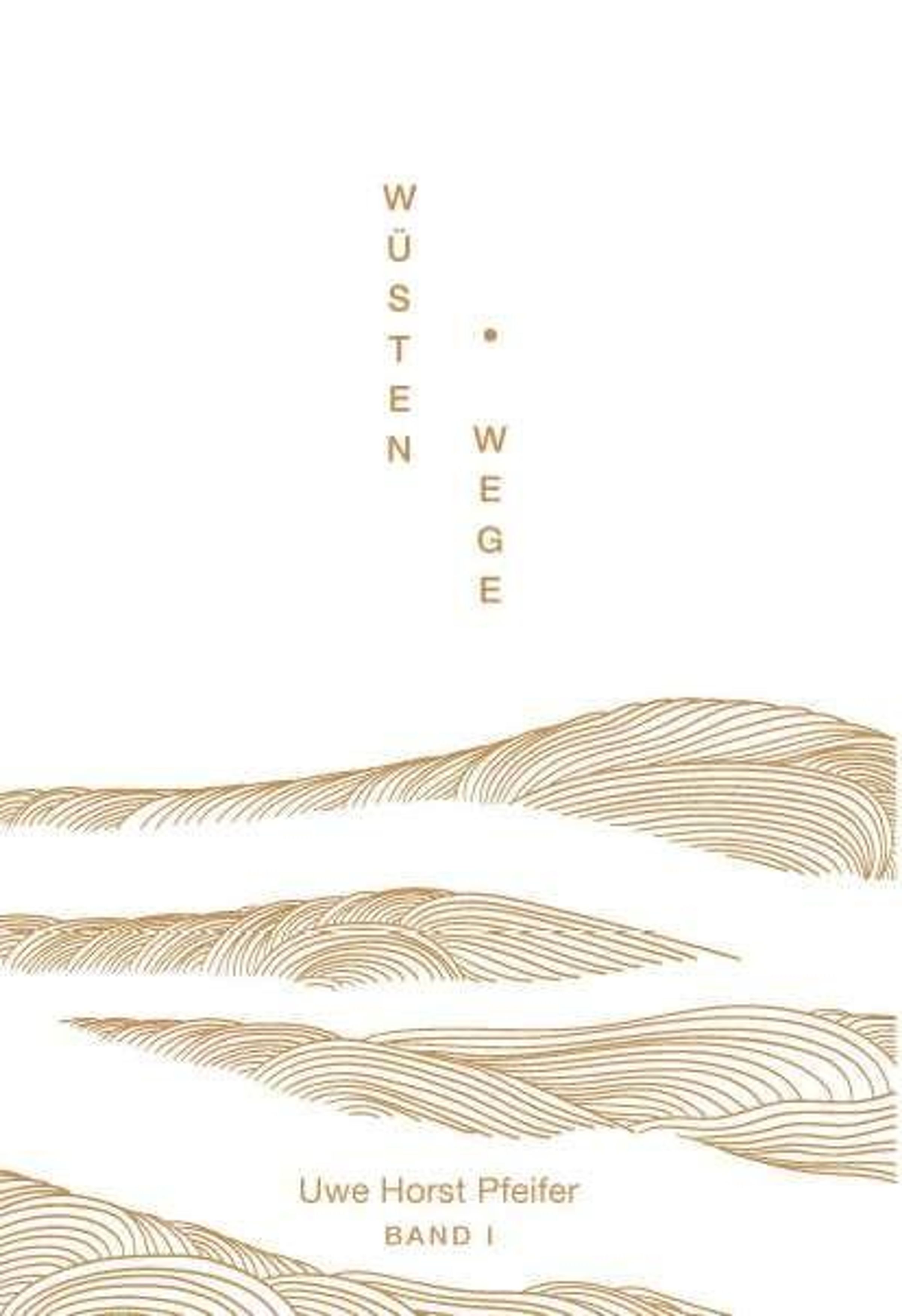 "Wüstenwege" und "Uwe Horst Pfeifer Band I". Sanddünen-Illustration in goldenen Linien., Buch