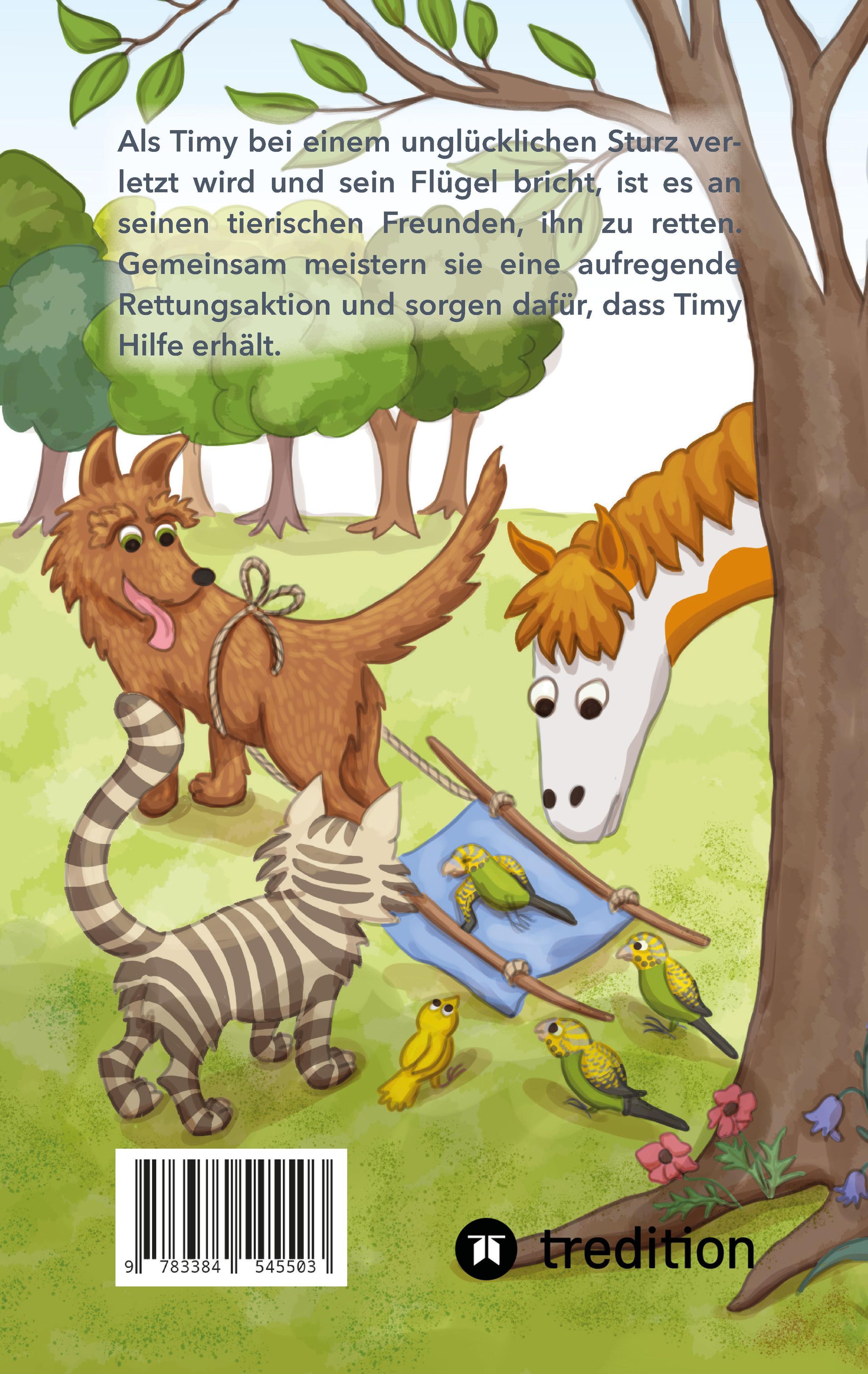 Die Geschichte dreht sich nicht nur um den dramatischen Moment der Rettung, sondern auch um die kreative und einfallsreiche Art, wie die Tiere zusammenarbeiten. Sie bauen eine Trage, um Timy sicher zum Arzt zu transportieren, und helfen ihm auf eine liebevolle Weise, als er sich nach seiner Verletzung wieder besser fühlen muss. Als Timy nach seiner Heilung traurig ist, weil er nicht mit seinen Freunden draußen spielen kann, überlegen sie sich eine besondere Überraschung: ein ferngesteuertes Flugzeug, mit dem Timy wieder fliegen kann, ohne sich weiter zu verletzen. Am Ende ist das Band der Freundschaft und die Liebe der Tiere füreinander das, was sie alle miteinander verbindet. Das Buch ist eine Geschichte über Freundschaft, Zusammenhalt und die Kreativität von Tieren, die ihre Sorgen und Ängste überwinden, um einem Freund zu helfen.
