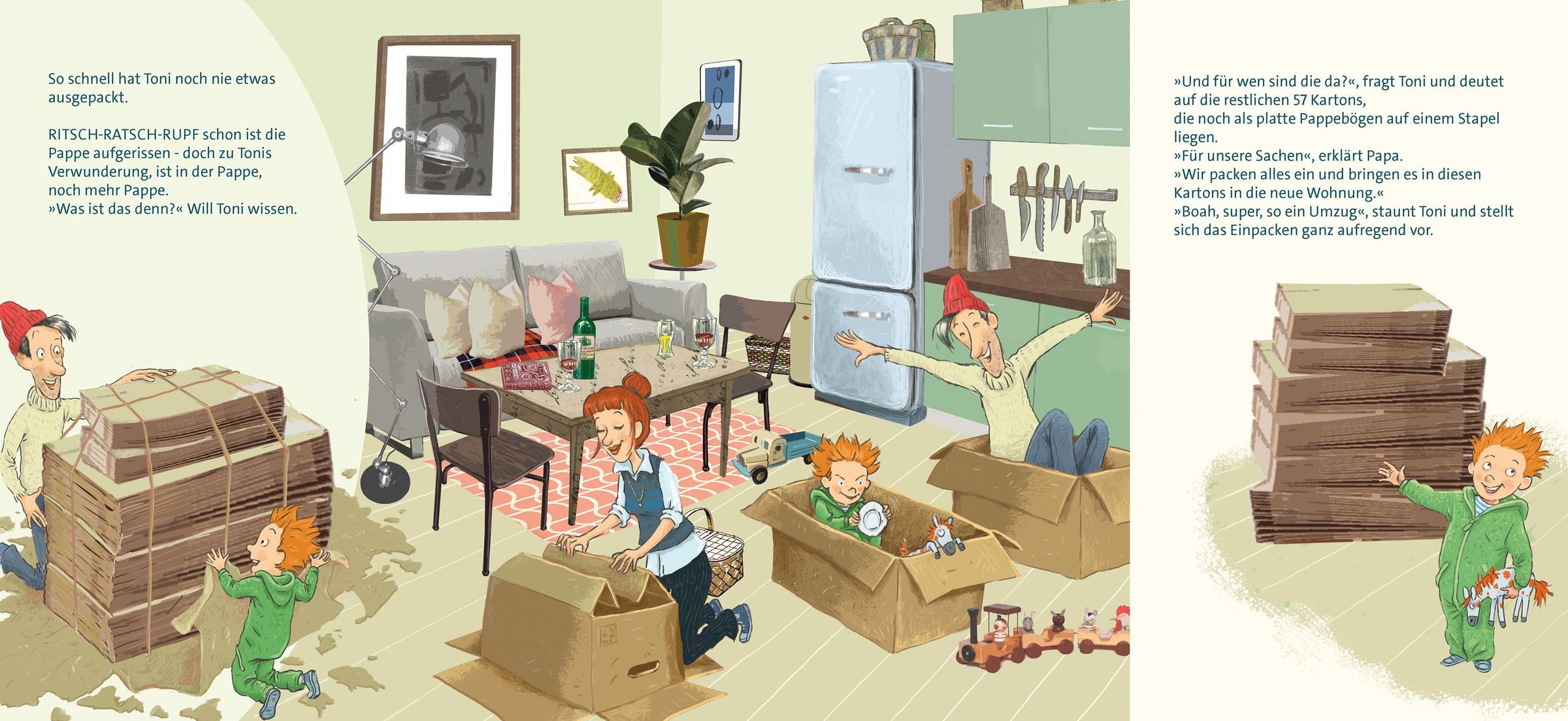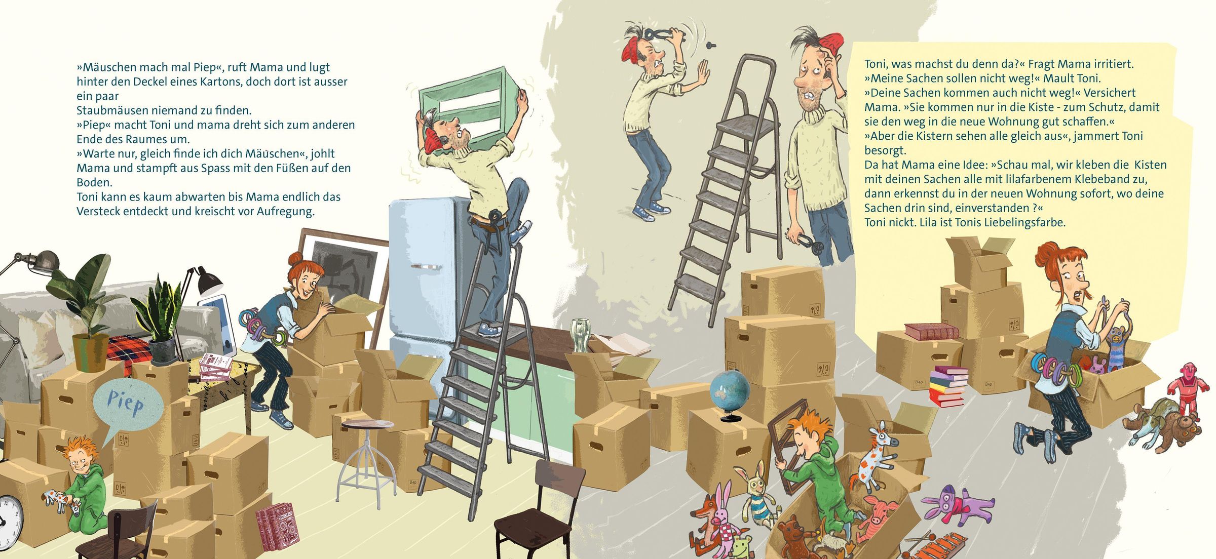 Toni schaut zu, wie sich die Wohnung Stück für Stück in eine Kistenburg verwandelt. Was kommt alles mit in die neue Wohnung? Und wovon muss man sich trennen? Geht auch sicher nicht das liebste Spielzeug verloren? Während Mama versucht, den Überblick zu behalten, Papa Blessuren aller Art sammelt und die superstarken Umzugsleute sogar das Sofa fliegen lassen, versucht Toni einfach nur, das Pony nicht aus dem Blick zu verlieren.