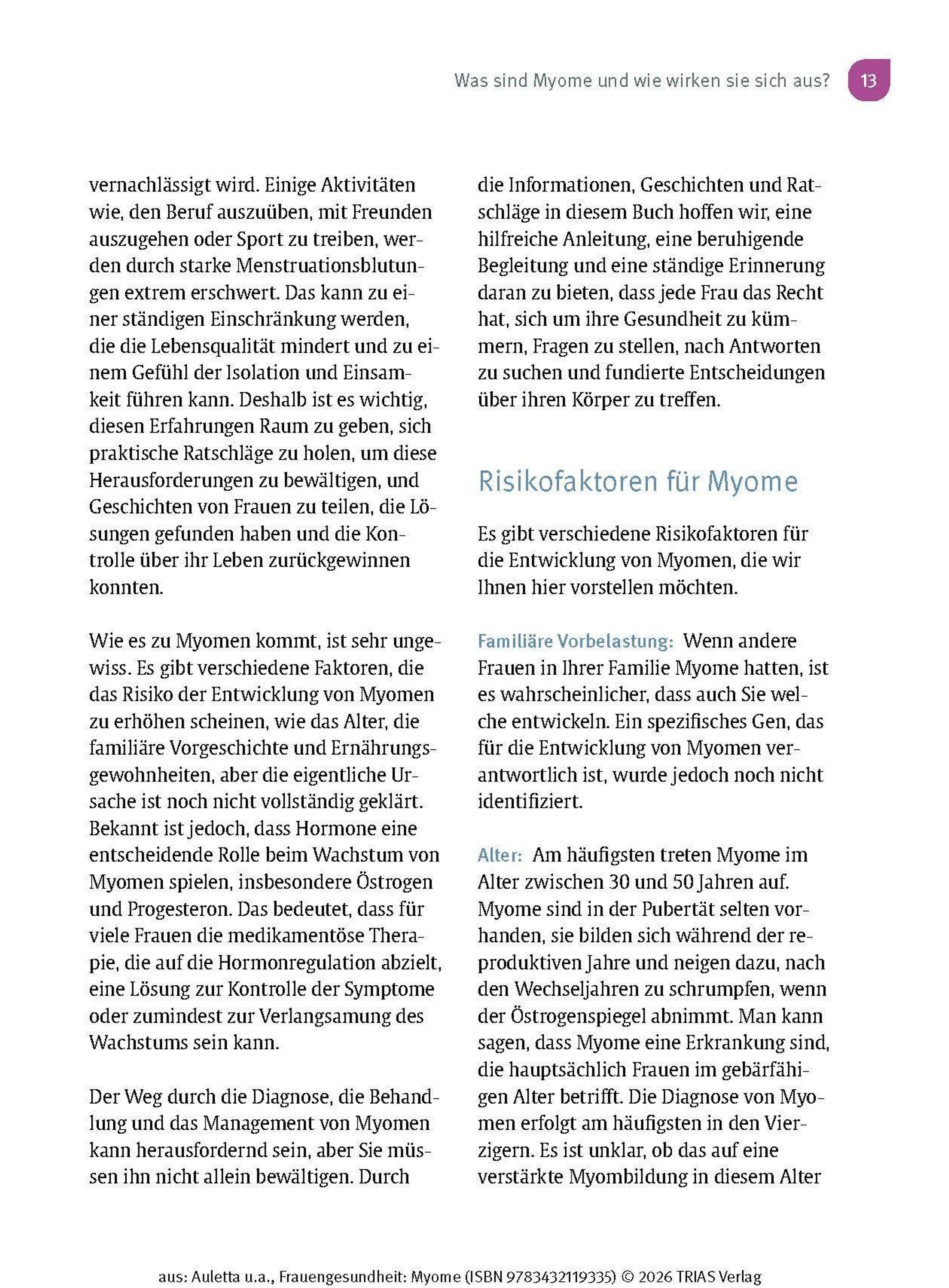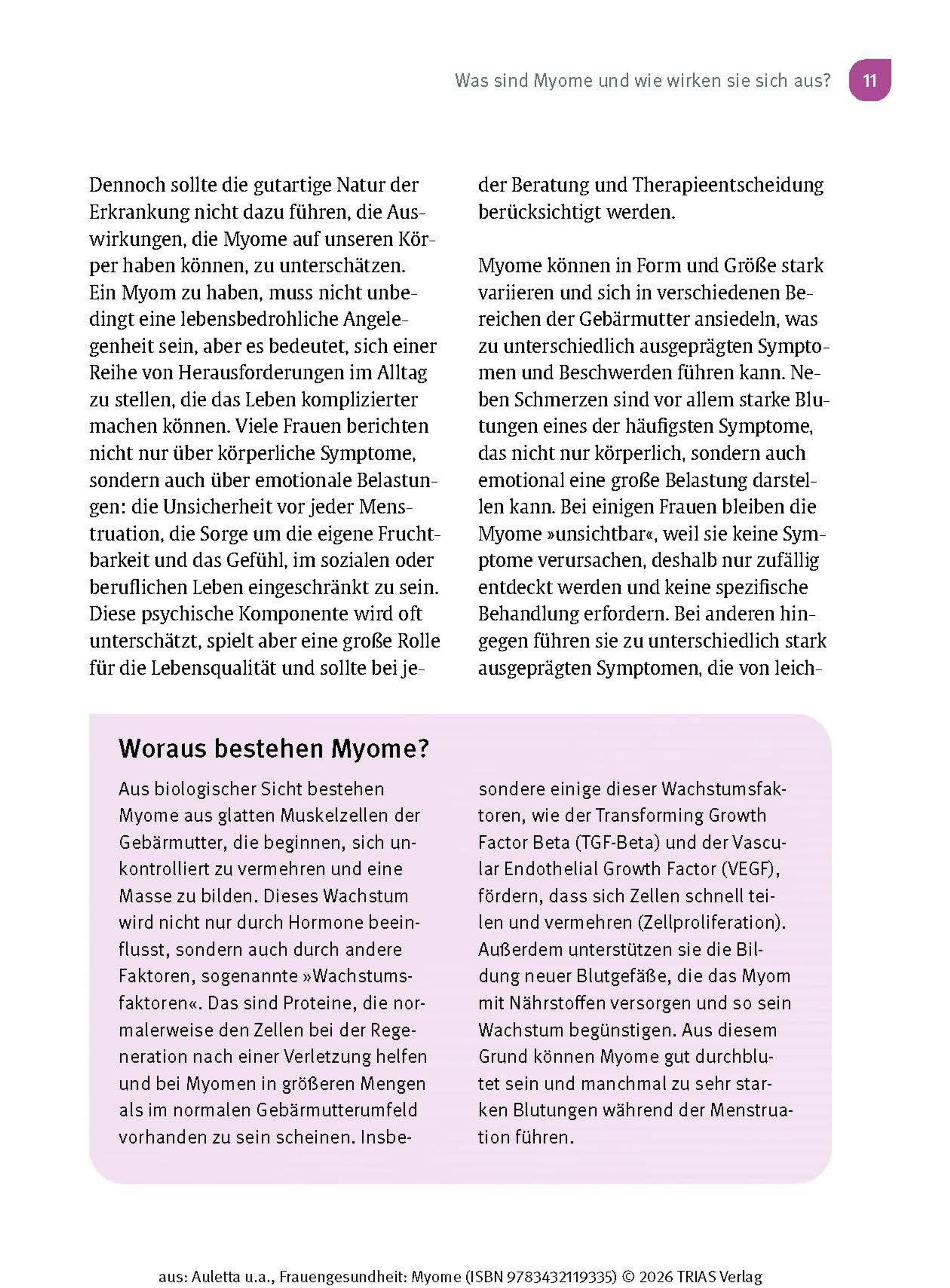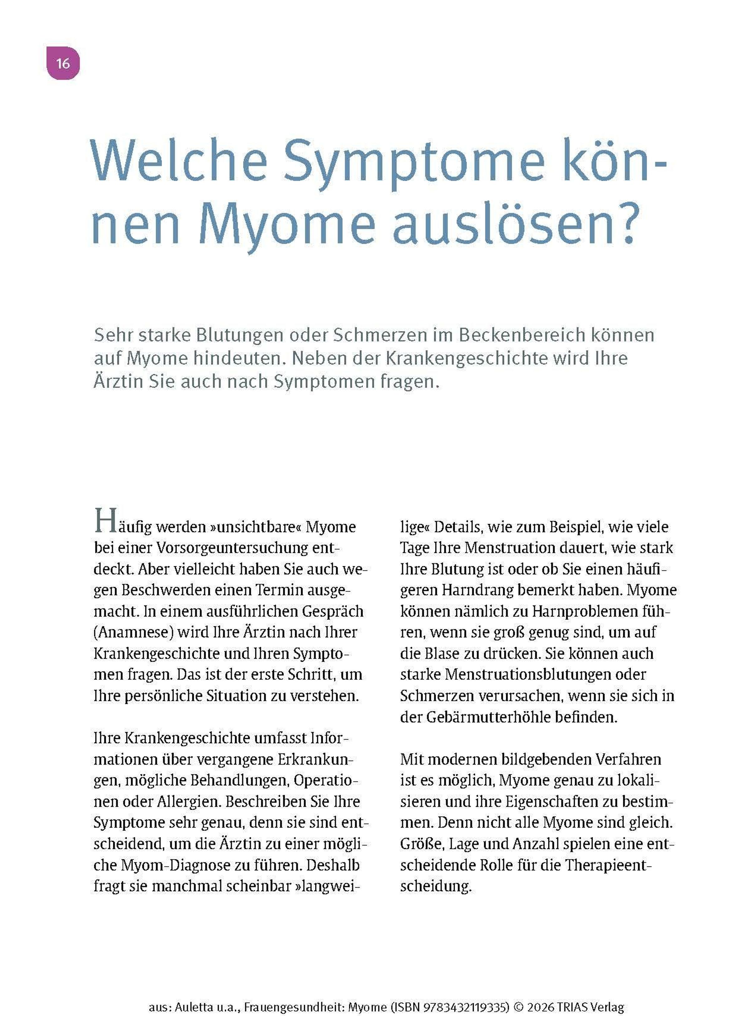 Myome gelten zwar als gutartig, sind aber häufig sehr unangenehm. Sie können Schmerzen im Unterbauch, starke Monatsblutungen, Verstopfung, Rückenschmerzen verursachen und Folgeerkrankungen nach sich ziehen. Auch auf die Fruchtbarkeit und eine Schwangerschaft können sie sich ungünstig auswirken. Aber keine Sorge, Sie müssen sich nicht mit Ihren Myomen abfinden. Dr. Valentina Auletta, Frauenärztin und Myom-Spezialistin, zeigt Ihnen alle wirksamen Therapien auf, die Myomen Einhalt gebieten und Beschwerden effektiv lindern.