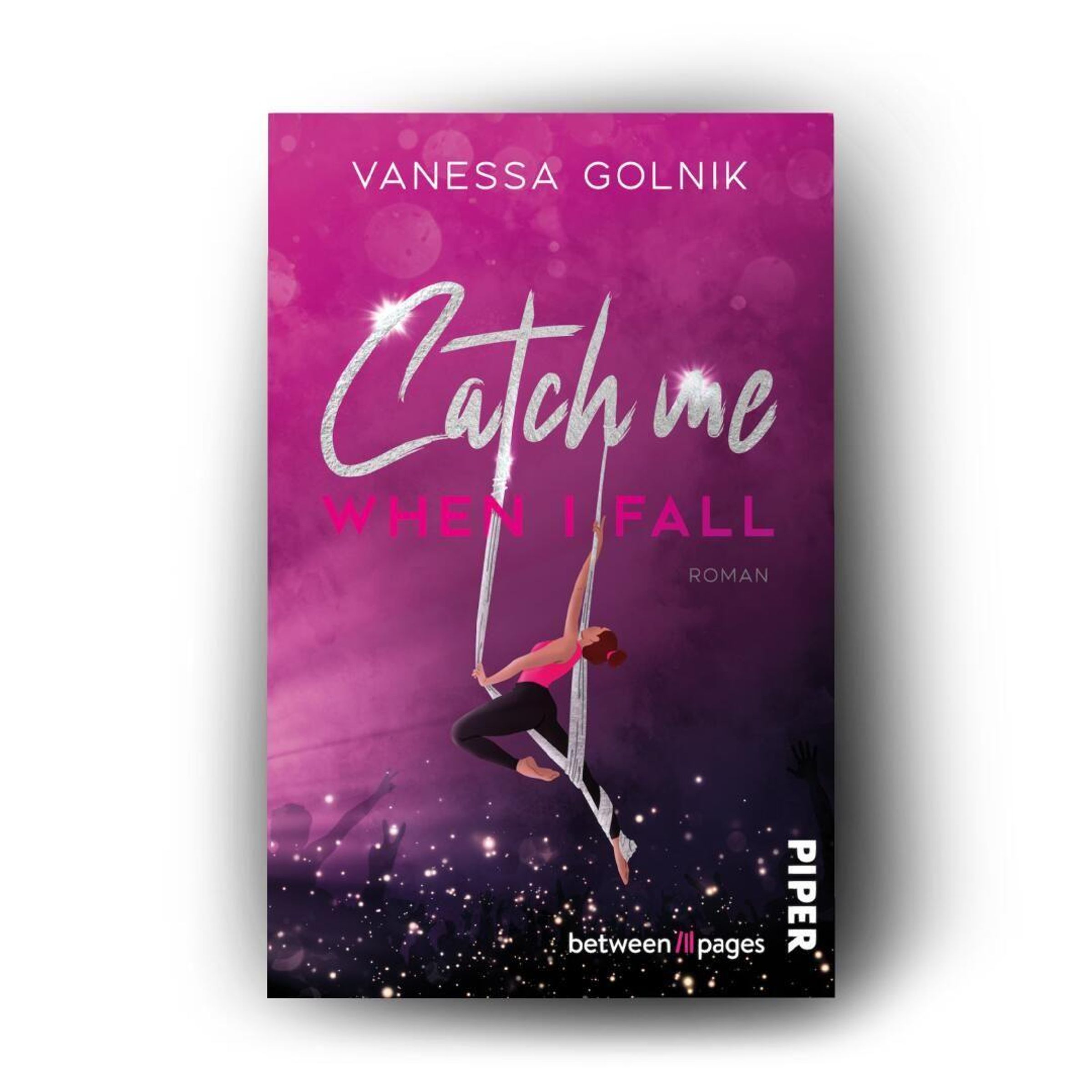 "Catch me when I fall" in glänzender Schrift. Illustration einer Akrobatin am Trapez vor einem Publikum im Dunkeln., Buch