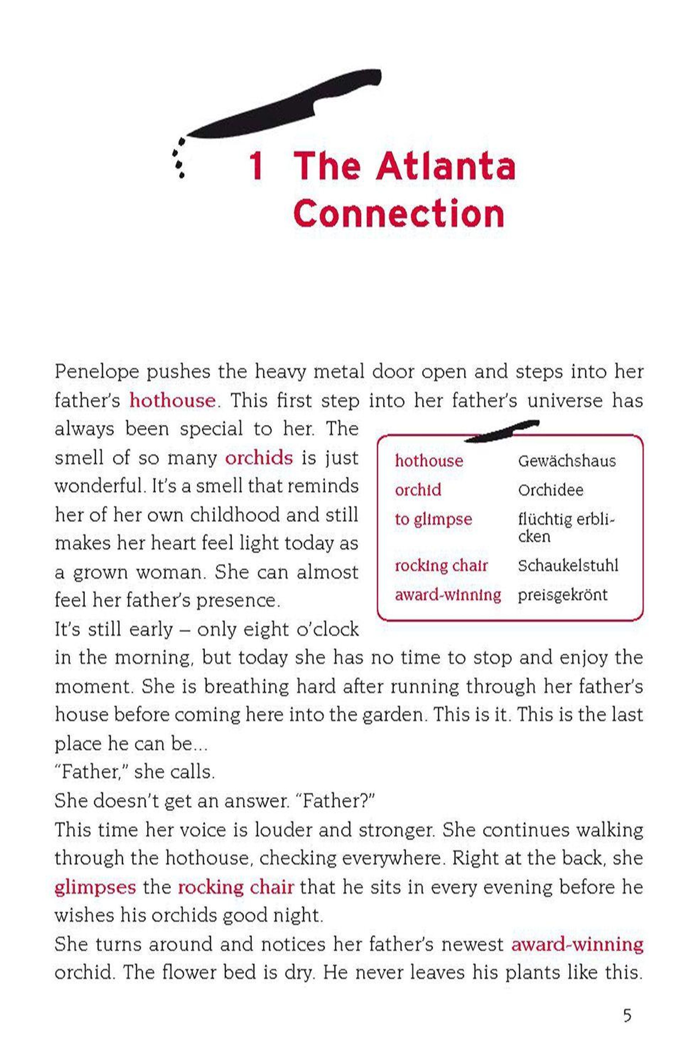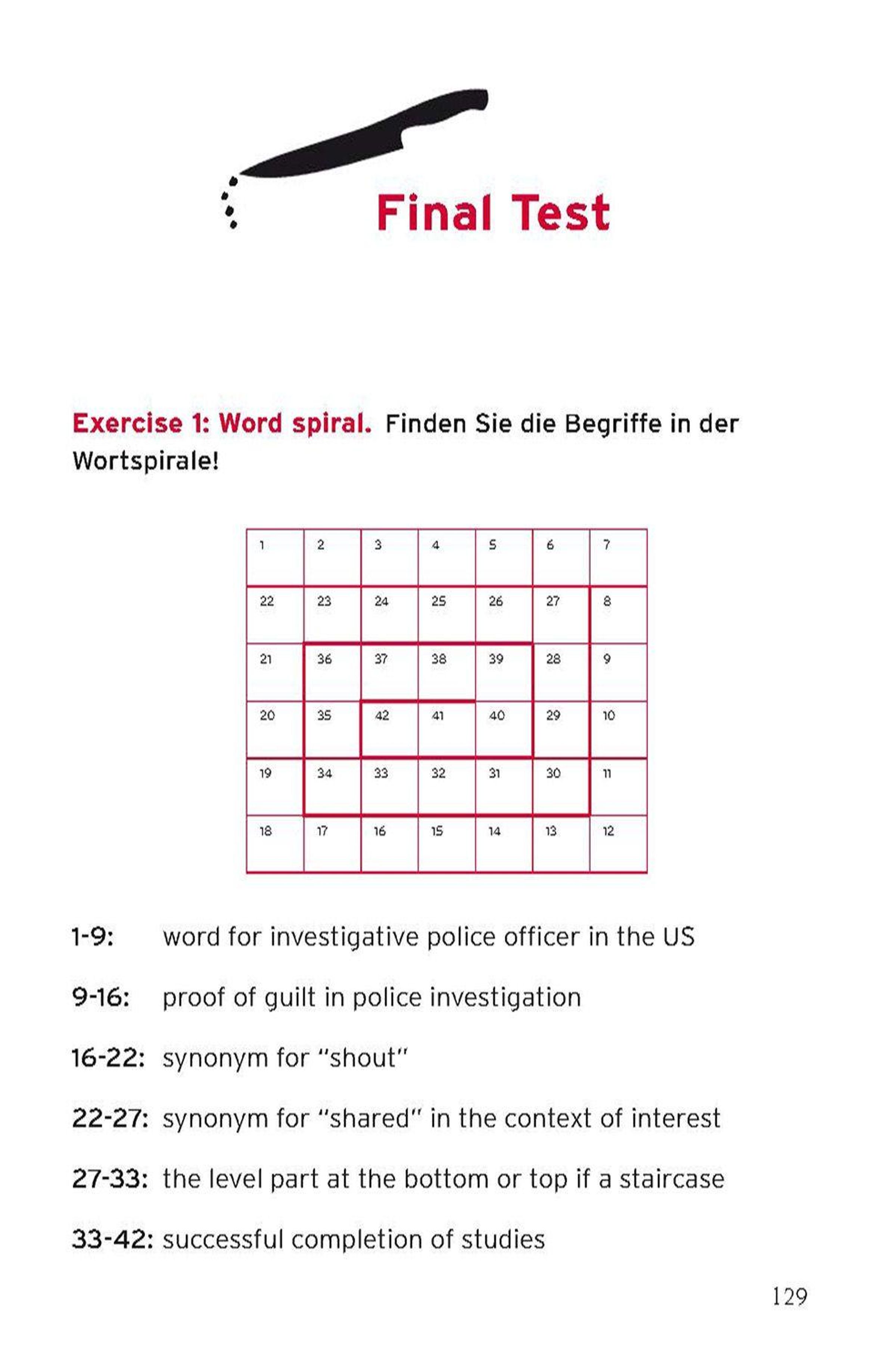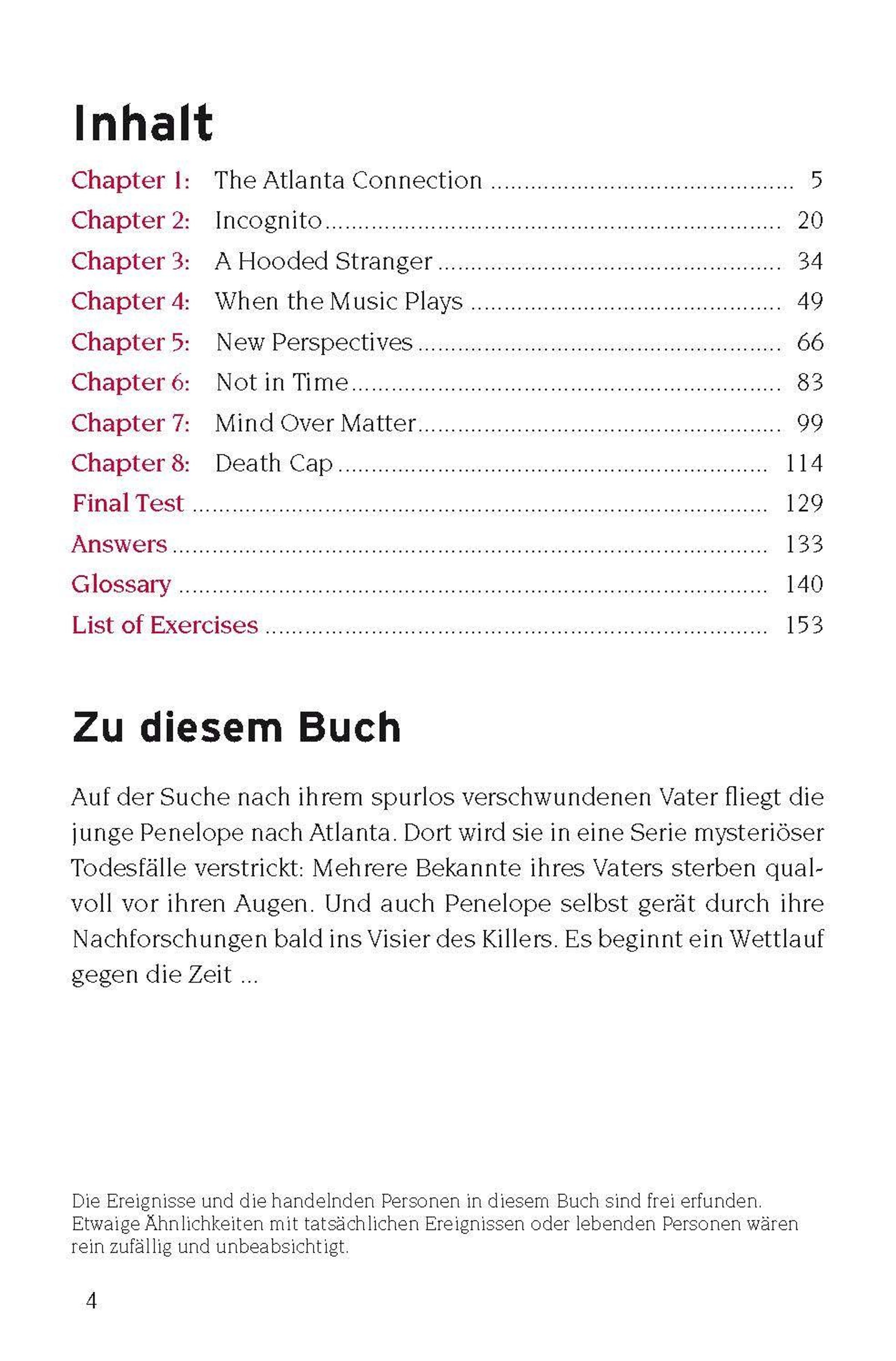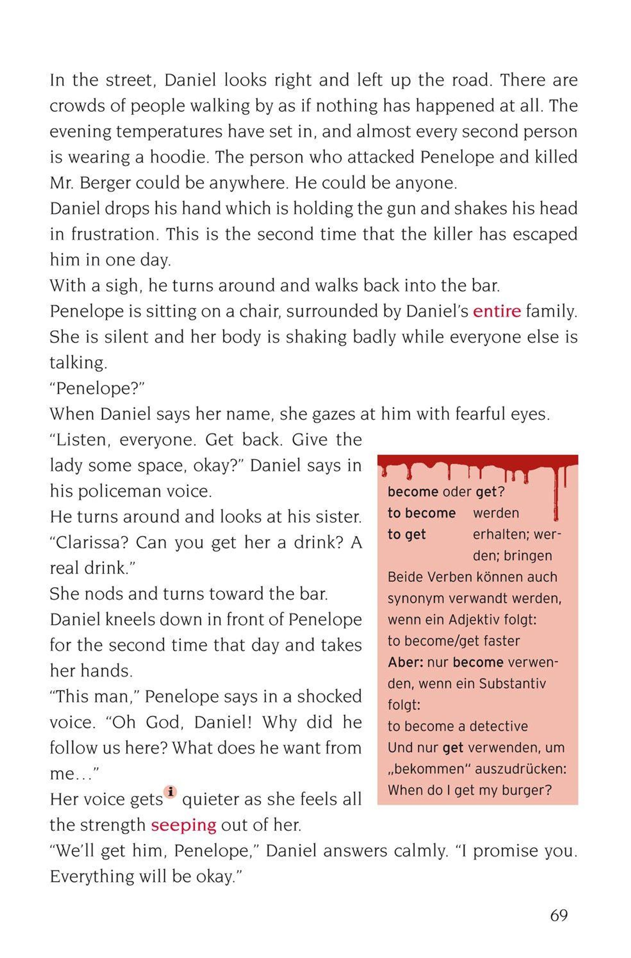 - Infokästen zu Sprache und Grammatik: Zusätzliche Informationen, Tipps und Wissenswertes zu Sprache, Grammatik und Landeskunde runden den Lernkrimi Thriller "Faceless Killer" ab.