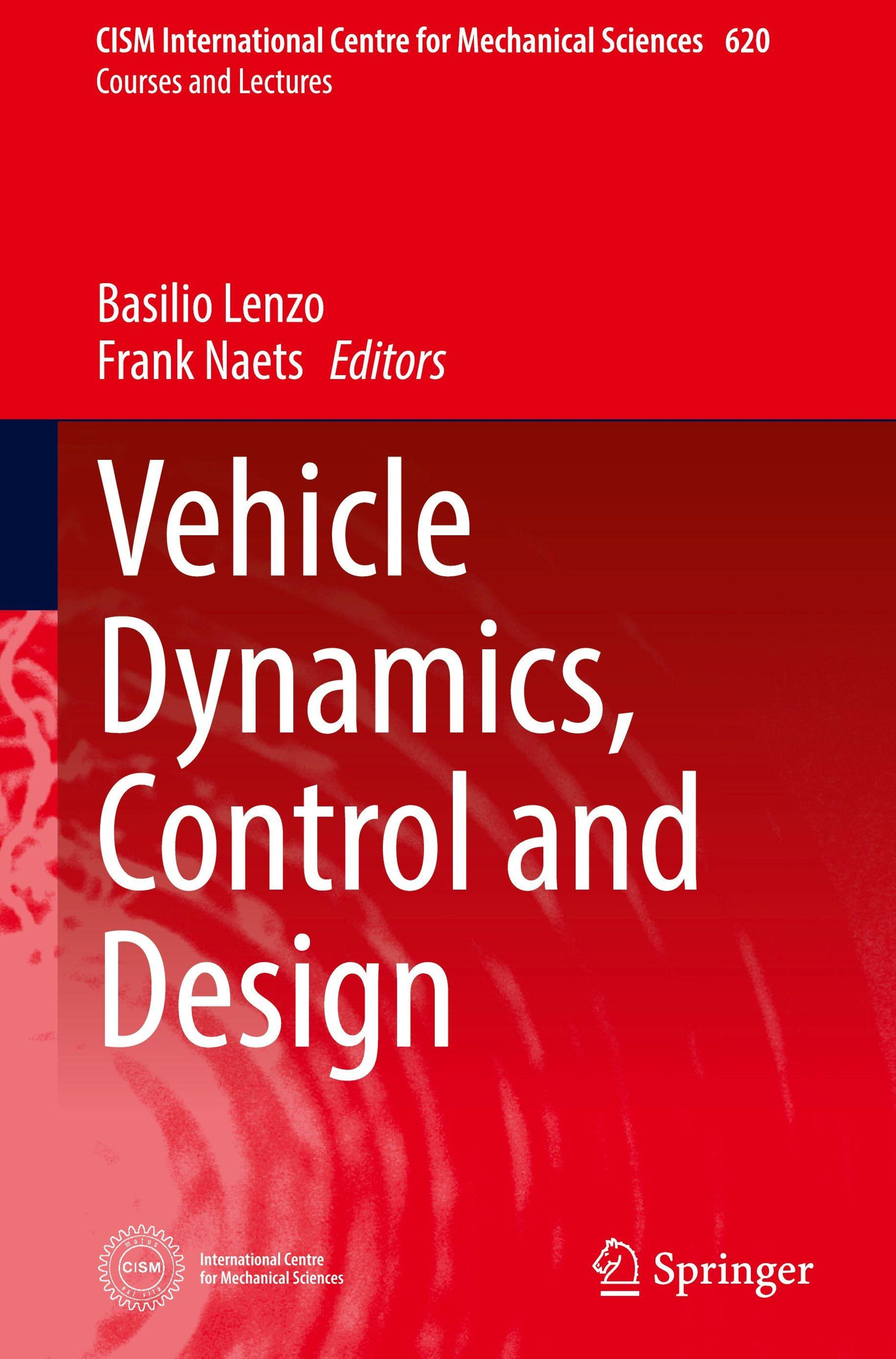 "Vehicle Dynamics, Control and Design". Roter Hintergrund mit abstrakten Mustern, Logos von CISM und Springer., Buch