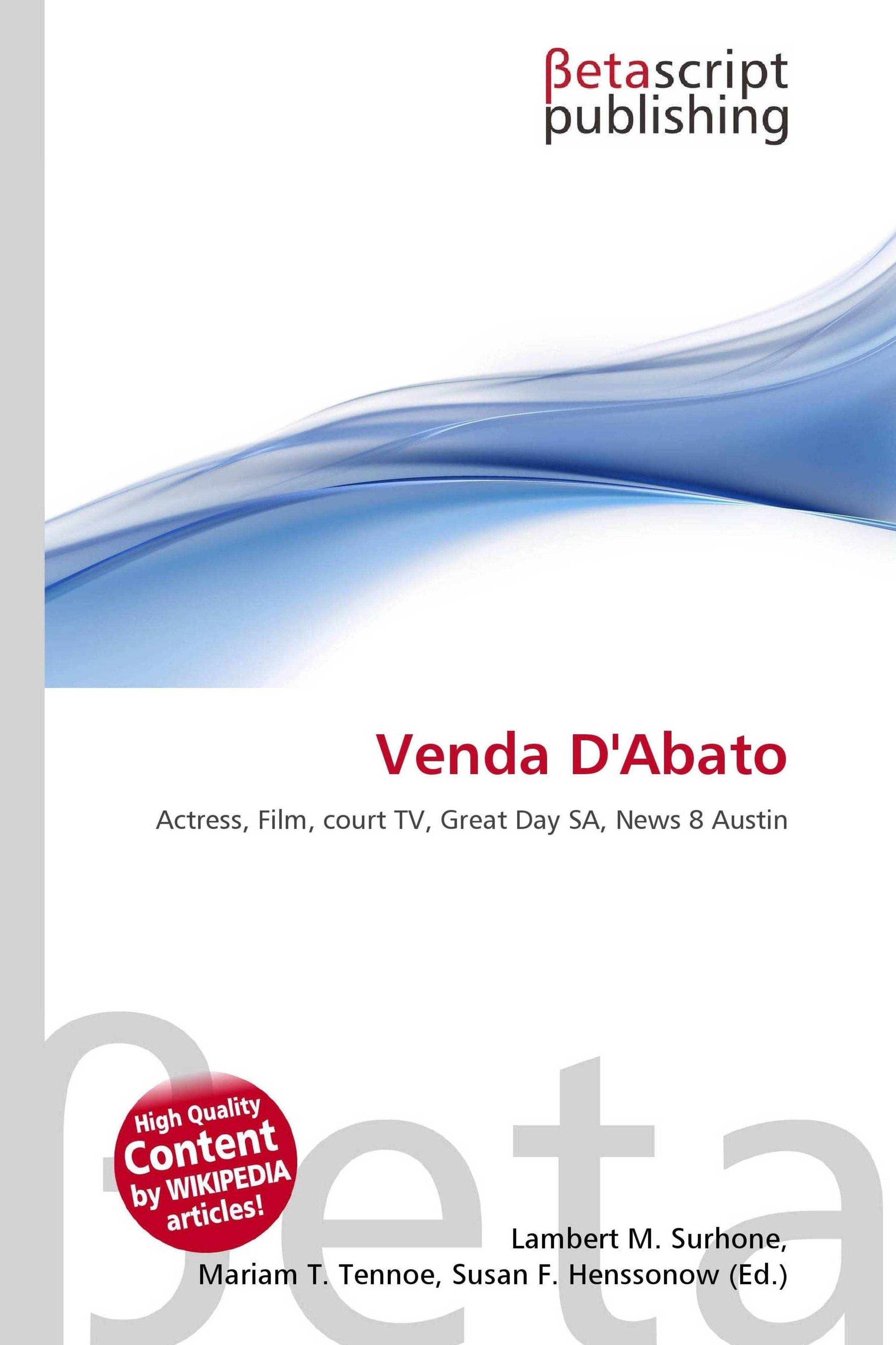 Please note that the content of this book primarily consists of articles available from Wikipedia or other free sources online. Venda D'Abato (January 30, 1979) is an American film actress. D'Abato was born in Corpus Christi, Texas. She and her one sister were raised by their single mother in South Texas. From 2005 to 2007, D'Abato performed in many independent films but now appears solely in sanctioned SAG productions. D'Abato spends most of her time in San Antonio, Texas when not filming, with her family. She is represented exclusively by Topp Drawer Talent in Texas, Louisiana, New Mexico, and Los Angeles.