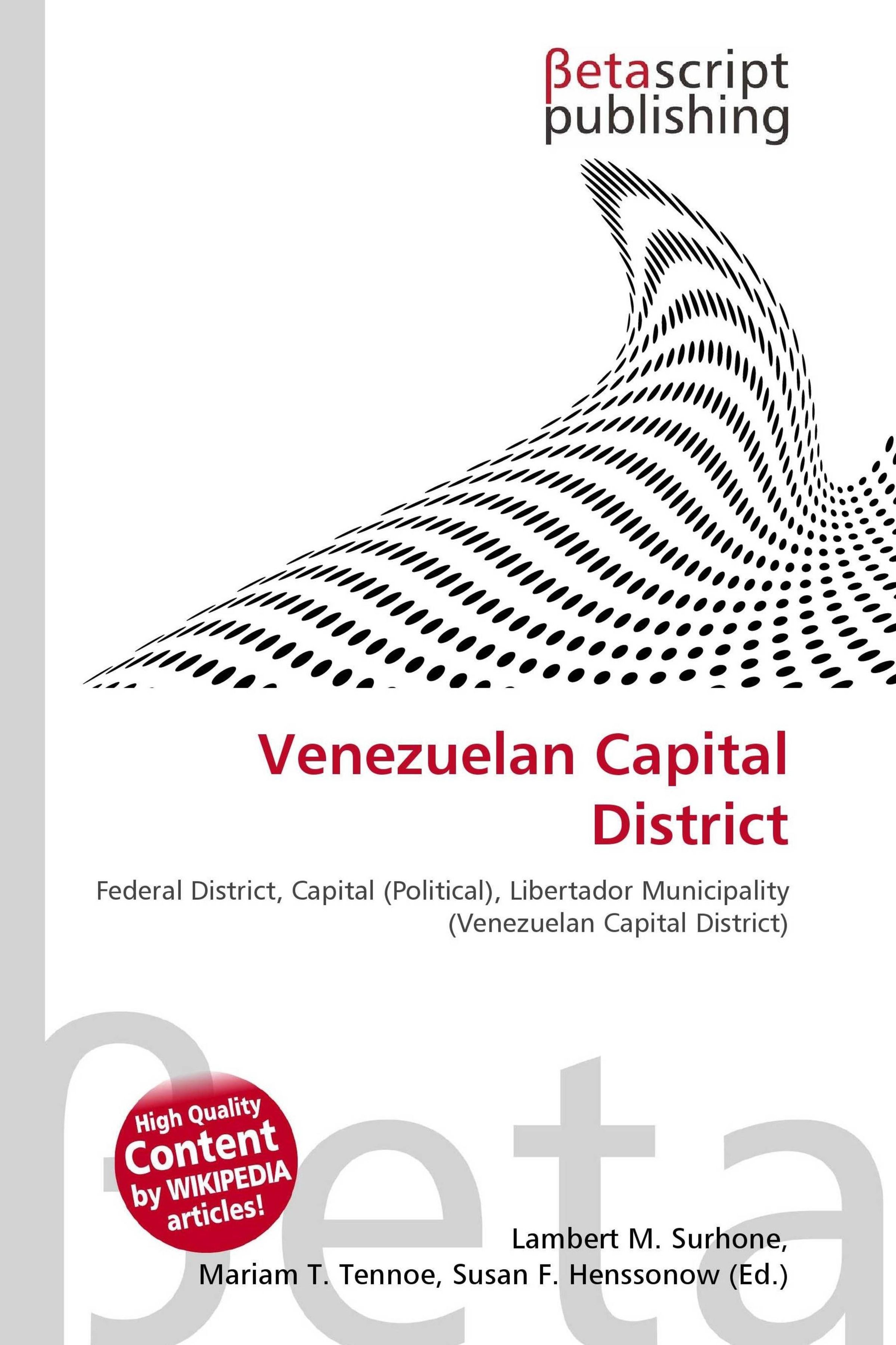 Please note that the content of this book primarily consists of articles available from Wikipedia or other free sources online. The Capital District (Spanish: Distrito Capital) of Venezuela is a federal district corresponding to the capital Caracas. It has an area of 433 km² and there is only one administrative division (municipio), Libertador, which contains the City of Caracas. It is the seat of the federal government and the head of the public powers. The population in 2004 was 2, 073, 768. The District borders on the states of Vargas and Miranda.