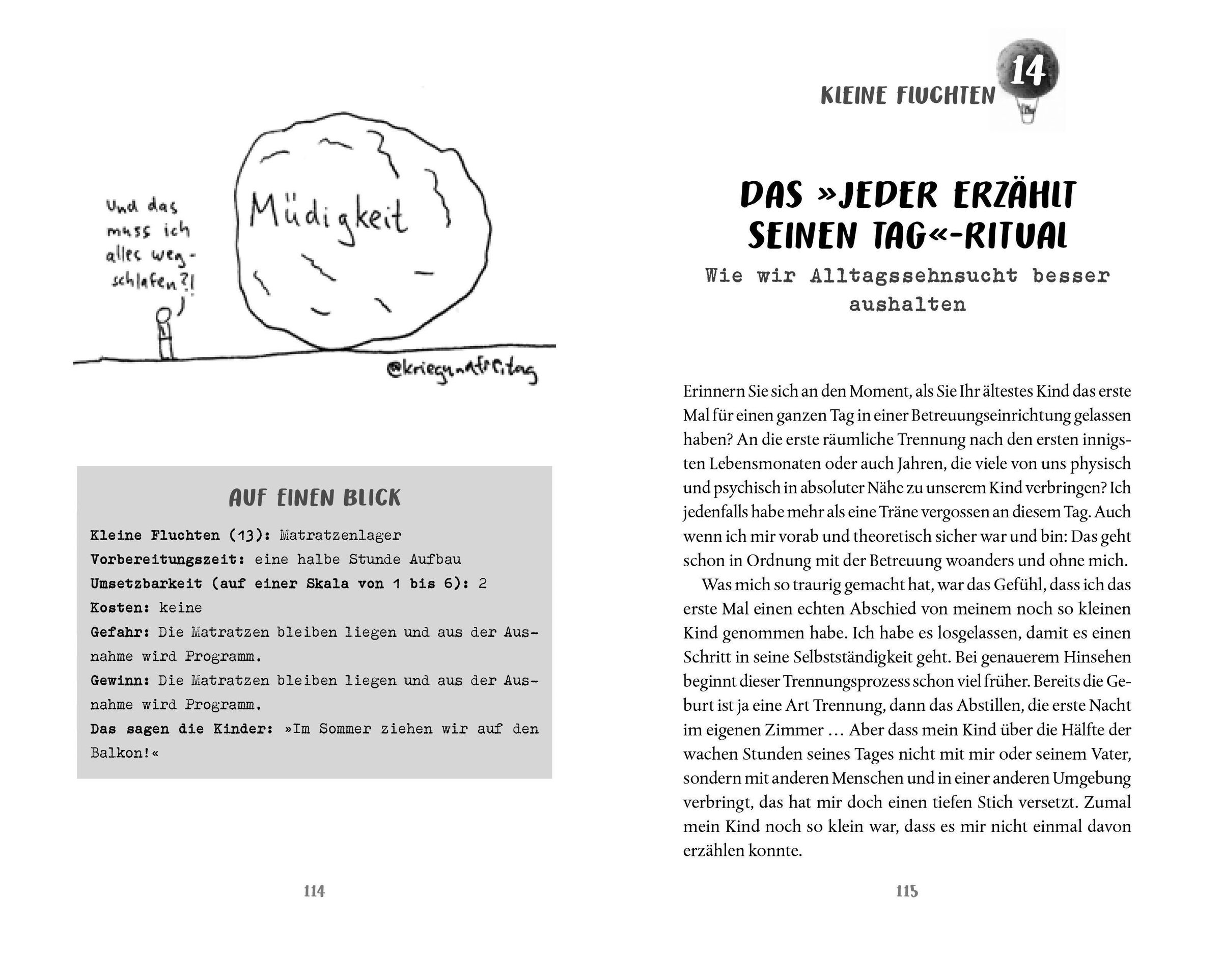 Das Leben könnte so schön sein, wenn der Alltag nicht wäre. Und wer Familie hat, bekommt den Alltag oft besonders hart zu spüren. Unbeschwert in den Tag hineinzuleben und nicht auf die Uhr zu schauen, ist fast unmöglich. Alle stecken im Hamsterrad - höchste Zeit also, die Perspektive zu wechseln! In 20 kleinen Fluchten zeigt uns Journalistin Vera Schroeder den Ausstieg im Miniaturformat. Wie man im täglichen Wahnsinn das ganz persönliche Familienglück wiederfindet; wie man Chaos zulässt und Kontrolle abgibt; wie man den Fokus schärft und den Blick schweifen lässt. Wir müssen nicht unser ganzes Leben umkrempeln, damit es wieder leicht und lustig wird! Wir müssen in erster Linie herausfinden, was uns als Familie stärkt - und zu einem winning team werden lässt. Dafür ist das von @kriegundfreitag kongenial illustrierte Buch der ideale Begleiter.