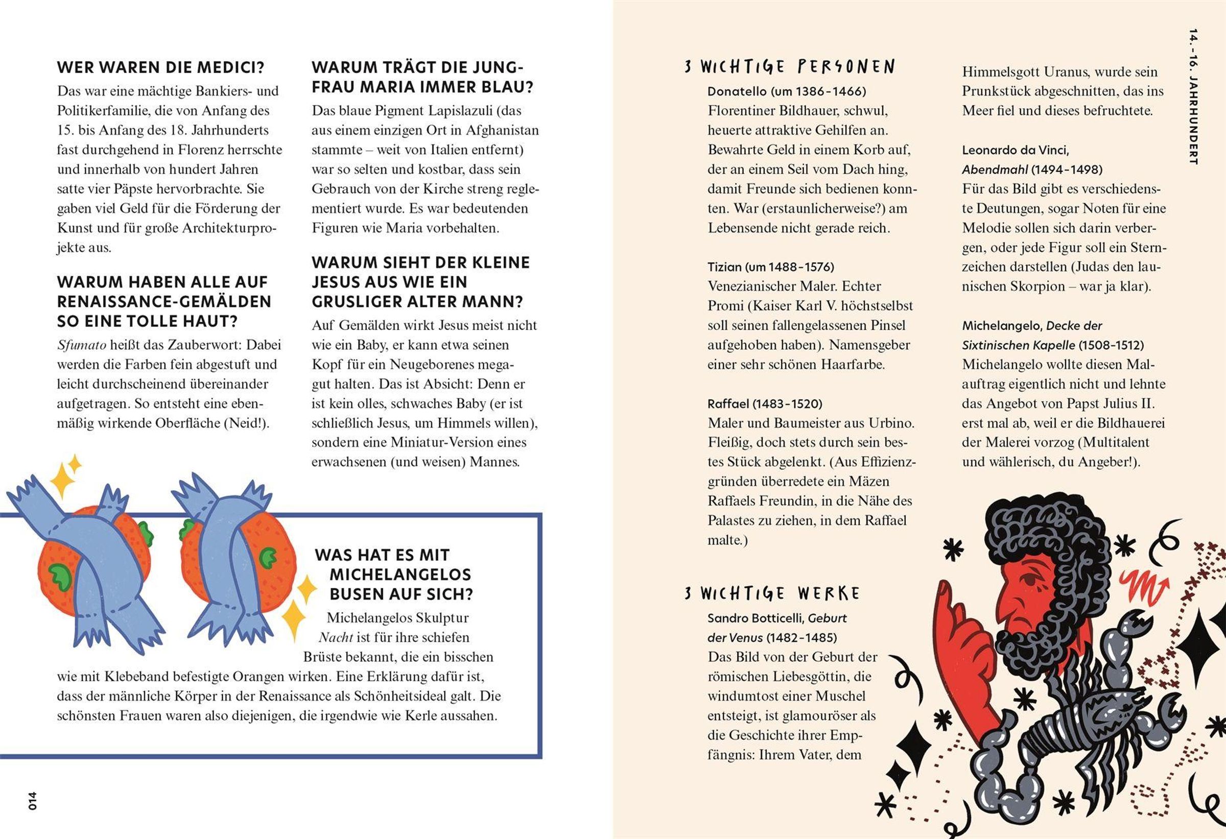 Genau das gelingt Verity Babbs in diesem einzigartigen Kunstgeschichte-Buch. Mit Humor und Leichtigkeit beantwortet sie im Q&A-Stil spannende Fragen und führt so unterhaltsam durch 50 kunsthistorische Strömungen - von Renaissance-Kunst und Romantik über Impressionismus und Surrealismus bis hin zur Neuen Leipziger Schule. Auf den Punkt gebrachte Künstlerbiografien geben unerwartete Einblicke: Caravaggio, Edvard Munch, Gustave Courbet und viele mehr. Ein farbenfroh illustriertes Kunstbuch, gespickt mit persönlichen Geschichten, Skandalen, True Crime und skurrilen Fakten, das zum Schmunzeln und Staunen einlädt, inspiriert - und dafür sorgt, dass du dich im Museum nie wieder verloren fühlst.