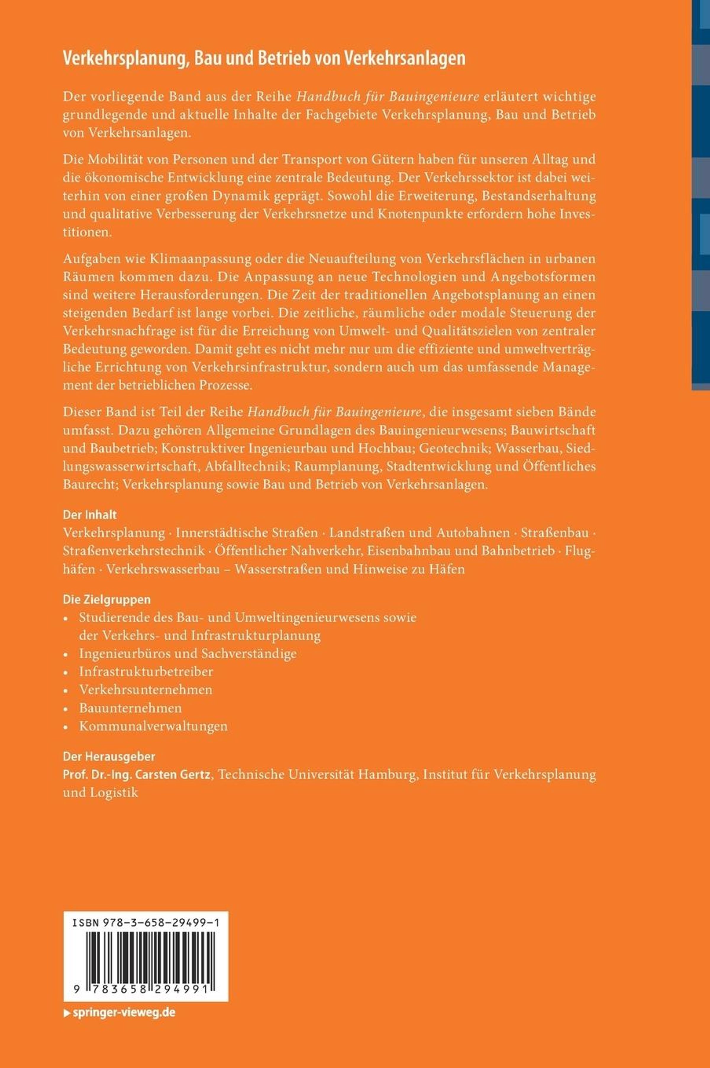 Der vorliegende Band aus der Reihe Handbuch für Bauingenieure erläutert wichtige grundlegende und aktuelle Inhalte der Fachgebiete Verkehrsplanung, Bau und Betrieb von Verkehrsanlagen. Die Mobilität von Personen und der Transport von Gütern haben für unseren Alltag und die ökonomische Entwicklung eine zentrale Bedeutung. Der Verkehrssektor ist dabei weiterhin von einer großen Dynamik geprägt. Sowohl die Erweiterung, Bestandserhaltung und qualitative Verbesserung der Verkehrsnetze und Knotenpunkte erfordern hohe Investitionen. Aufgaben wie Klimaanpassung oder die Neuaufteilung von Verkehrsflächen in urbanen Räumen kommen dazu. Die Anpassung an neue Technologien und Angebotsformen sind weitere Herausforderungen. Die Zeit der traditionellen Angebotsplanung an einen steigenden Bedarf ist lange vorbei. Die zeitliche, räumliche oder modale Steuerung der Verkehrsnachfrage ist für die Erreichung von Umwelt- und Qualitätszielen von zentraler Bedeutung geworden. Damit geht es nicht mehr nur um die effiziente und umweltverträgliche Errichtung von Verkehrsinfrastruktur, sondern auch um das umfassende Management der betrieblichen Prozesse. Dieser Band ist Teil der Reihe Handbuch für Bauingenieure, die insgesamt sieben Bände umfasst. Dazu gehören Allgemeine Grundlagen des Bauingenieurwesens; Bauwirtschaft und Baubetrieb; Konstruktiver Ingenieurbau und Hochbau; Geotechnik; Wasserbau, Siedlungswasserwirtschaft, Abfalltechnik; Raumplanung, Stadtentwicklung und Öffentliches Baurecht; Verkehrsplanung sowie Bau und Betrieb von Verkehrsanlagen.