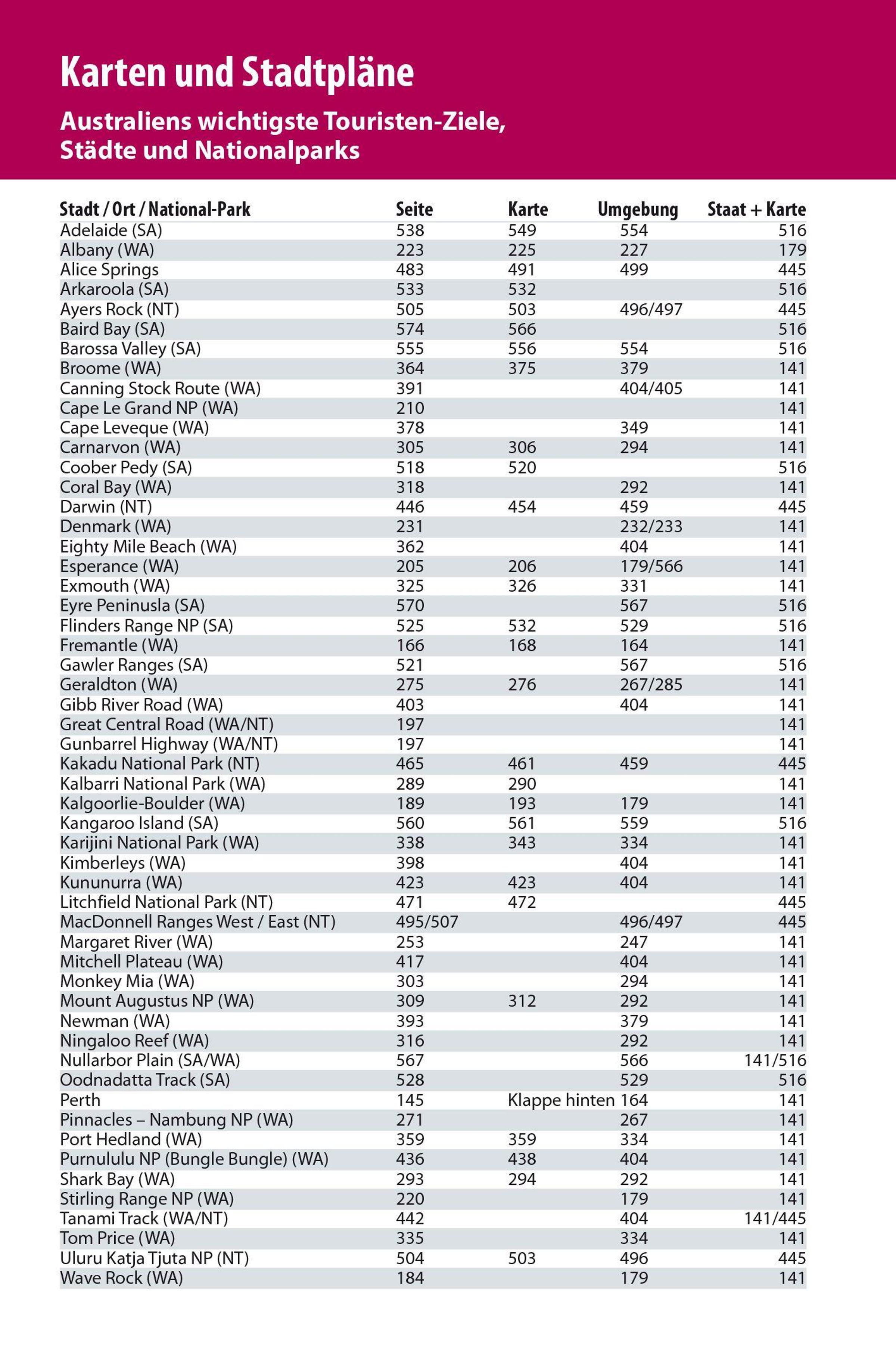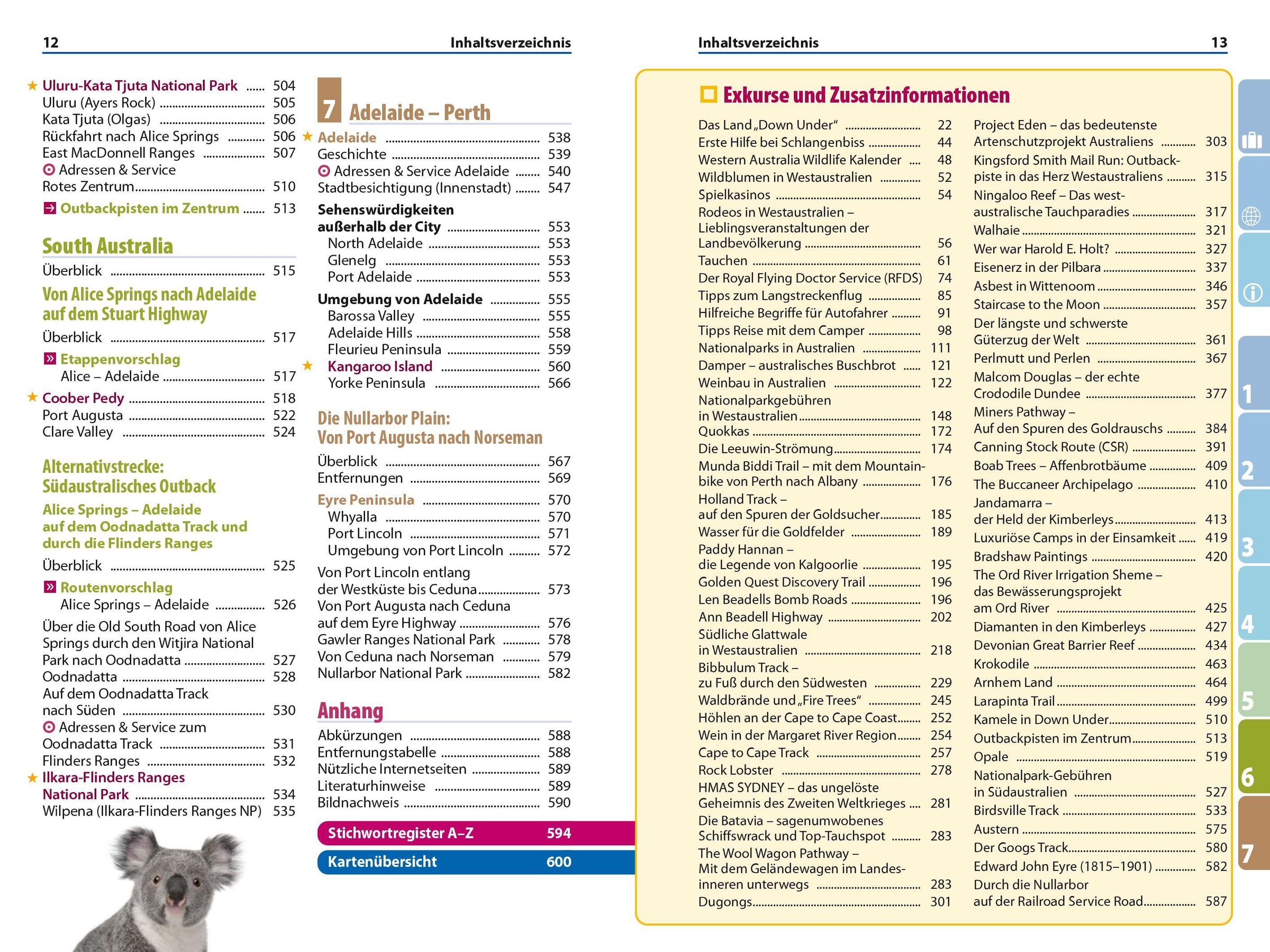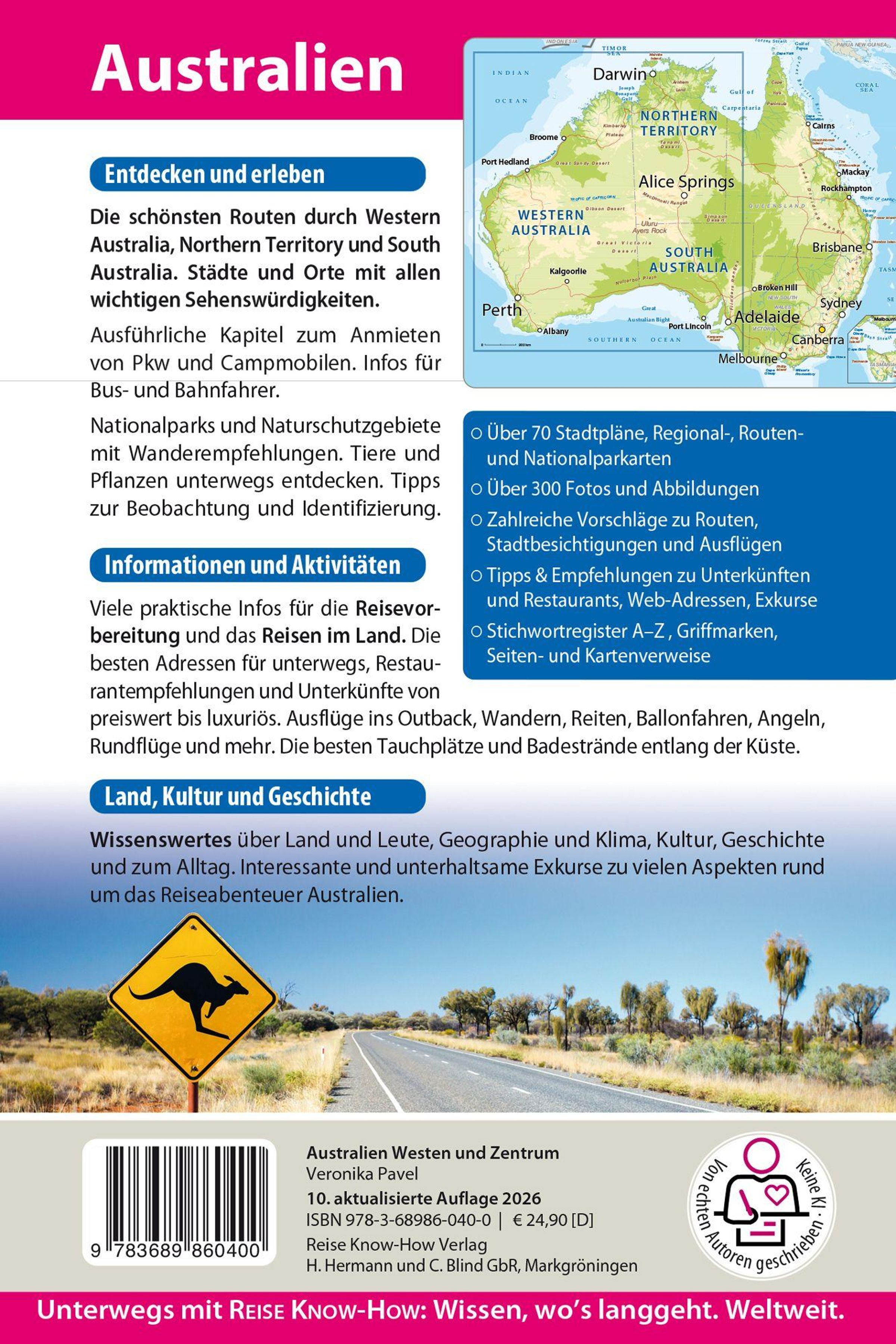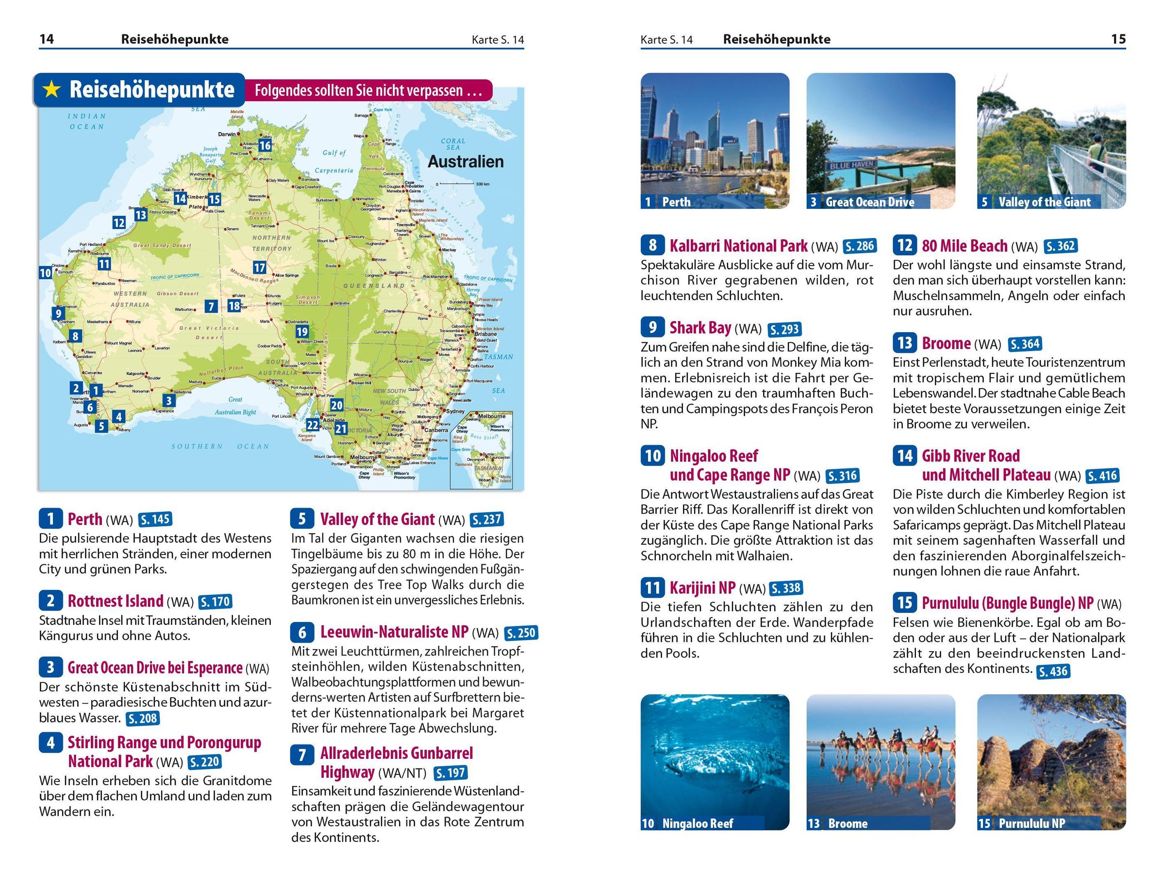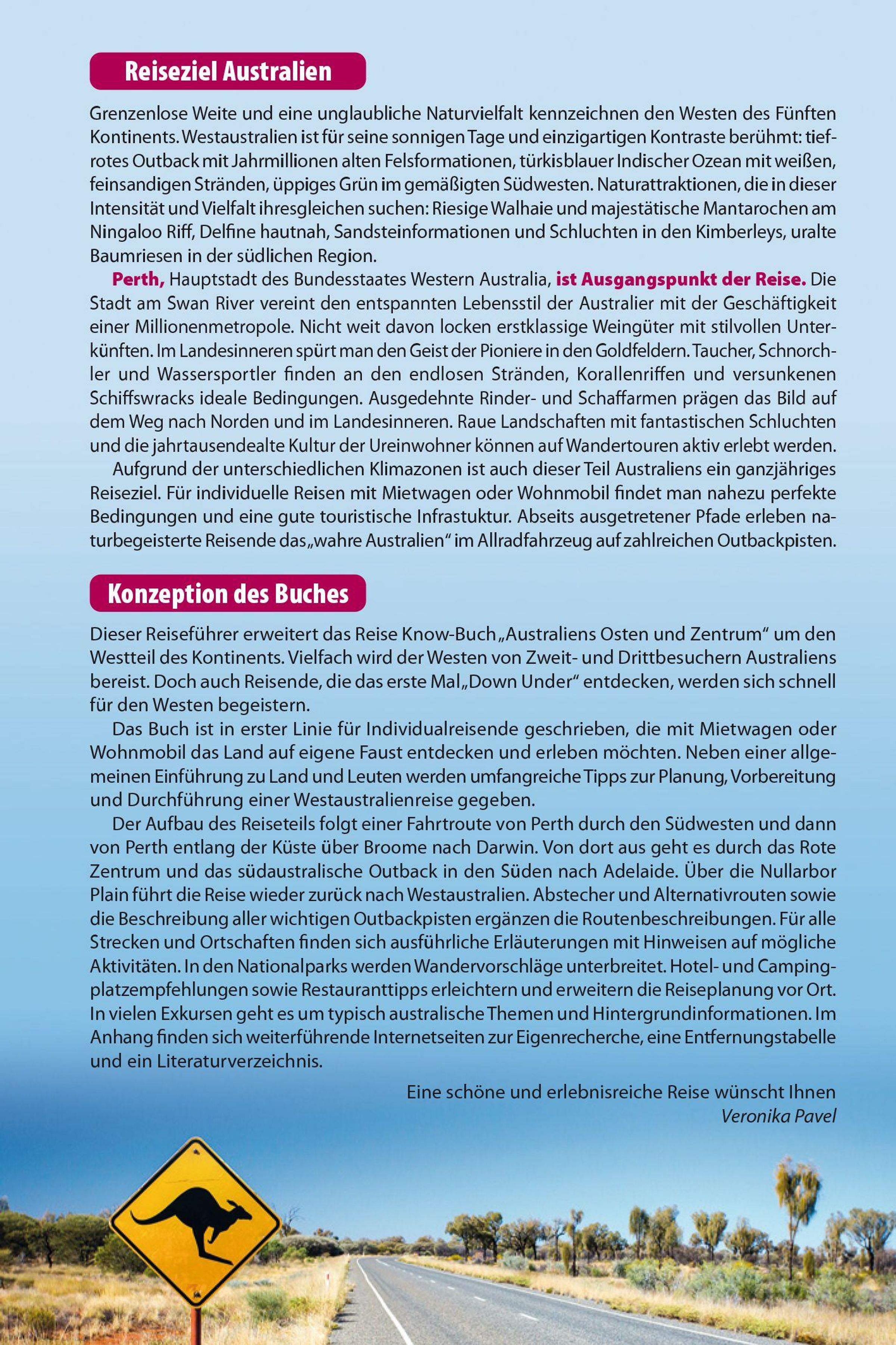Entdecken und erleben: Die schönsten Routen durch Western Australia, Northern Territory und South Australia. Städte und Orte mit allen wichtigen Sehenswürdigkeiten. Ausführliche Kapitel zum Anmieten von Pkw und Campmobile. Infos für Bus- und Bahnfahrer. Nationalparks und Naturschutzgebiete mit Wanderempfehlungen. Tiere und Pflanzen unterwegs entdecken. Tipps zur Beobachtung und Identifizierung.