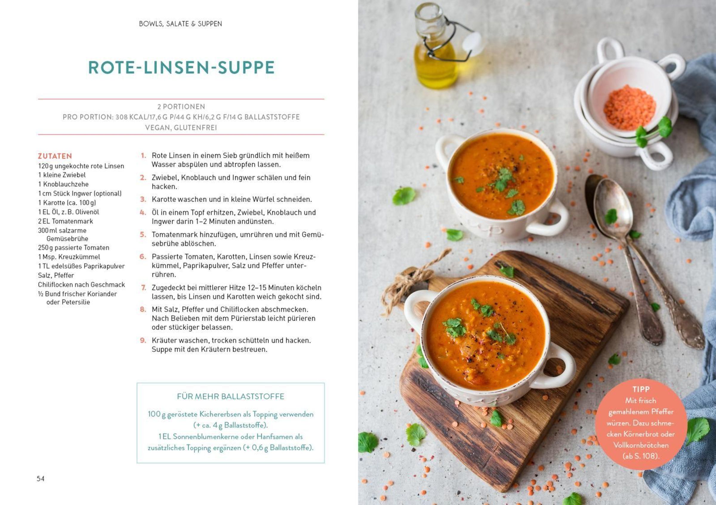 - 40 einfache, köstliche Rezepte mit ballaststoffreichen Lebensmitteln wie Gemüse, Hülsenfrüchten, Vollkorn und gesunden Fetten