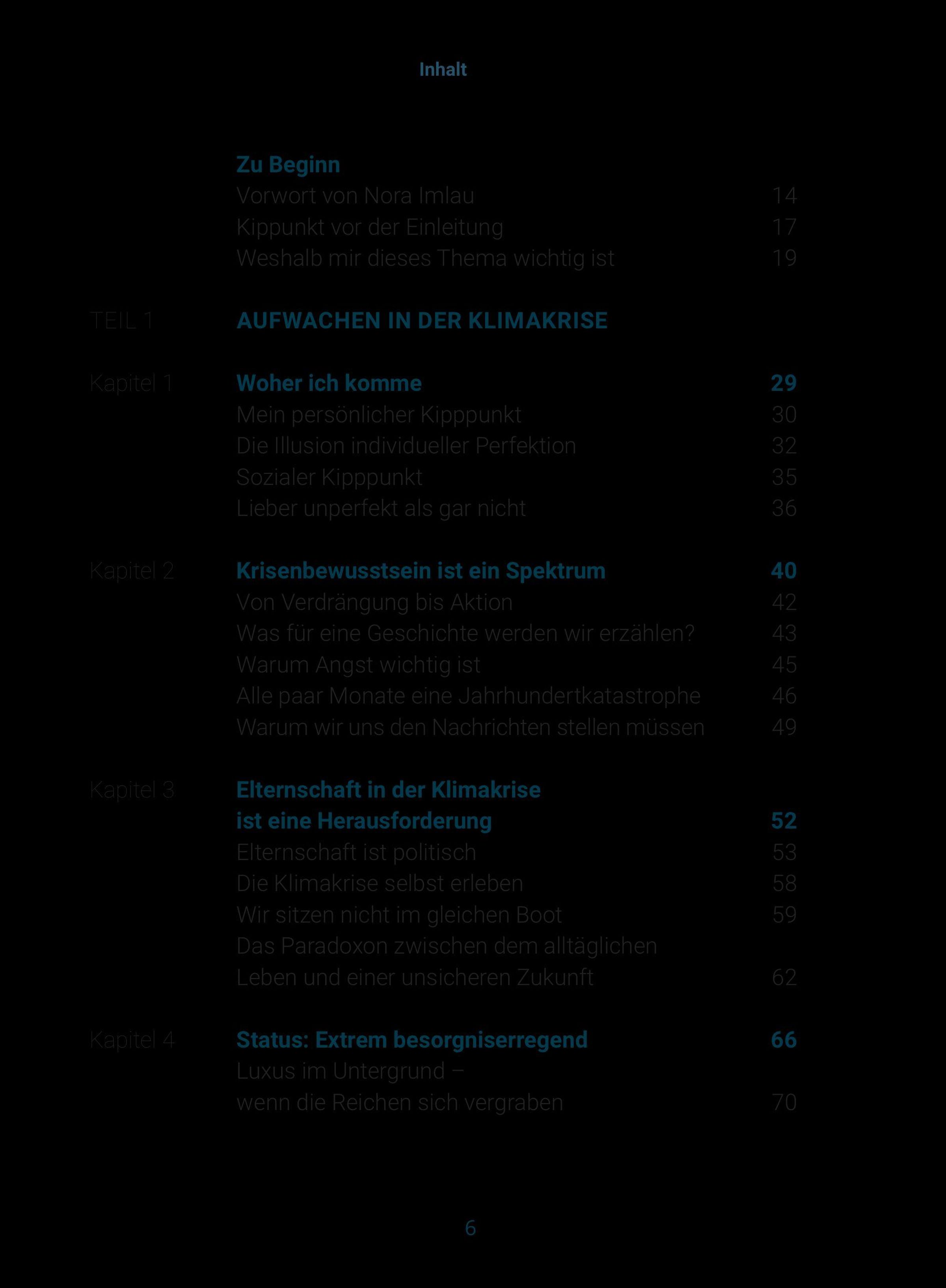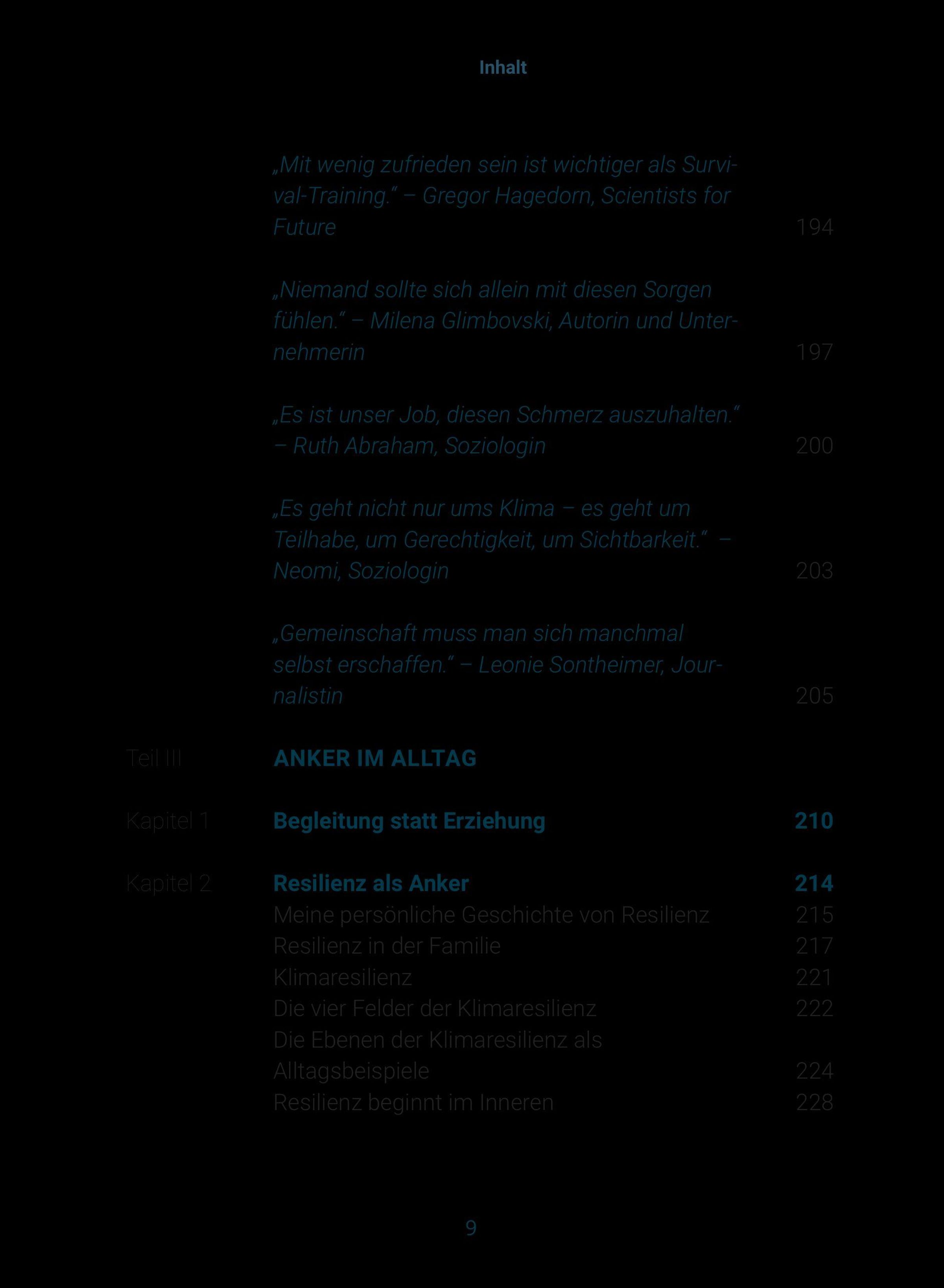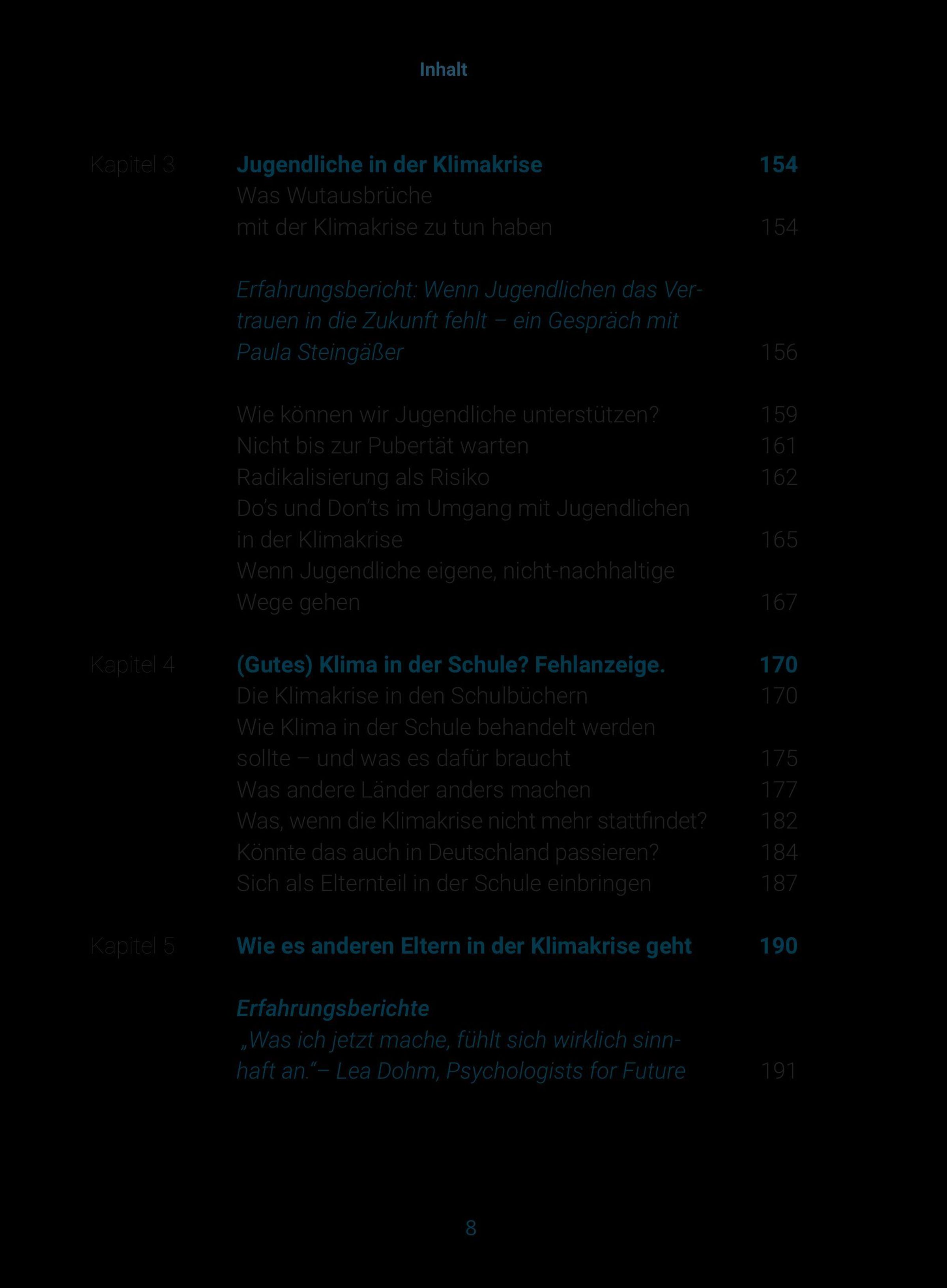 Ergänzt wird das Buch durch Erfahrungsberichte von Personen aus dem Klima- und Bildungsbereich, darunter Milena Glimbovski (Ein guter Plan), Ruth Abraham (Der Kompass) und Lea Dohm (Psychologists for Future).