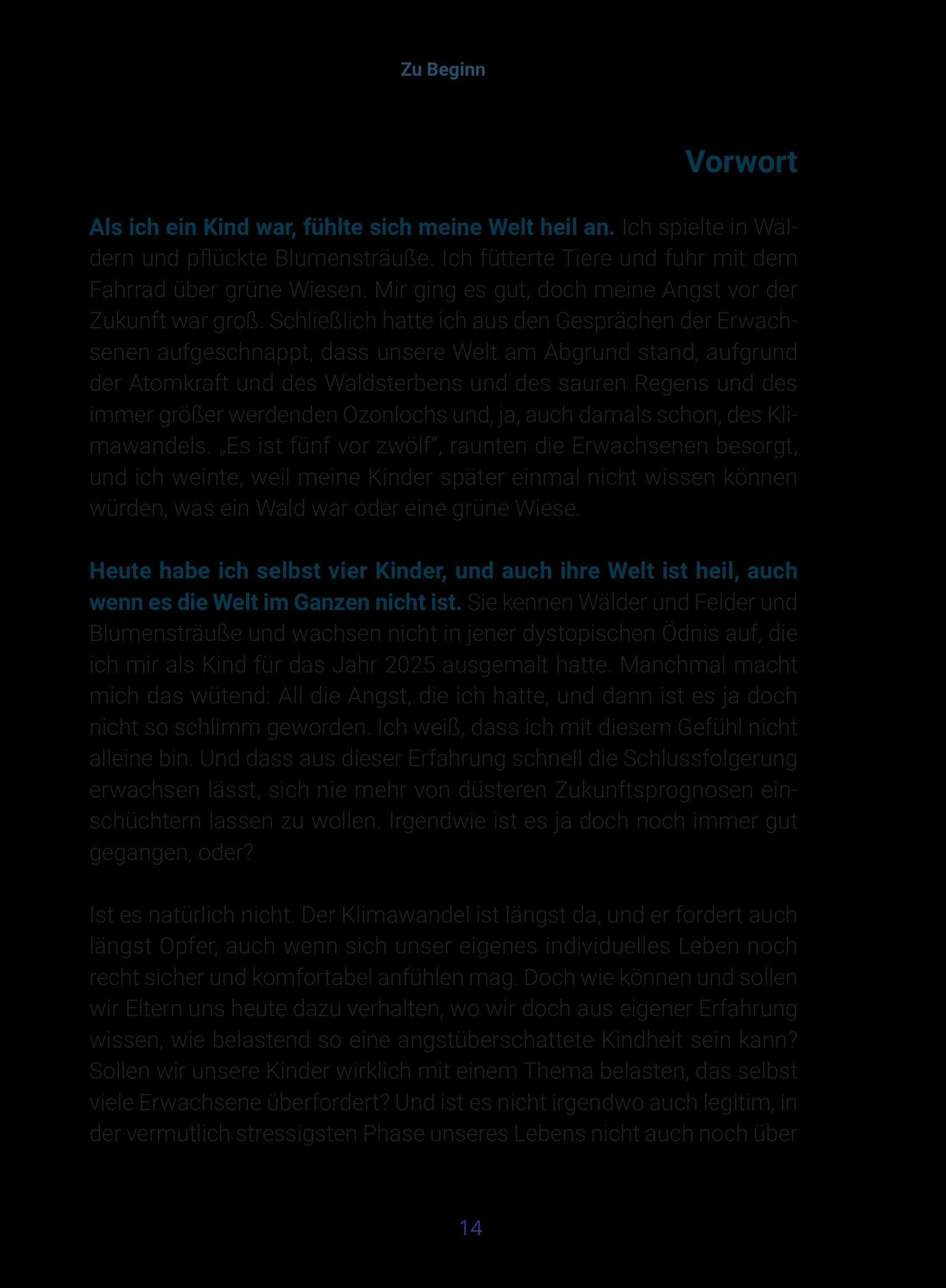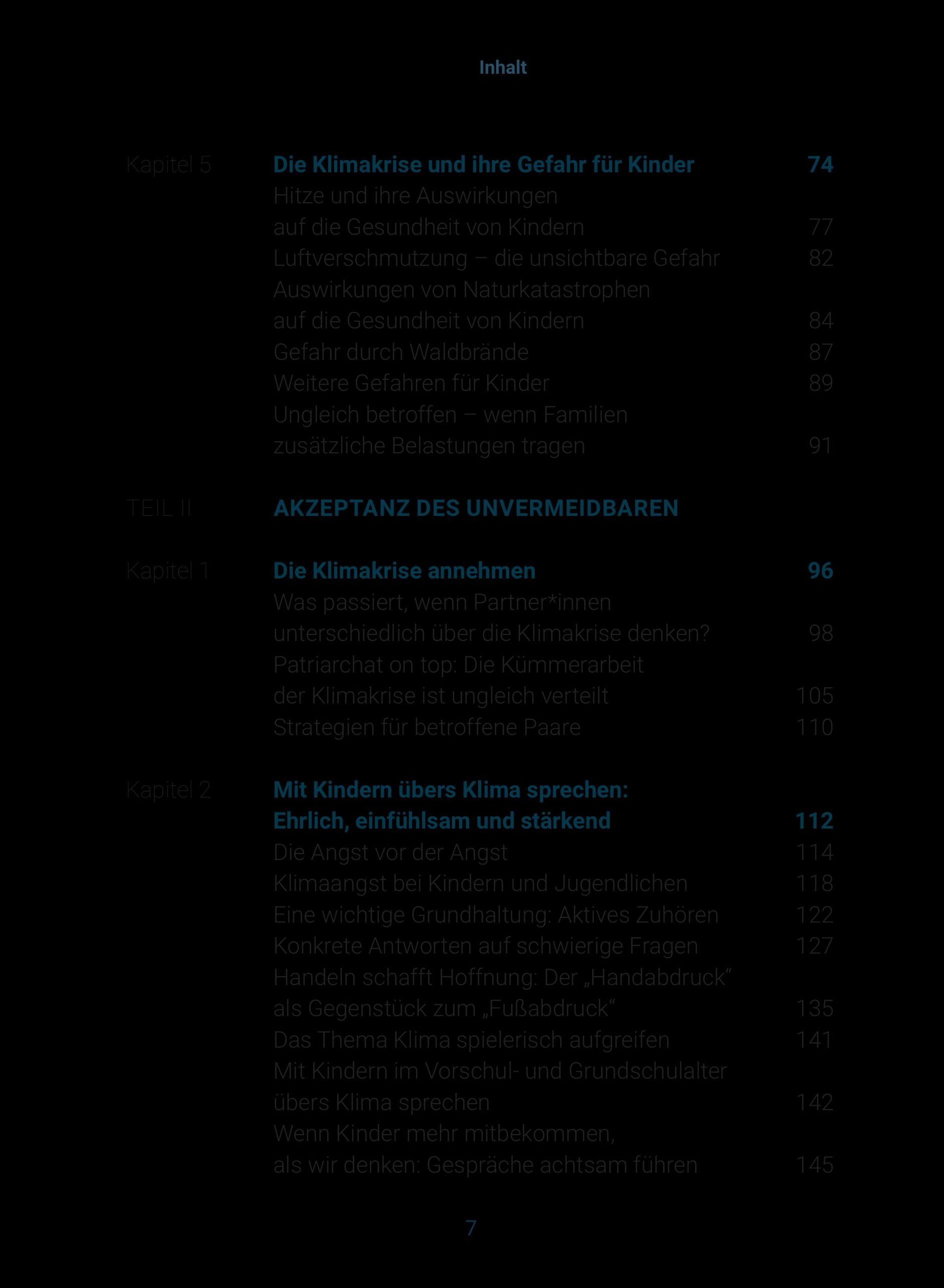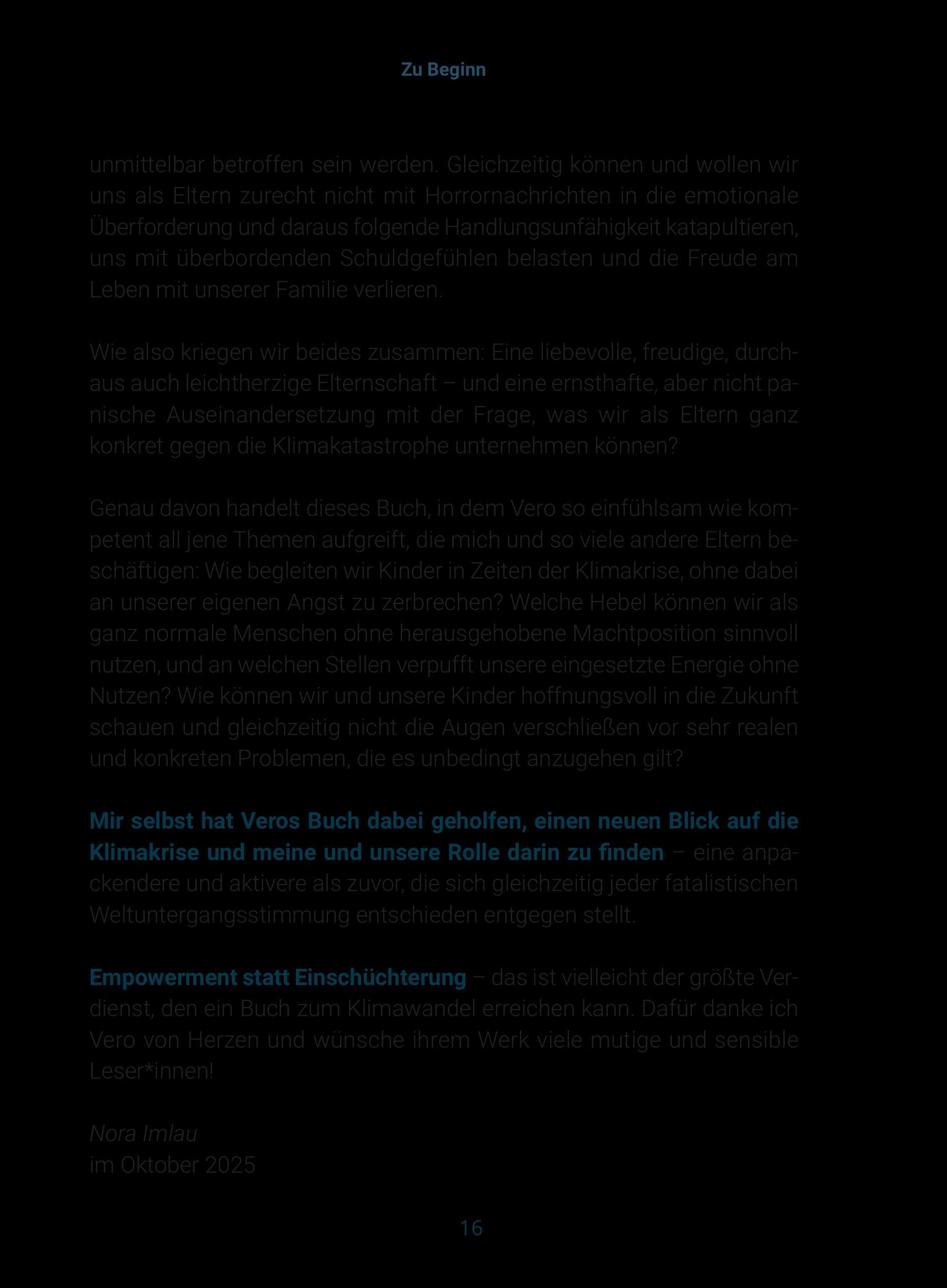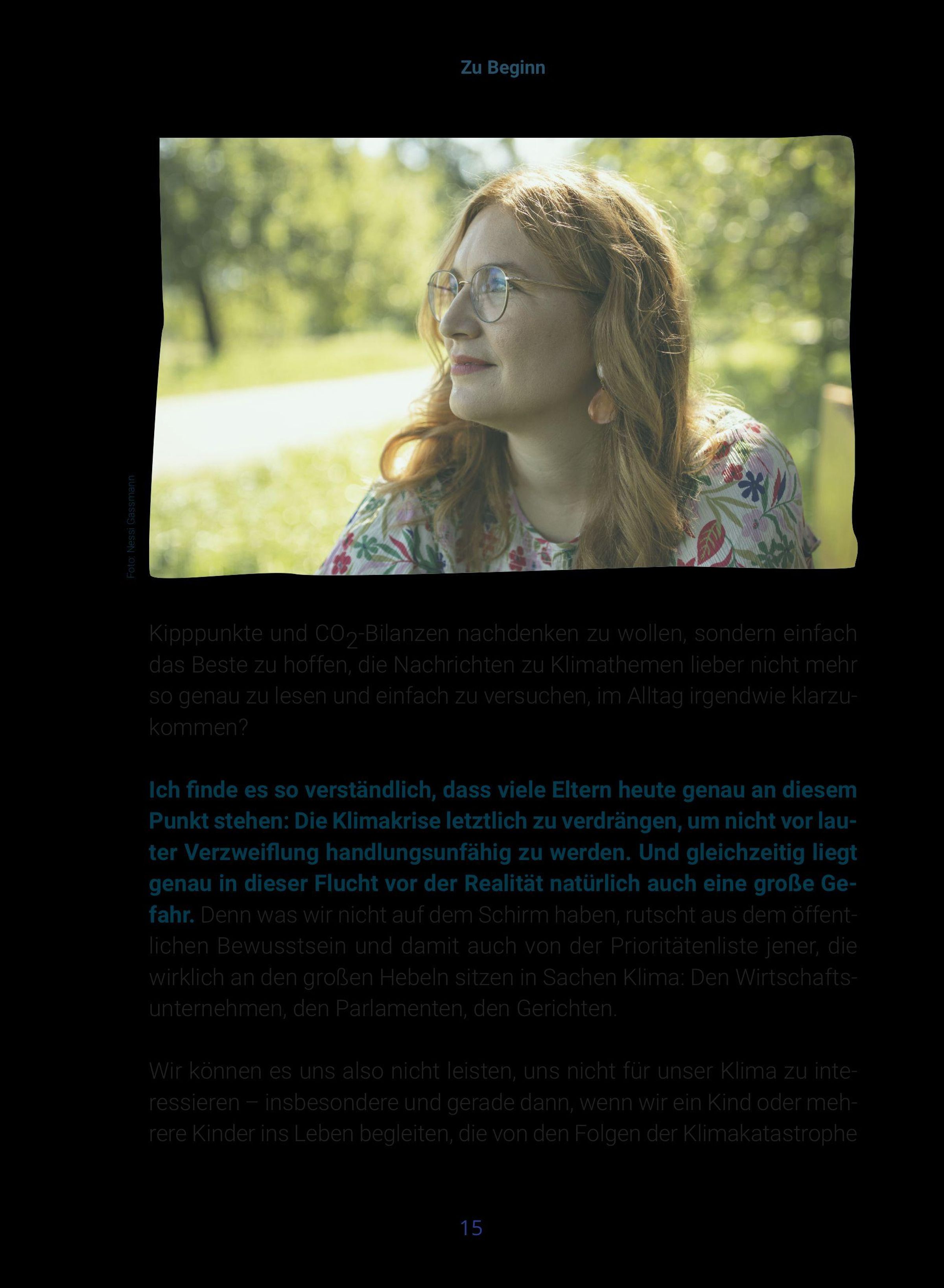 Ergänzt wird das Buch durch Erfahrungsberichte von Personen aus dem Klima- und Bildungsbereich, darunter Milena Glimbovski (Ein guter Plan), Ruth Abraham (Der Kompass) und Lea Dohm (Psychologists for Future).