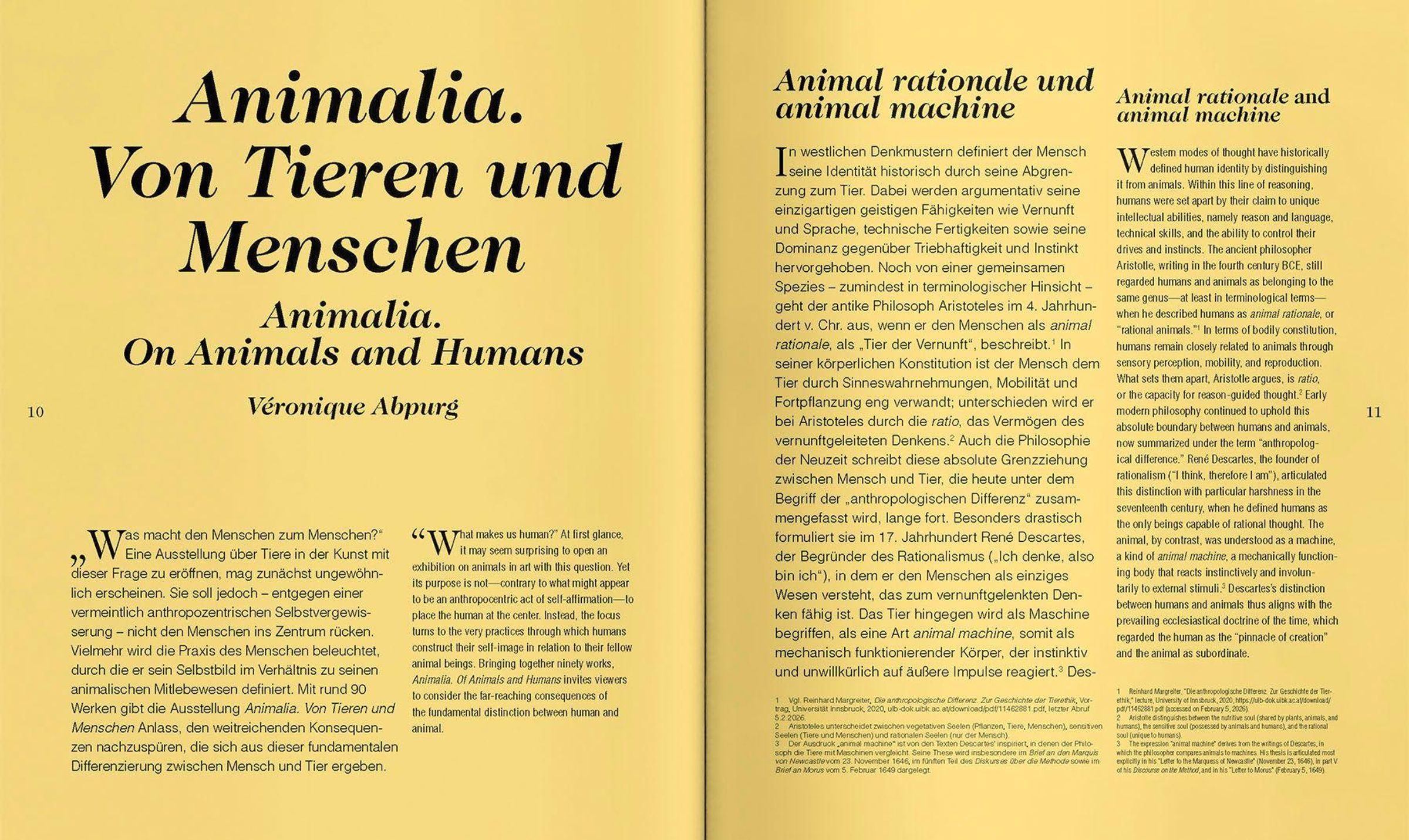 Die Publikation geht der Frage nach, welche sozialen, gesellschaftlichen und historischen Strukturen in den Darstellungen von Tieren eingeschrieben sind. Sie spannen den Bogen von der Idee des "besten Freundes des Menschen" über die Vermenschlichung und Verdinglichung des Tiers bis hin zu seiner Ausbeutung. Gleichzeitig erlaubt die Ausstellung den Ausblick auf ANIMALIA als gedankliches Experiment - über eine gemeinsame biologische Kategorie hinaus - als Prinzip eines gemeinsamen Lebensmodells, das Tiere als Mitgeschöpfe und Mitakteure denkt.