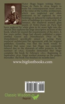 The medieval stained glass panels of Notre-Dame de Paris had been replaced by white glass to let more light into the church. This explains the large descriptive sections of the book, which far exceed the requirements of the story. A few years earlier, Hugo had already published a paper entitled Guerre aux Démolisseurs (War to the Demolishers) specifically aimed at saving Paris' medieval architecture. The agreement with his original publisher, Gosselin, was that the book would be finished that same year, but Hugo was constantly delayed due to the demands of other projects. In the summer of 1830, Gosselin demanded that Hugo complete the book by February 1831. Beginning in September 1830, Hugo worked nonstop on the project thereafter. The book was finished six months later.
