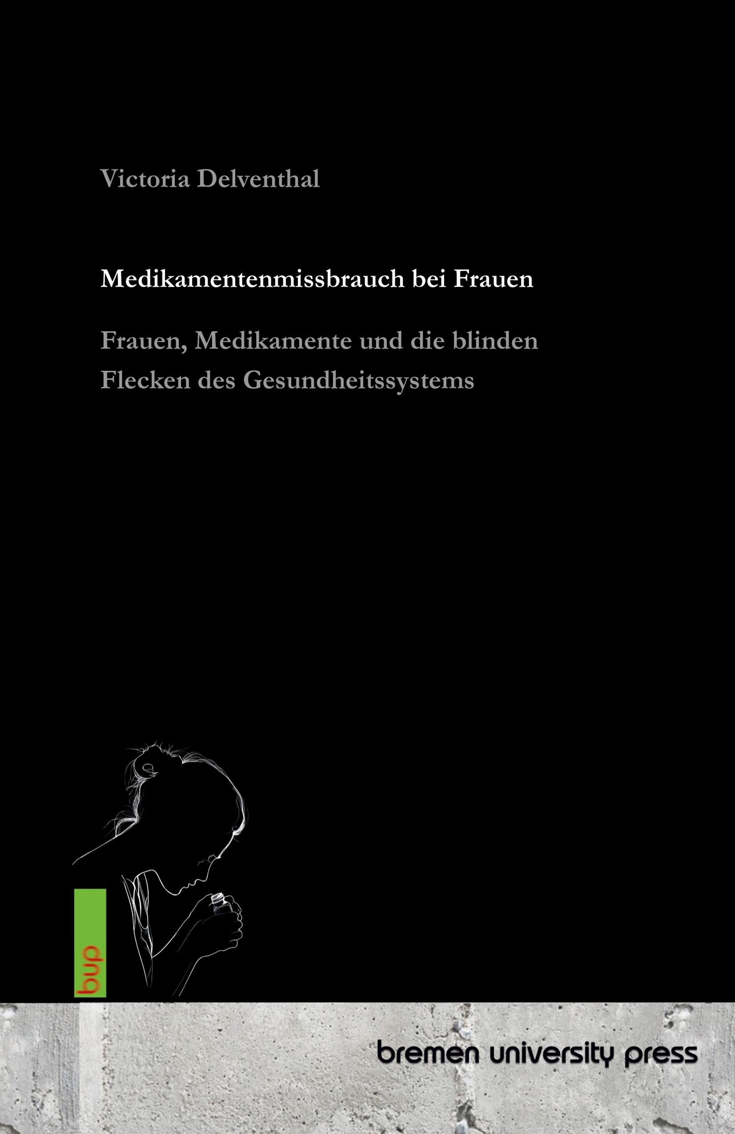 Titel: "Medikamentenmissbrauch bei Frauen". Untertitel: "Frauen, Medikamente und die blinden Flecken des Gesundheitssystems". Unten links eine Silhouette mit einer Tasse. Logo: bup und "bremen university press"., Buch