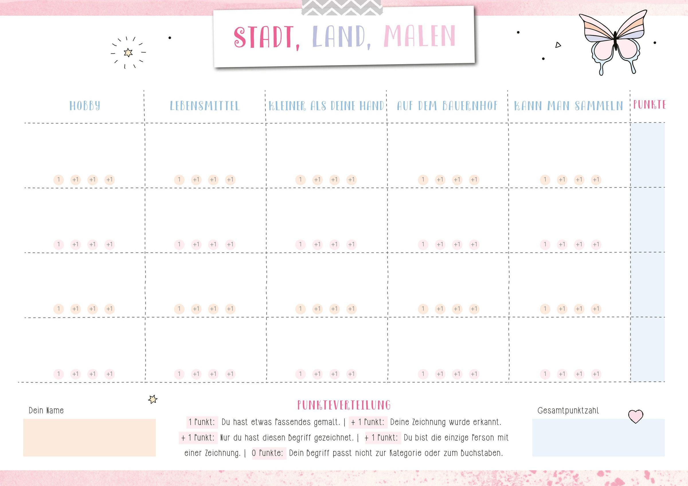 >>Stadt, Land, Fluss<< war gestern - jetzt wird es noch kreativer mit dem neuen Spielblock >>Stadt, Land, Malen<< von ViktoriaSarina! Hol deine Stifte heraus und male blitzschnell eine Zeichnung für jede Kategorie. Je schneller, kreativer und einfallsreicher du bist, desto eher kannst du gewinnen! Ob für Jung oder Alt: Auf 50 Seiten erwarten dich spannende Kategorien wie >>Tiere<<, >>Süßigkeiten<< und >>kann man sammeln<<. Das perfekte Spiel gegen Langeweile - erlebe stundenlangen Spaß mit deinen Besties!