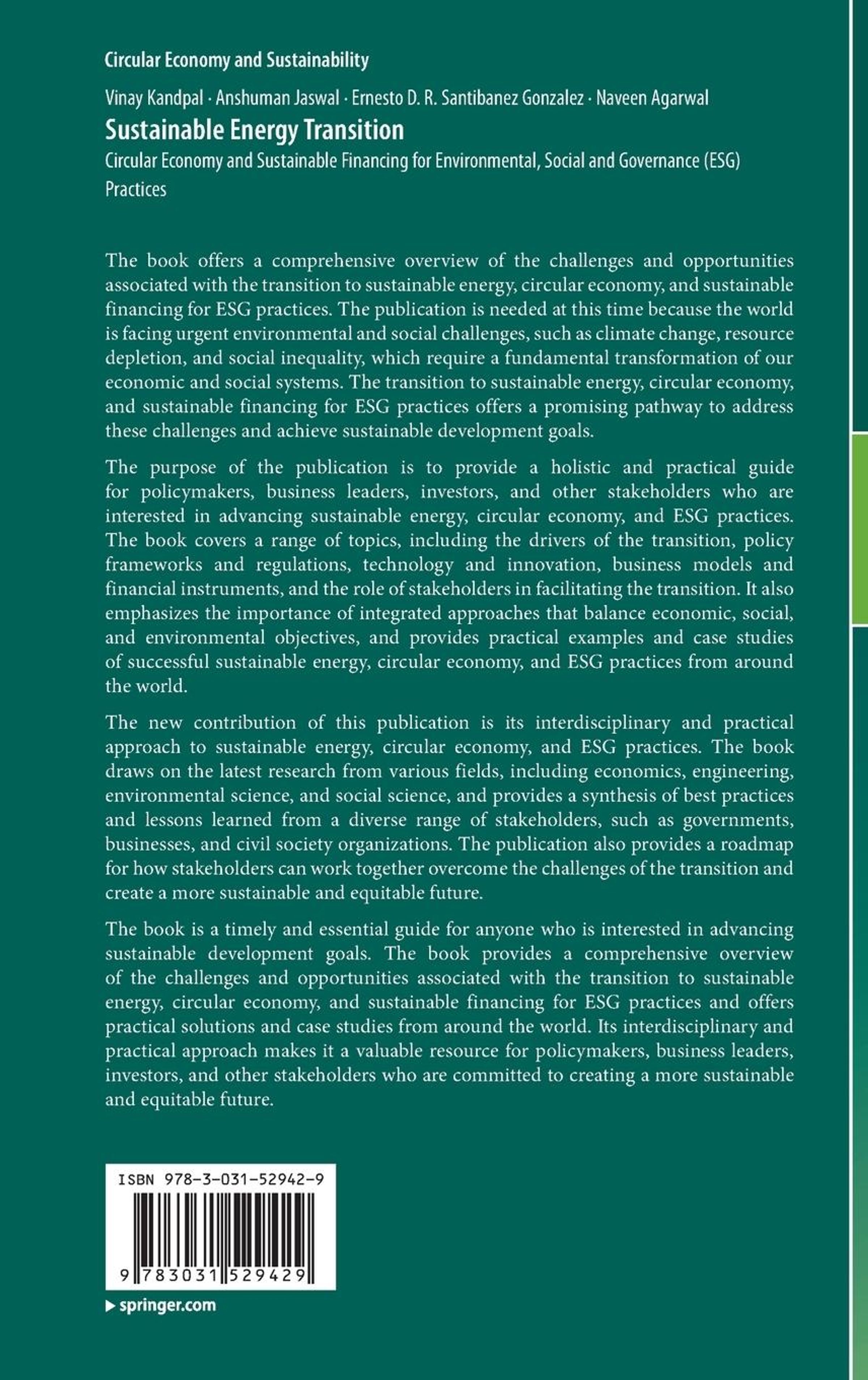 The book offers a comprehensive overview of the challenges and opportunities associated with the transition to sustainable energy, circular economy, and sustainable financing for ESG practices. The publication is needed at this time because the world is facing urgent environmental and social challenges, such as climate change, resource depletion, and social inequality, which require a fundamental transformation of our economic and social systems. The transition to sustainable energy, circular economy, and sustainable financing for ESG practices offers a promising pathway to address these challenges and achieve sustainable development goals. The purpose of the publication is to provide a holistic and practical guide for policymakers, business leaders, investors, and other stakeholders who are interested in advancing sustainable energy, circular economy, and ESG practices. The book covers a range of topics, including the drivers of the transition, policy frameworks and regulations, technology and innovation, business models and financial instruments, and the role of stakeholders in facilitating the transition. It also emphasizes the importance of integrated approaches that balance economic, social, and environmental objectives, and provides practical examples and case studies of successful sustainable energy, circular economy, and ESG practices from around the world. The new contribution of this publication is its interdisciplinary and practical approach to sustainable energy, circular economy, and ESG practices. The book draws on the latest research from various fields, including economics, engineering, environmental science, and social science, and provides a synthesis of best practices and lessons learned from a diverse range of stakeholders, such as governments, businesses, and civil society organizations. The publication also provides a roadmap for how stakeholders can work together overcome the challenges of the transition and create a more sustainable and equitable future. The book is a timely and essential guide for anyone who is interested in advancing sustainable development goals. The book provides a comprehensive overview of the challenges and opportunities associated with the transition to sustainable energy, circular economy, and sustainable financing for ESG practices and offers practical solutions and case studies from around the world. Its interdisciplinary and practical approach makes it a valuable resource for policymakers, business leaders, investors, and other stakeholders who are committed to creating a more sustainable and equitable future.