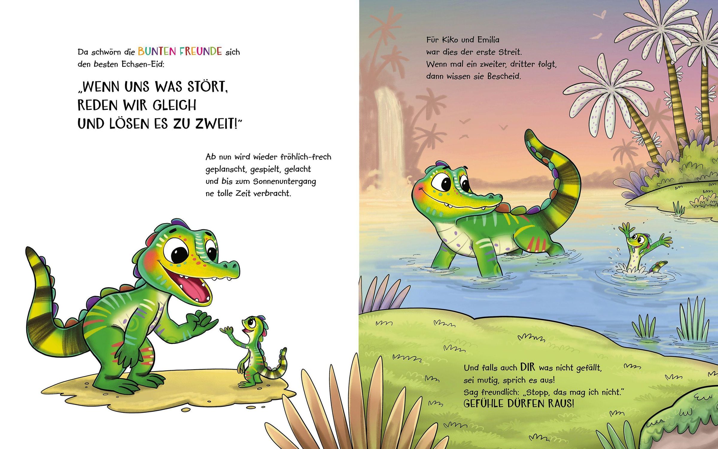 Das kunterbunte Krokodil Kiko und die kleine Eidechse Emmi sind allerbeste Freunde und haben jede Menge Spaß zusammen. Da Emmi nicht schwimmen kann, reitet sie oft auf Kikos Rücken übers Wasser. Als sie es dort mal wieder etwas zu wild treibt, wird es Kiko zu bunt: