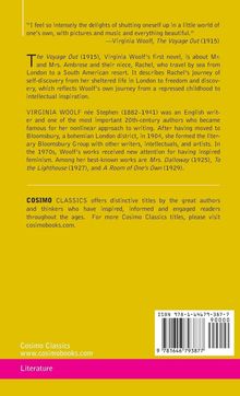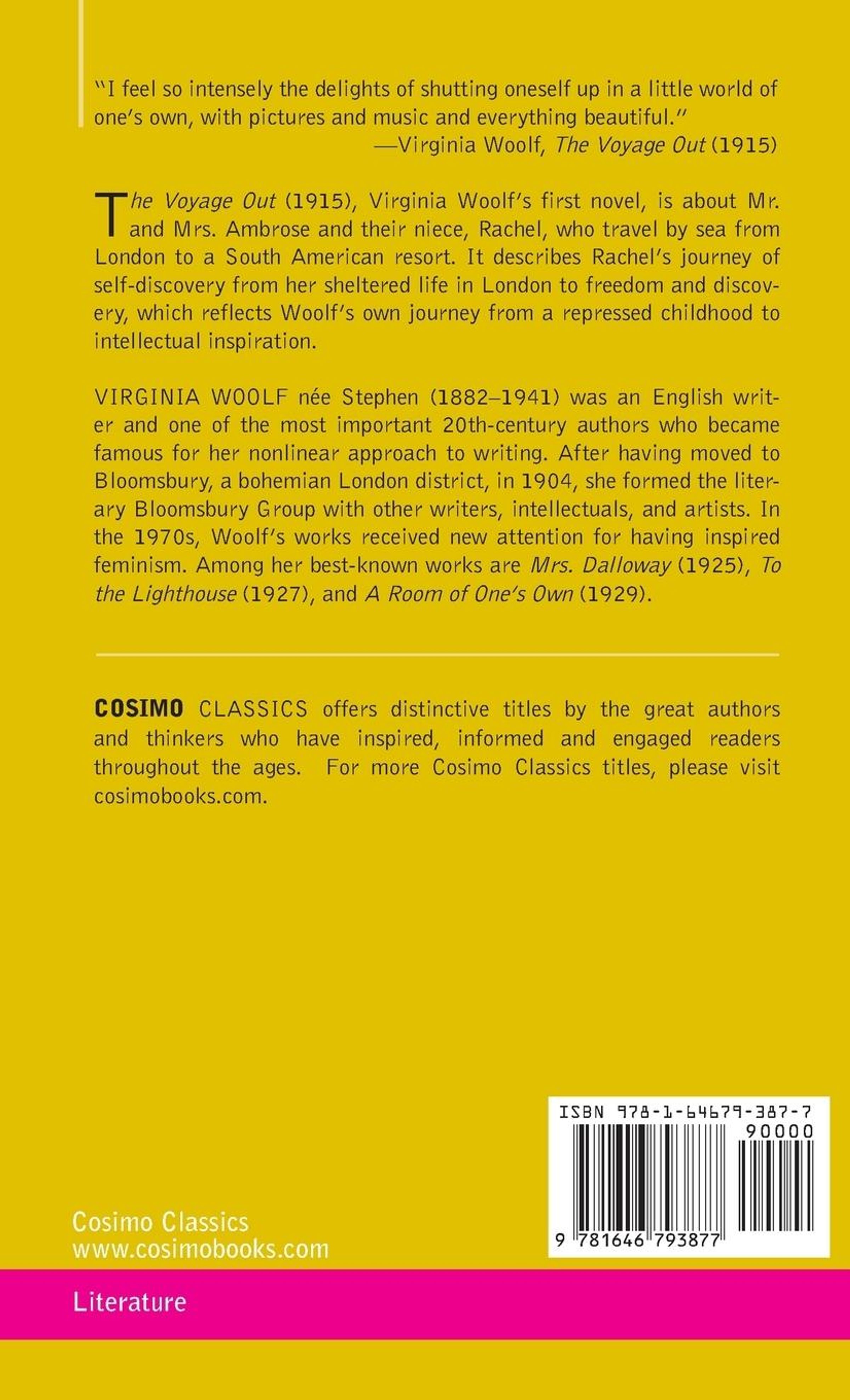 The Voyage Out (1915), Virginia Woolf's first novel, is about Mr. and Mrs. Ambrose and their niece, Rachel, who travel by sea from London to a South American resort. It describes Rachel's journey of self-discovery from her sheltered life in London to freedom and discovery, which reflects Woolf's own journey from a repressed childhood to intellectual inspiration.