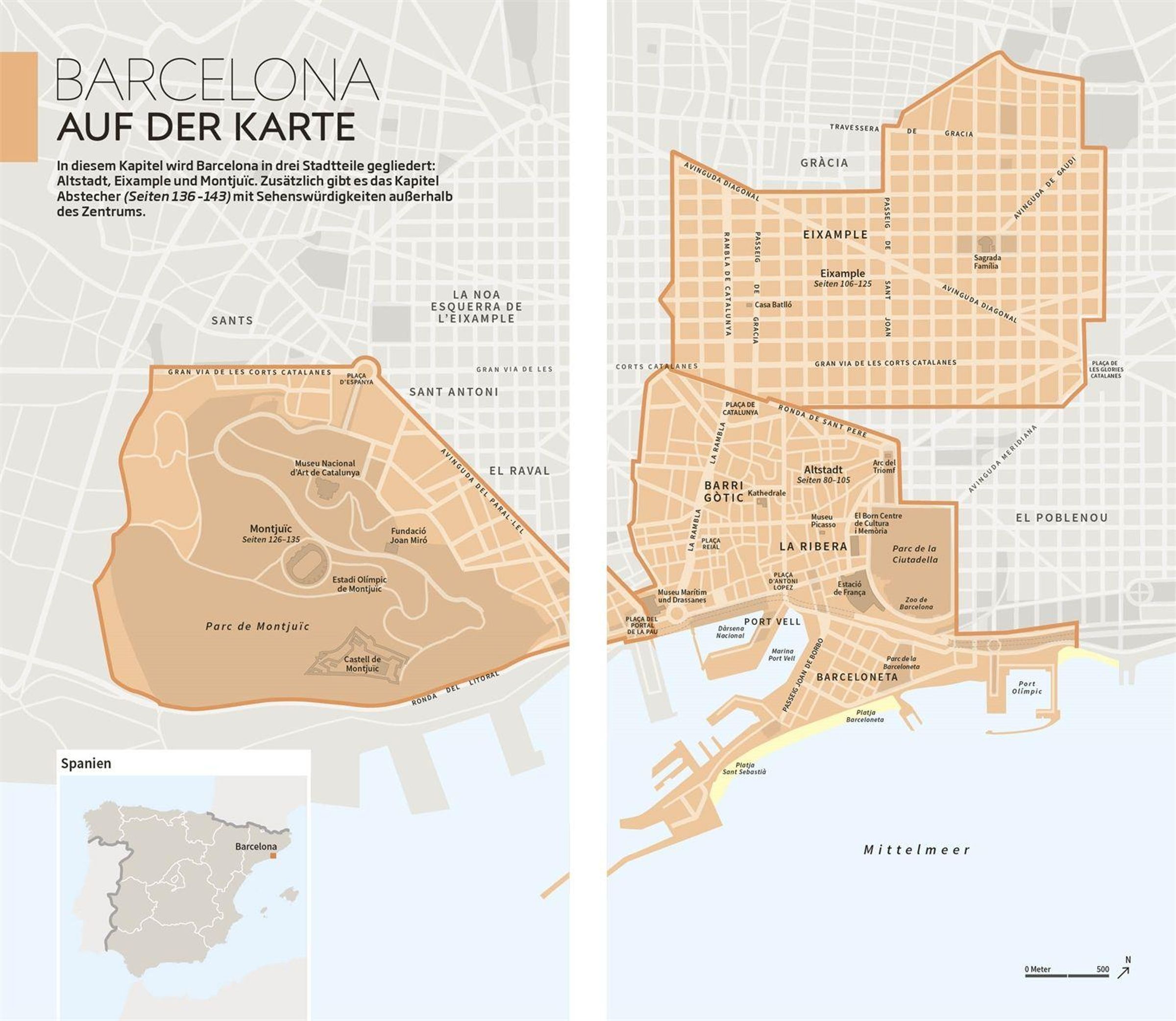 Die einzigartigen 3-D-Illustrationen der Vis-à-Vis Bände bieten Ihnen ganz neue Einblicke in berühmte Gebäude und Sehenswürdigkeiten, darunter die Alhambra in Granada oder die monumentale Kathedrale von Santiago de Compostela. Mit Tourenvorschlägen und handgezeichneten Spaziergängen entdecken Sie faszinierende Landschaften wie die Costa Brava oder Stadtteile wie Barcelonas Barri Gótic auf ganz besondere Art und Weise. Bildgewaltige Themenseiten rücken charakteristische Besonderheiten in den Fokus, wie die spanische Architektur, kulinarische Highlights oder typische Outdoor-Aktivitäten.