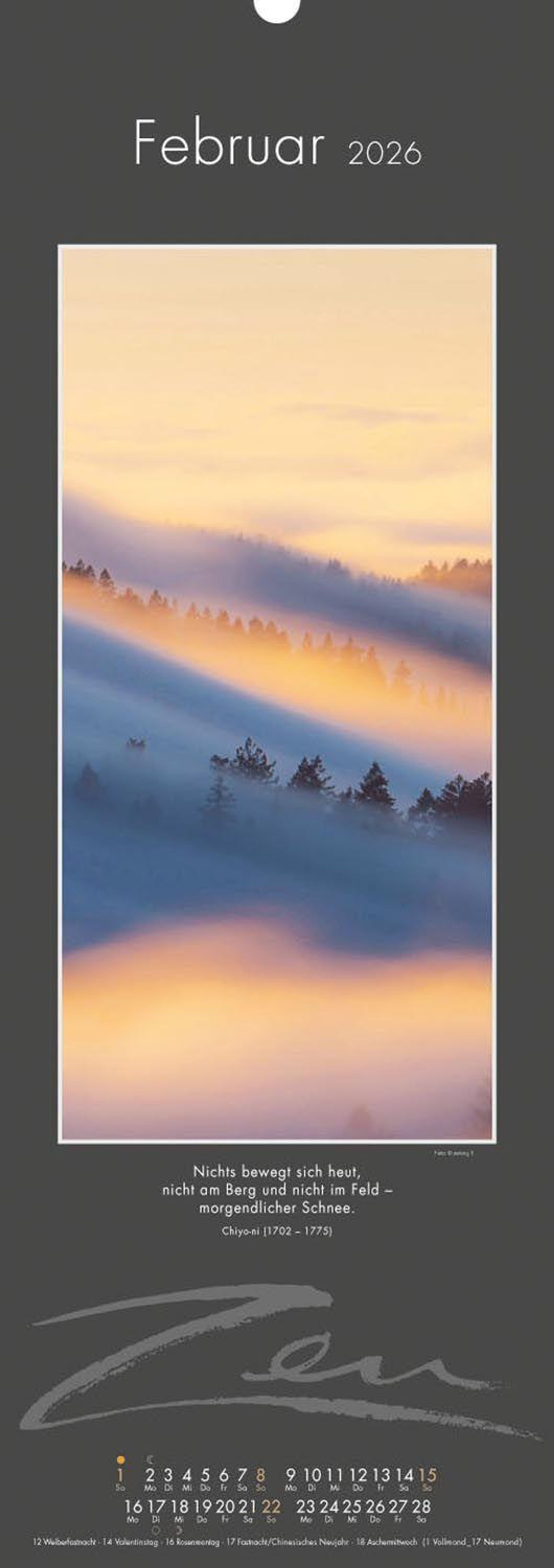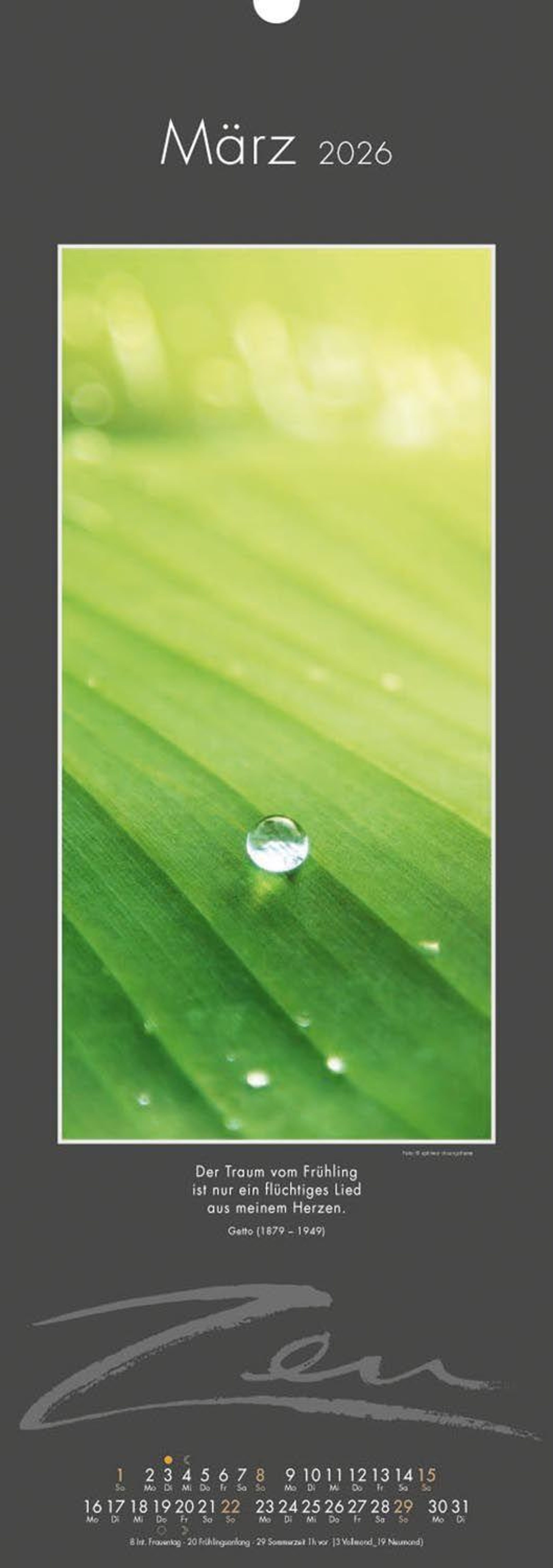 - Hochwertiger Wandkalender, 12 Zen-Bilder, Gräser, Blüten, Steine, Zen-Gärten, meditative Objekte, Titelblatt aus Transparentpapier mit Handschrift, Zen-Gedichte und Haiku, Spiralbindung, Rückseite mit