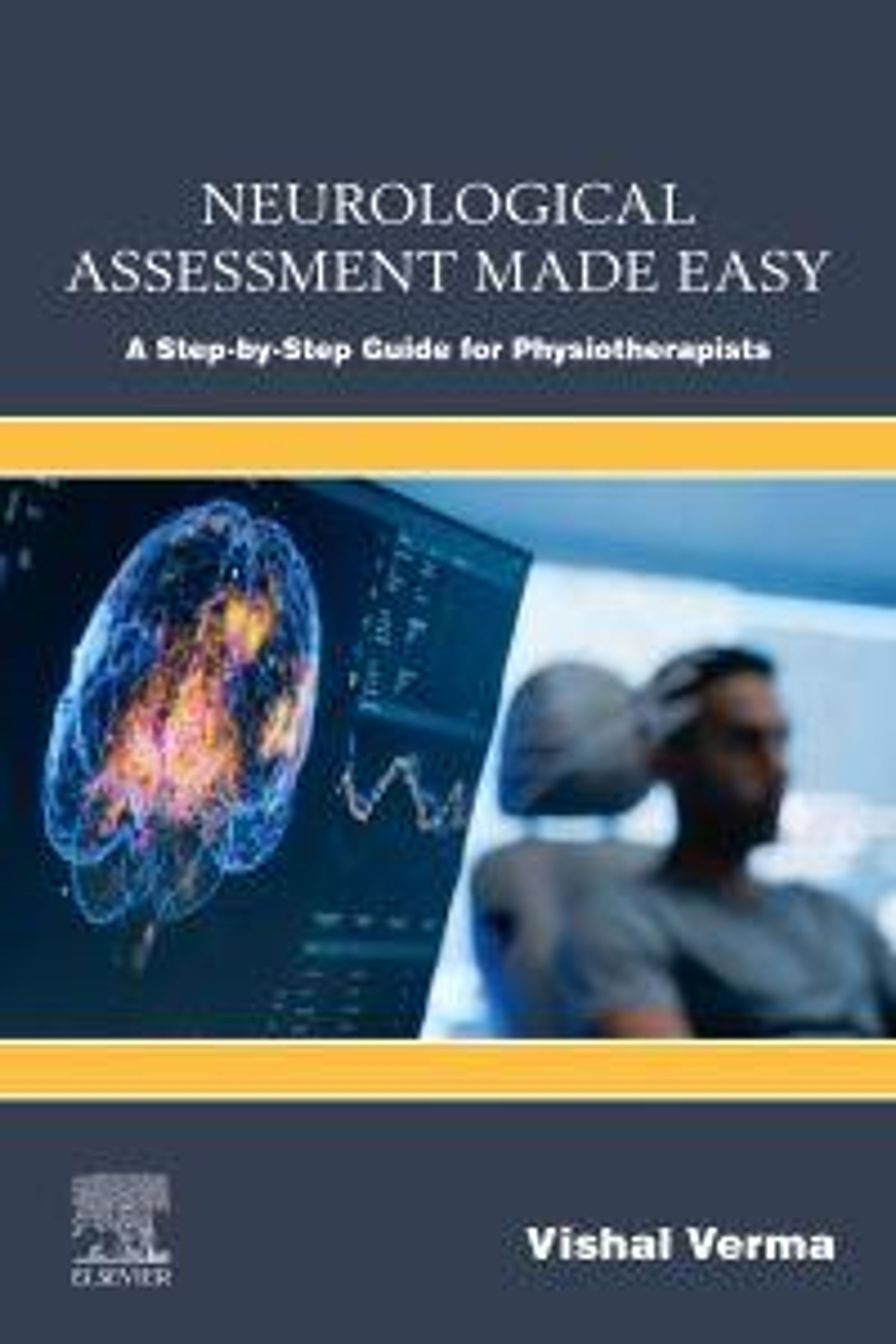 Text oben: "NEUROLOGICAL ASSESSMENT MADE EASY". Darunter ein Gehirnscan und ein Mann im Hintergrund unscharf., Buch