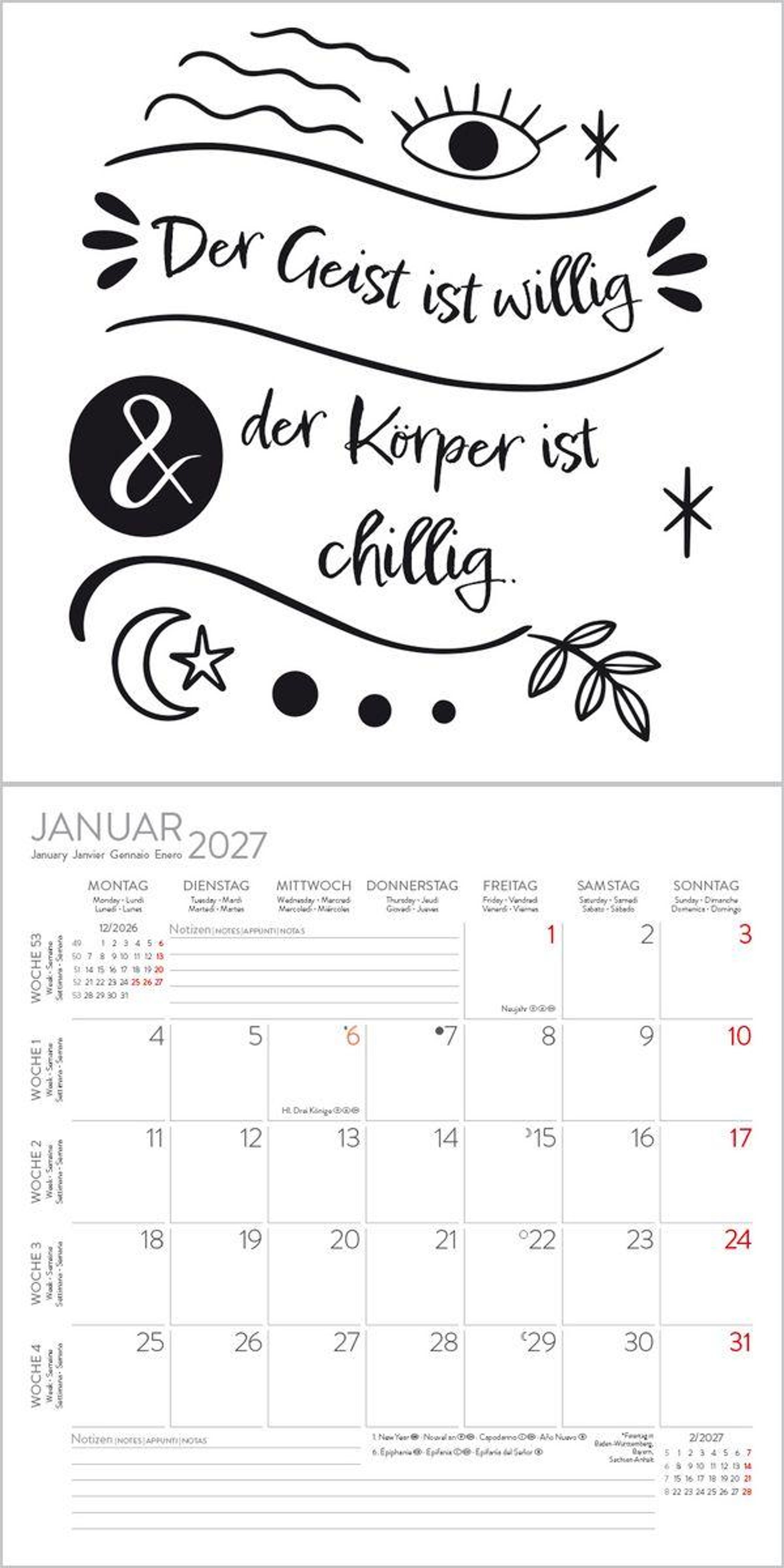 Wandkalender im Format: 30 x 30 cm; Offenes Format: 30 x 60 cm; umweltfreundliches FSC Papier Jede Kalenderseite mit großem Bild und viel Platz im Kalendarium für Notizen und Termine Mehrsprachiges Kalendarium: DE/GB/FR/IT/ES mit Feiertagen für D/A/CH/GB/FR/IT/ES Regionale Ferienzeiten für DE/A/CH Monatsübersicht für den jeweiligen Vor- und Nachmonat; Jahresübersicht