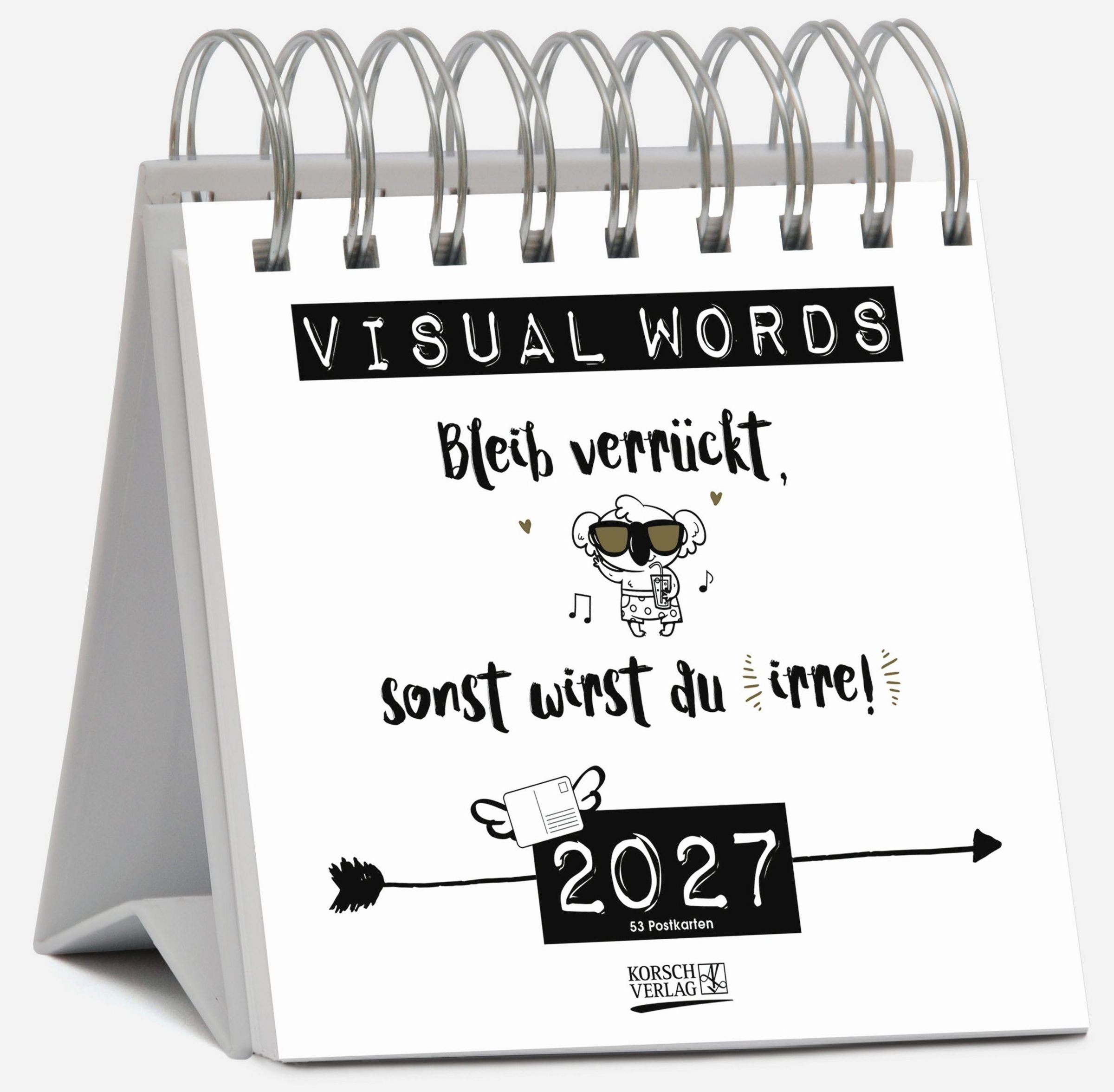 "Bleib verrückt, sonst wirst du irre!" Illustration: Figur mit Sonnenbrille und Musiknoten. Text: "2027", "VISUAL WORDS"., Kalender