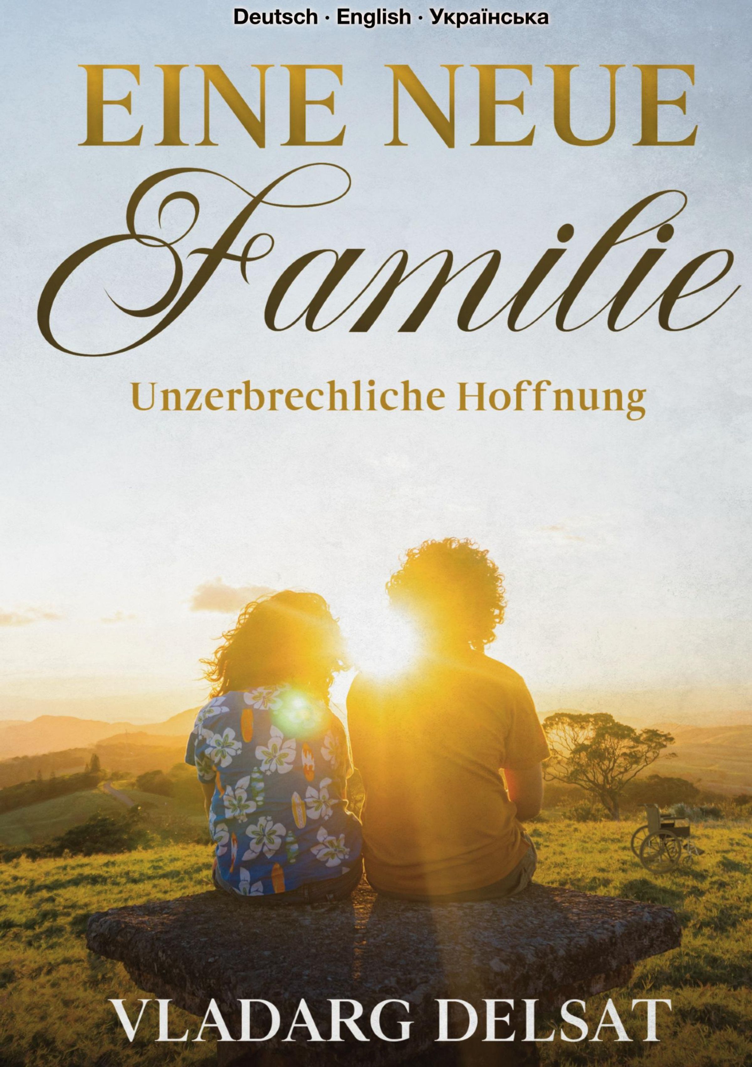 „EINE NEUE Familie. Unzerbrechliche Hoffnung. VLADARG DELSAT.“ Zwei Menschen sitzen auf einer Bank bei Sonnenuntergang., Buch