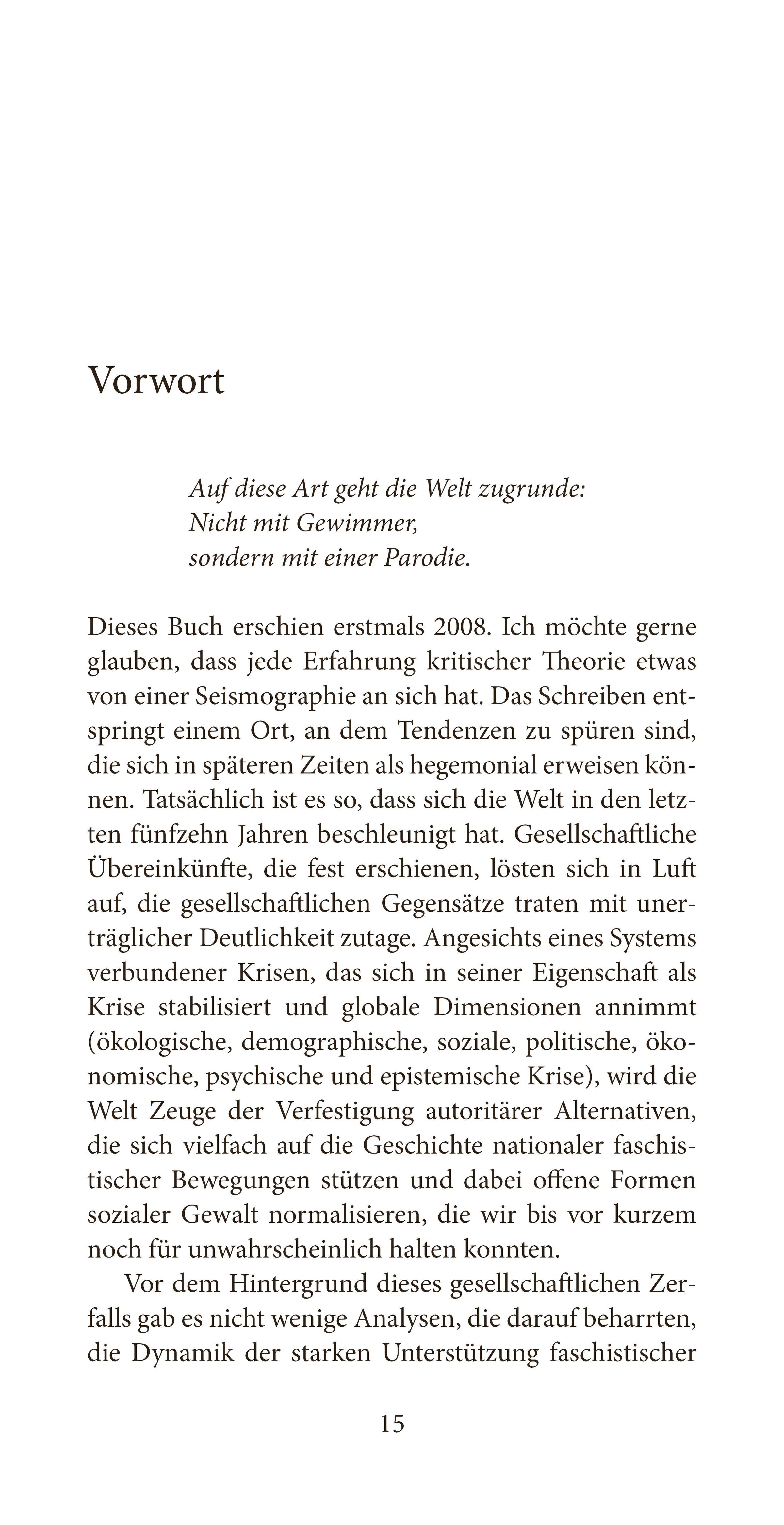 Warum gelingt es autoritären Bewegungen heute so leicht, liberale Demokratien zu unterwandern? Der Philosoph und Psychoanalytiker Vladimir Safatle, einer der bekanntesten Intellektuellen Brasiliens und Protagonist des Widerstands gegen die Regierung Bolsonaro, liefert eine bestechende Diagnose: Der ¿neue Faschismus¿ ist nicht einfach ein Rückfall in archaische Gesellschaftsmuster; seine Wirksamkeit beruht vielmehr auf der Verallgemeinerung einer neuen, zynischen Form der Rationalität, die sich in den liberalen Demokratien selbst herausgebildet hat. Zynismus ist damit nicht nur als rhetorische Figur zu verstehen oder als eine subjektive, moralisch verwerfliche Haltung; er bildet vielmehr die rationale Struktur einer Gesellschaft im Zerfall, die im uneigentlichen Sprechen, in der selbstironischen Verleugnung ihre Überlebensstrategie gefunden hat.