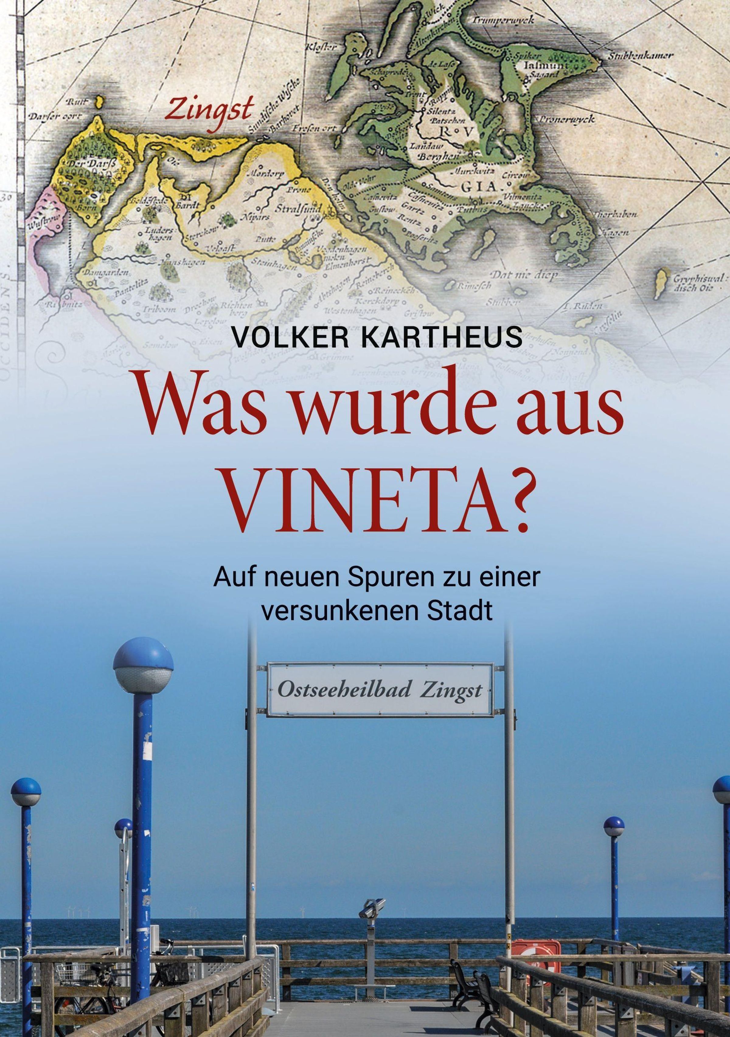 "Was wurde aus VINETA?" Text über historische Karte, unten ein Foto von einer Seebrücke mit Schild "Ostseeheilbad Zingst"., Buch