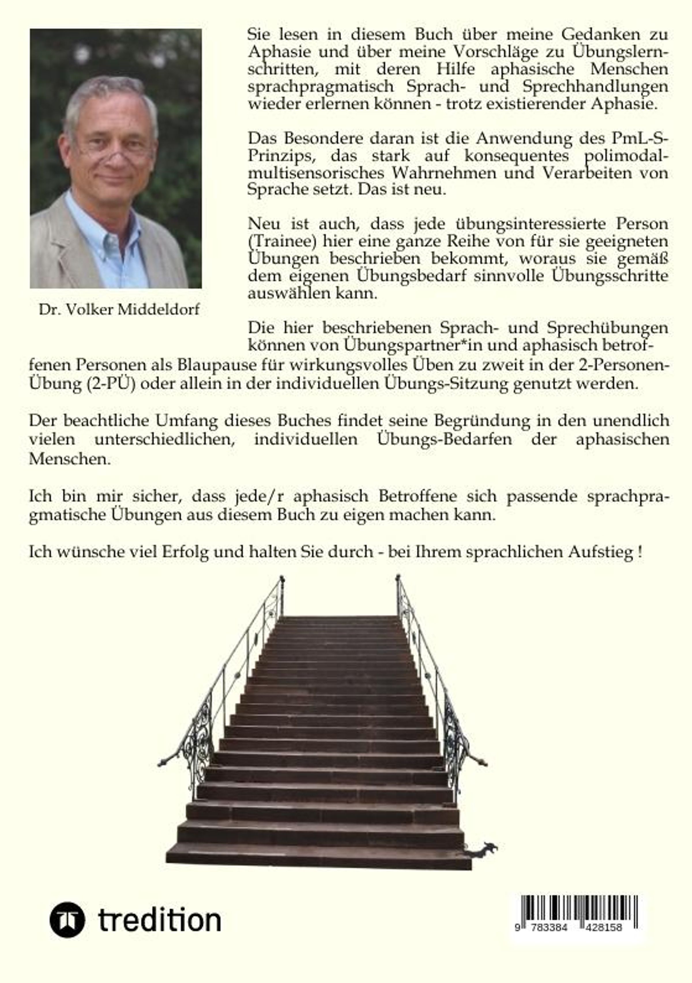 Da zur Zeit keine Aufstockung der Therapie-Sitzungszahlen auf Rezept systemisch zu erwarten ist und somit unter deshalb unter normalen Umständen die Betroffenen auch keine Therapie-Wirkungsverbesserung erwarten können, appellier ich an alle aphasisch Betroffenen und ihre Angehörigen: Werdet privat mit Übungspartner*in oder autodidaktisch über einen längeren Zeitraum mit sprachlichen Übungen aktiv, und zwar zusätzlich zur Therapie bei der Logopädin. Nehmen Sie dieses Buch in die Hand. Darin lesen Sie Handlungsempfehlungen, die Ihnen helfen, Sprach- und Sprechfähigkeiten pragmatisch neu zu lernen und wirksame Schritte aus dem Schweigen zu gehen. In diesem Buch beschreibe ich Übungen in Blaupausen-Format, mit dem Sie eine Übungssitzung sinnvoll gestalten können. Übungen für jeden sprach- und sprechhandlungsbezogenen Übungs-Bedarf. Lassen Sie sich nicht von der Dicke des Buches abschrecken. Die kommt dadurch zustande, dass ich vielen Übungsbedarfen bei sehr unterschiedlichen und individuellen aphasischen Störungsbildern mit ebenso unterschiedlichen Übungs-Angeboten gerecht werden wollte.
