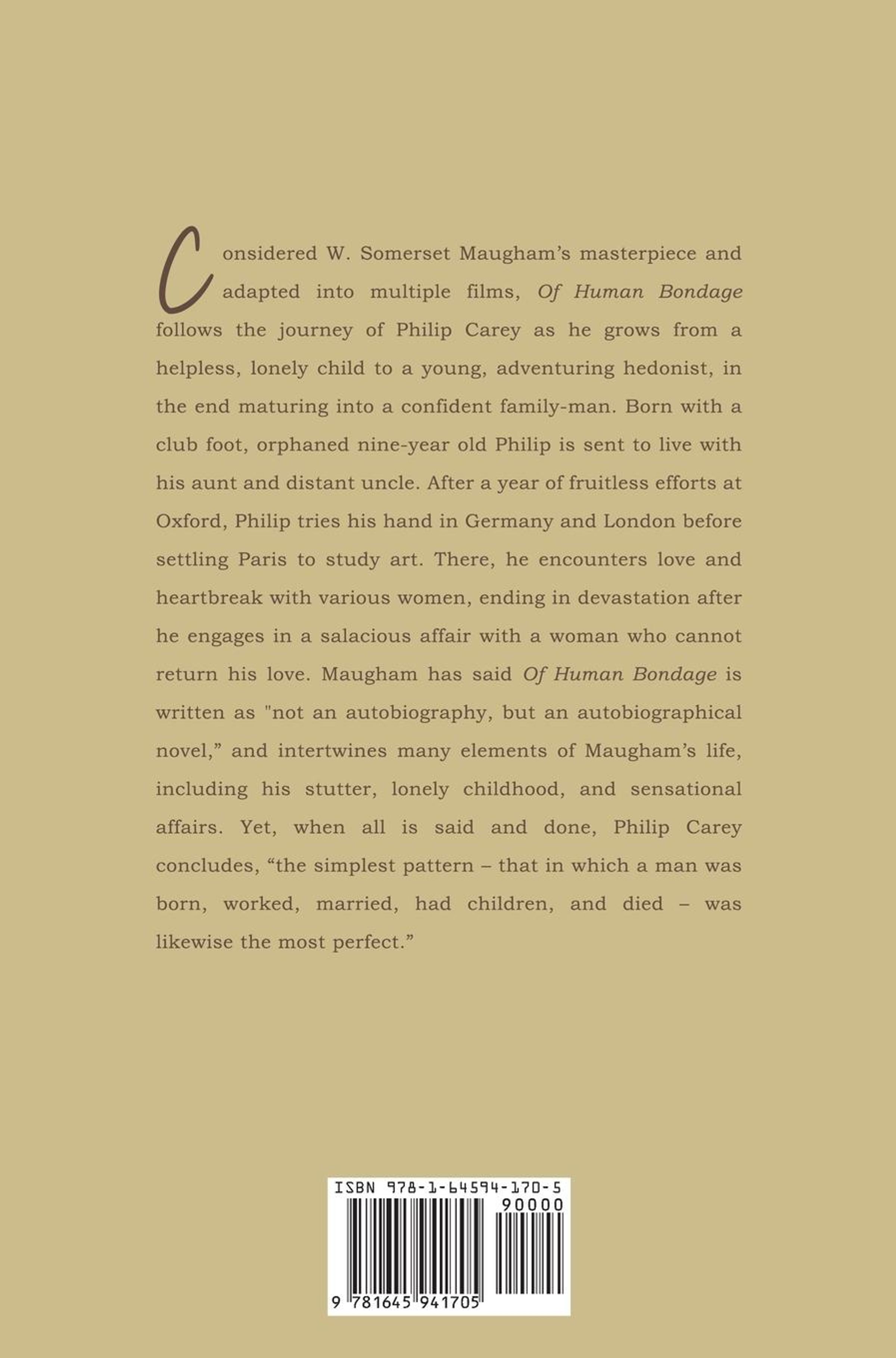 Considered to be W. Somerset Maugham's masterpiece and adapted into multiple films, Of Human Bondage follows the journey of Philip Carey as he grows from a helpless, lonely child to a young, adventuring hedonist, in the end maturing into a confident family-man. Born with a club foot, orphaned nine-year old Philip is sent to live with his aunt and distant uncle. After a year of fruitless efforts at Oxford, Philip tries his hand in Germany and London before settling Paris to study art. There, he encounters love and heartbreak with various women, ending in devastation after he engages in a salacious affair with a woman who cannot return his love. Maugham has said Of Human Bondage is written as "not an autobiography, but an autobiographical novel," and intertwines many elements of Maugham's life, including his stutter, lonely childhood, and sensational affairs. Yet, when all is said and done, Philip Carey concludes, "the simplest pattern - that in which a man was born, worked, married, had children, and died - was likewise the most perfect."
