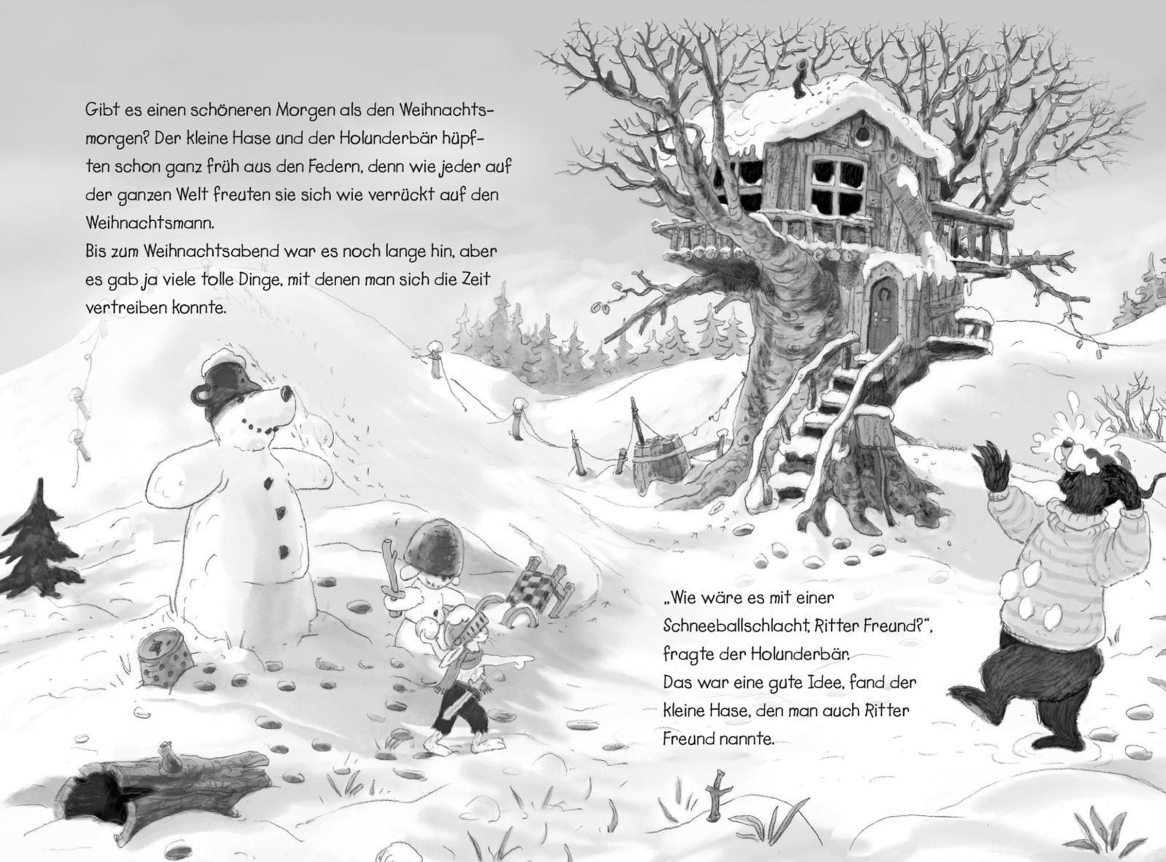 Was ist schöner, als die Weihnachtszeit im Winterwald zu verbringen? Nichts, da sind Hase und Holunderbär sich einig! Alles ist von weiß glitzerndem Schnee bedeckt, der sich auch noch wunderbar für Schneeballschlachten eignet. Aber was wäre die schönste Zeit des Jahres ohne ein paar Turbulenzen? So helfen die beiden Freunde dem dicken Hasen Jakob, dessen Bau kurz vor dem Fest unter der Schneedecke zusammenbricht und unternehmen eine aufregende Reise durch den Winterwald, um dem Weihnachtsmann einen Brief zu überbringen. Eines ist aber sicher - mit Hase, Holunderbär und ihren Freunden wird das Weihnachtsfest immer ein richtiger Erfolg.