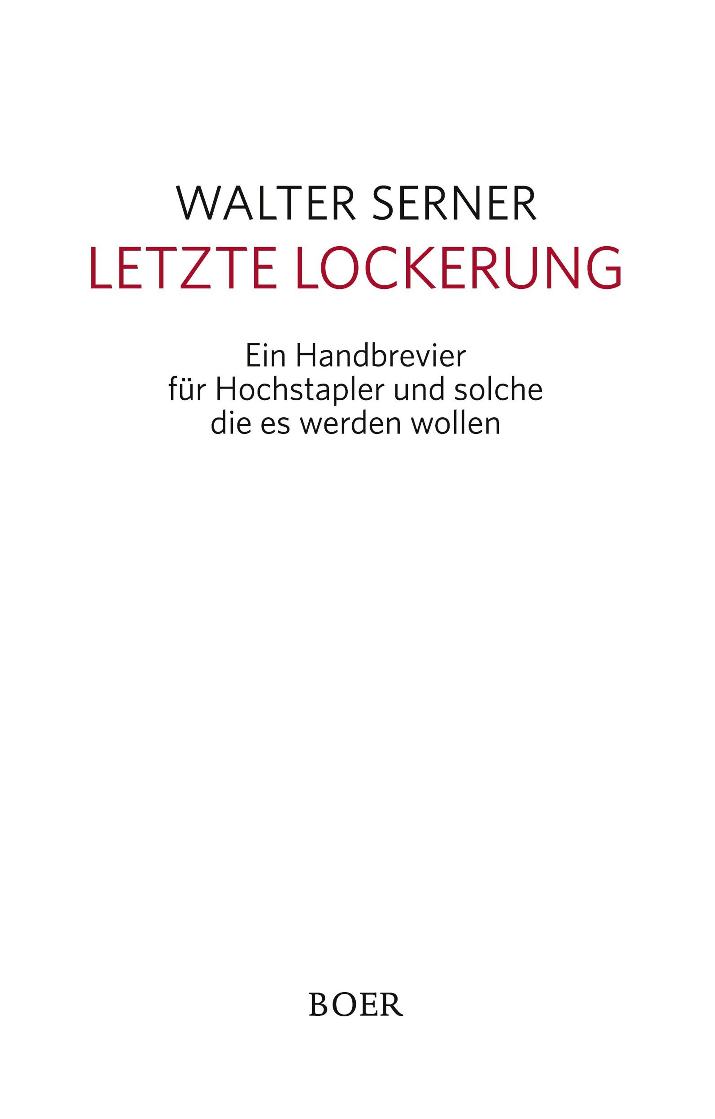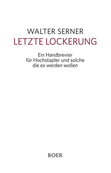 Walter Serner (1889 ca. 1942), als Walter Eduard Seligmann im böhmischen Karlsbad geboren, studierte Jura in Wien, ehe er 1912 nach Berlin ging. In den Kriegs- und Nachkriegsjahren zwischen Paris, Genf, Zürich und Italien pendelnd, war er der personifizierte Unruhegeist des Dada-Zeitalters. In den Zwanzigerjahren tat er sich als Essayist, Literat und Aktionskünstler hervor, ab 1928 tritt er dann nicht mehr öffentlich in Erscheinung. Von den Nazis verfolgt, lebte er noch einige Monate im Prager Ghetto, ehe er nach Theresienstadt deportiert wurde und sich seine Spur schließlich in einem deutschen Vernichtungslager verliert.Anmerkungen: